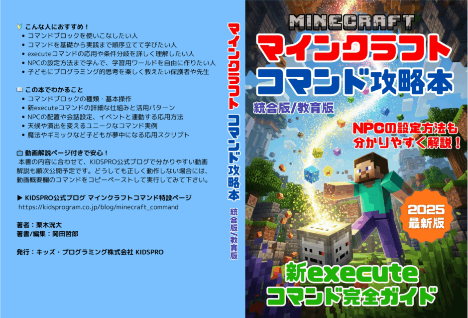 「KIDSPRO」が、実際の授業で使ってきたオリジナルコマンドセットに、コマンドブロックの基 本的な使い方とNPC設定方法を新たに加筆した 書籍です。この一冊で、コマンドを実践的に学びながら「繰り返し」「条件分岐」「変数」など、プログラミングで大切な考え方を自然に身につけられます。