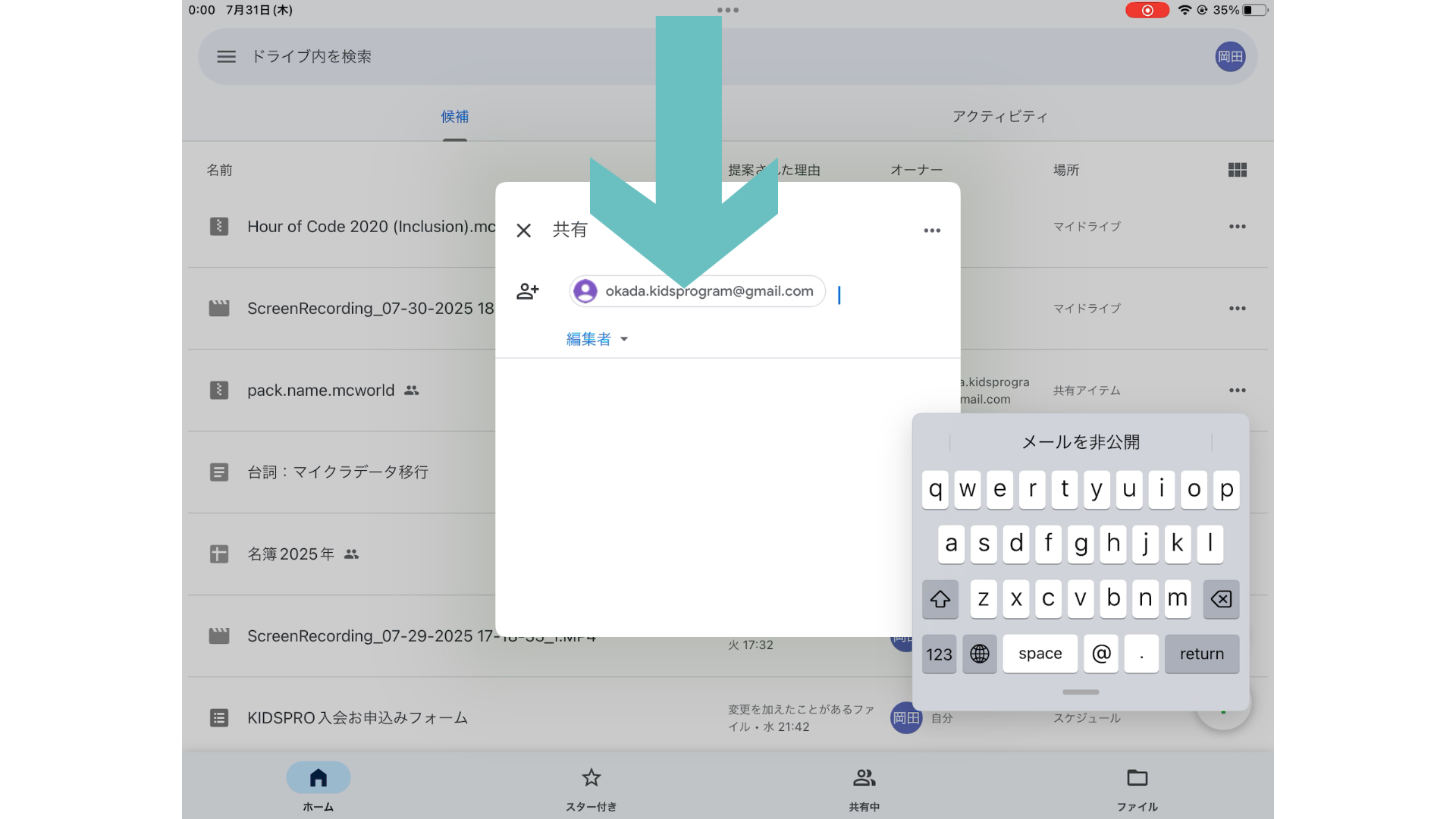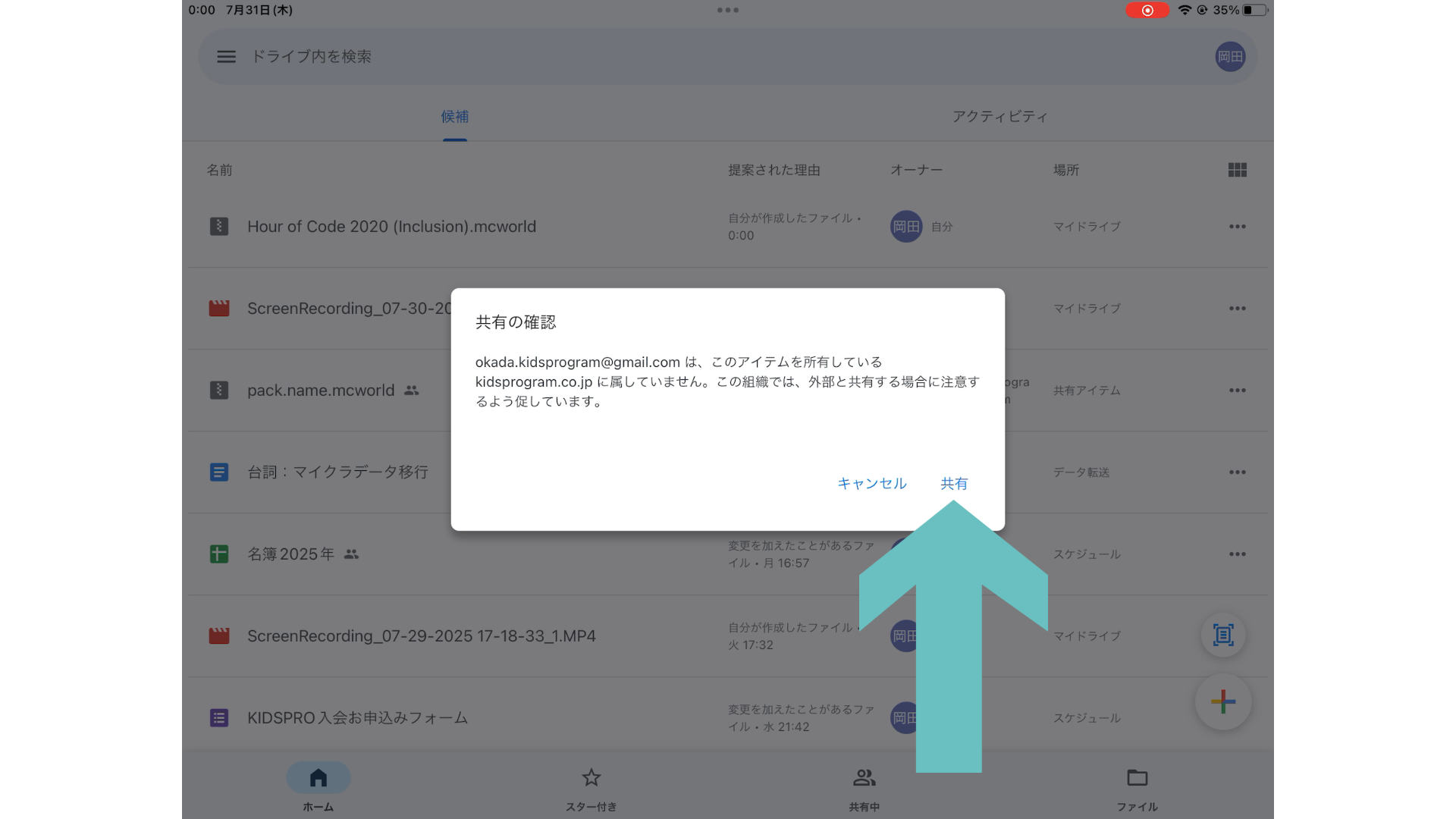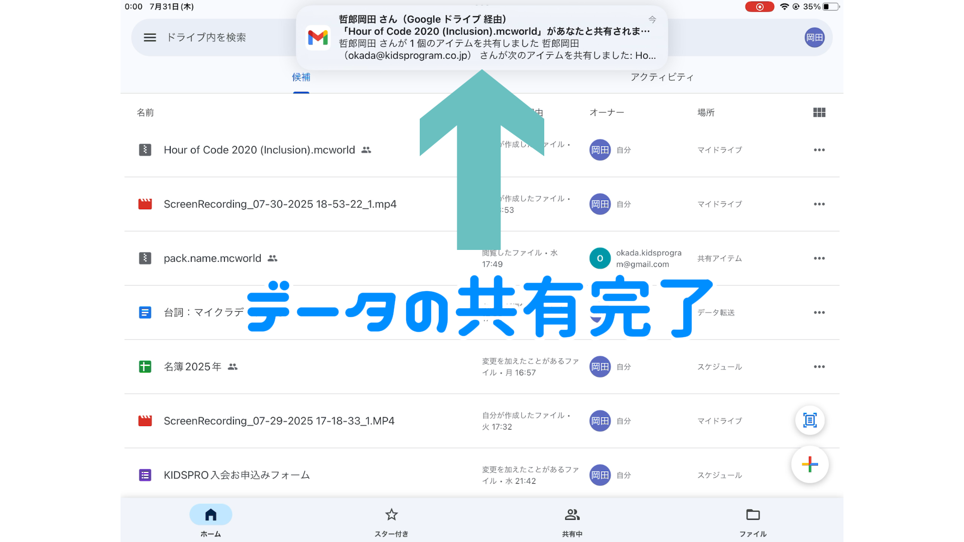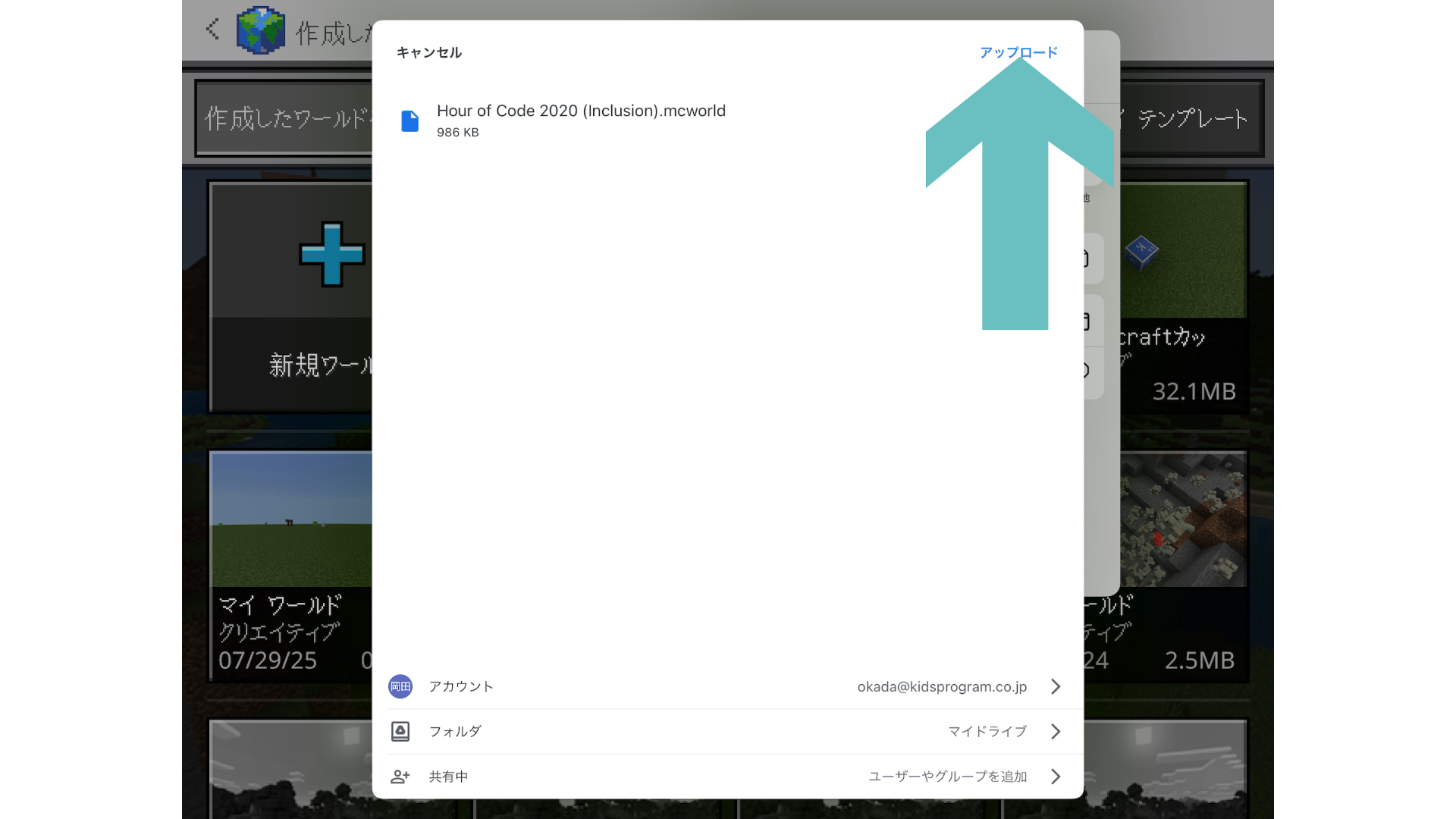 ※自分自身に転送する場合には、この共有の処理は必要ありません。PC側でGoogleドライブを開いて、対象のワールドデータをPCにダウンロードして下さい。