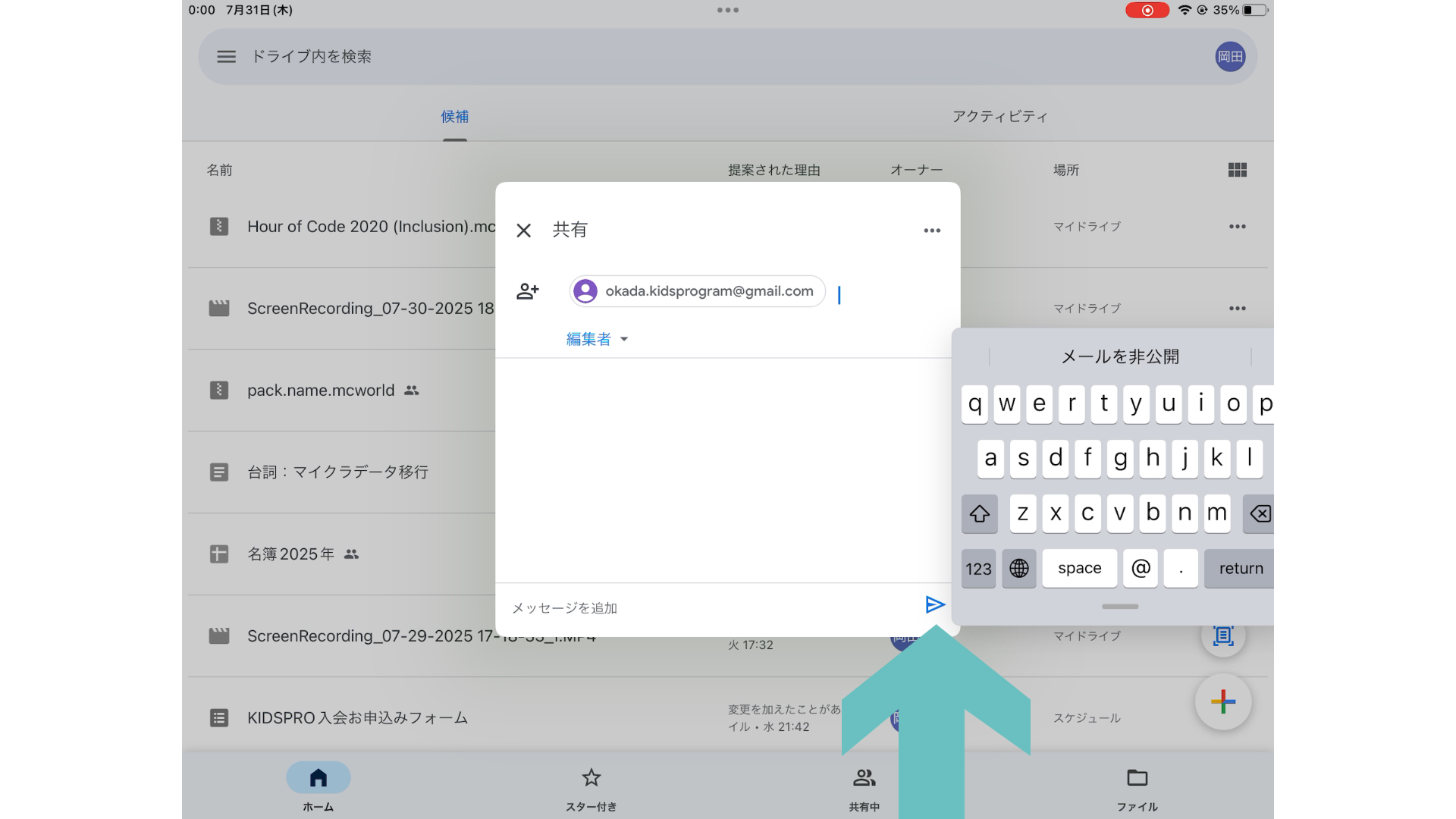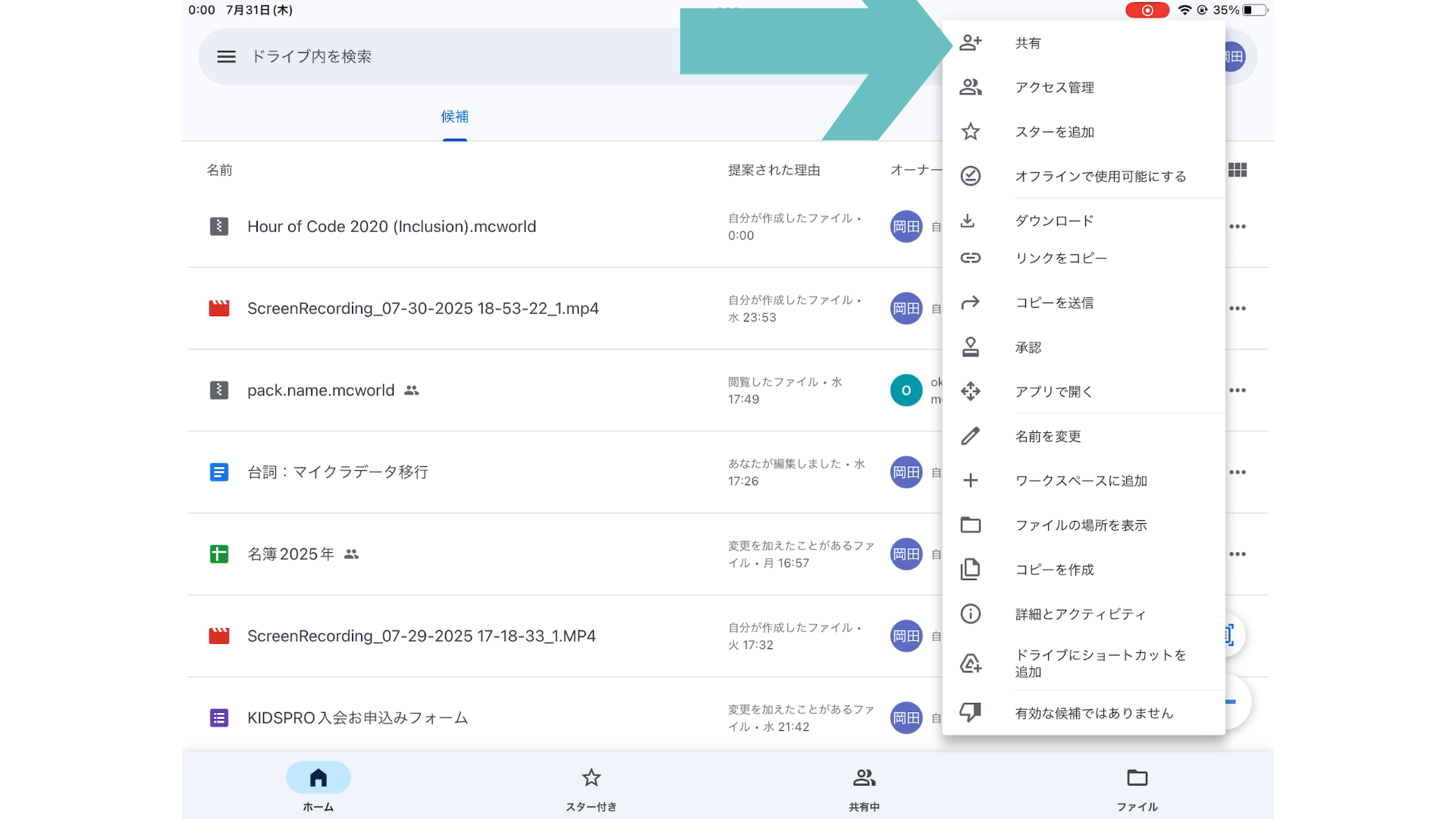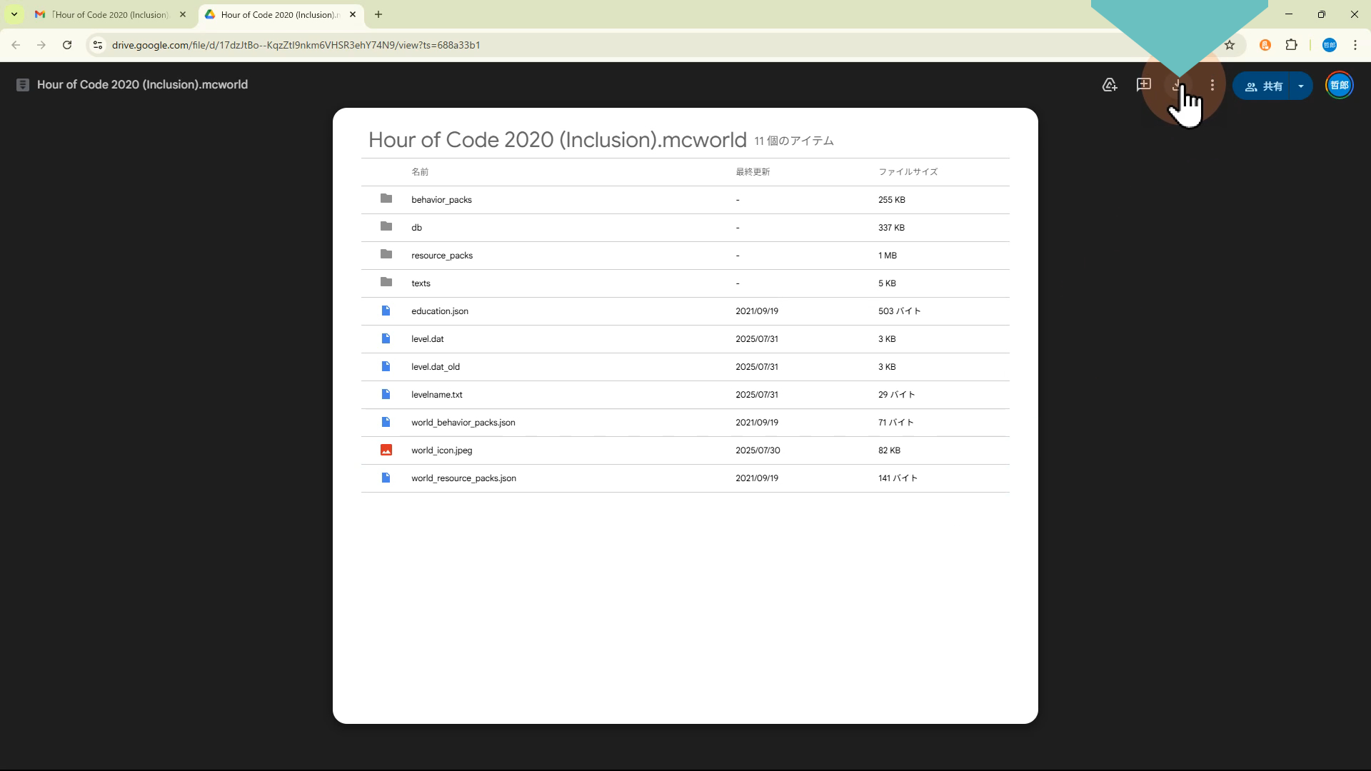 ※自分自身に転送する場合には、この共有の処理は必要ありません。PC側でGoogleドライブを開いて、対象のワールドデータをPCにダウンロードして下さい。