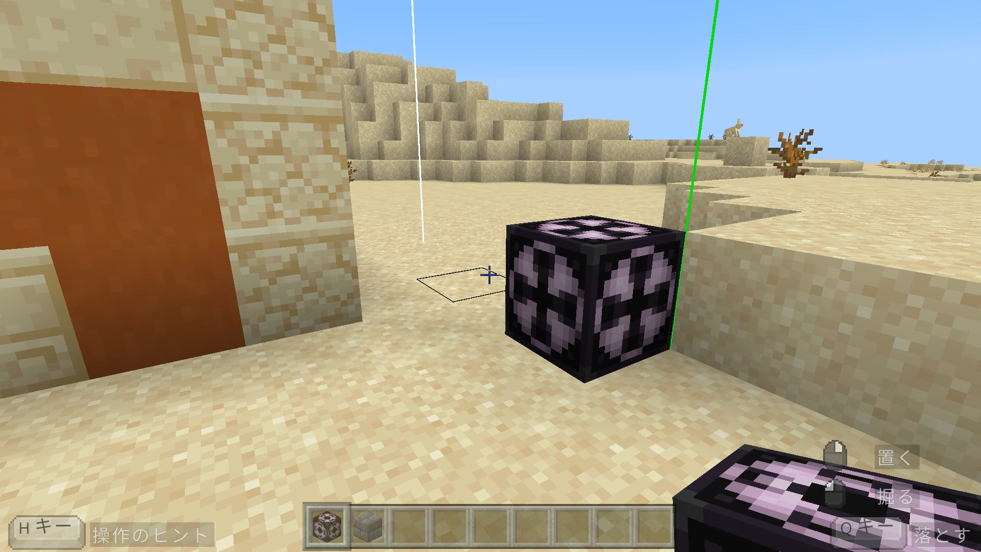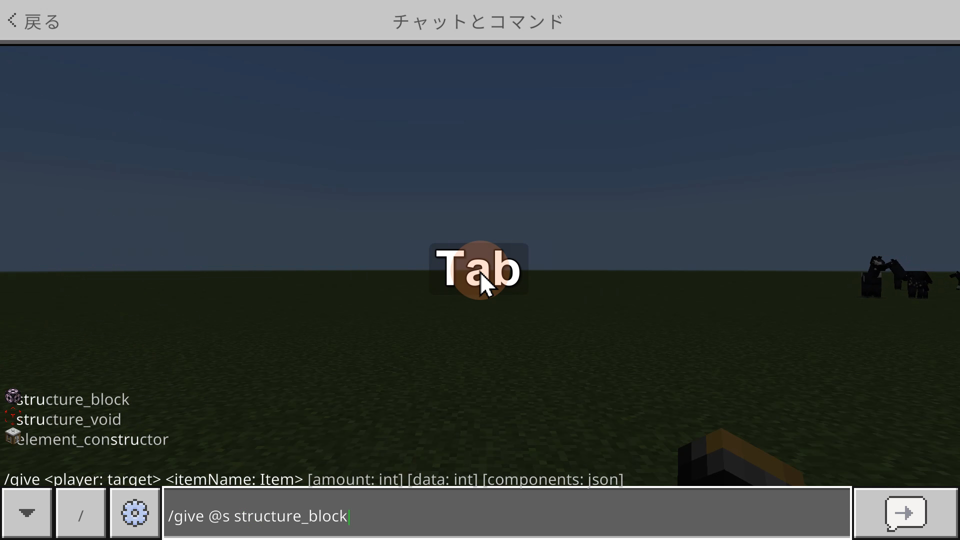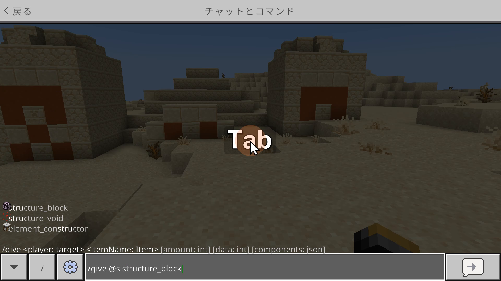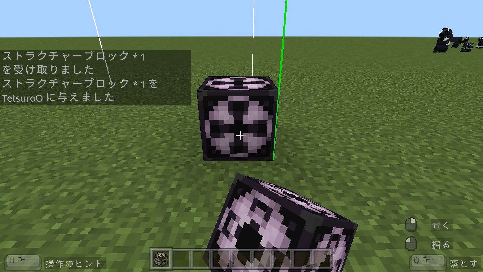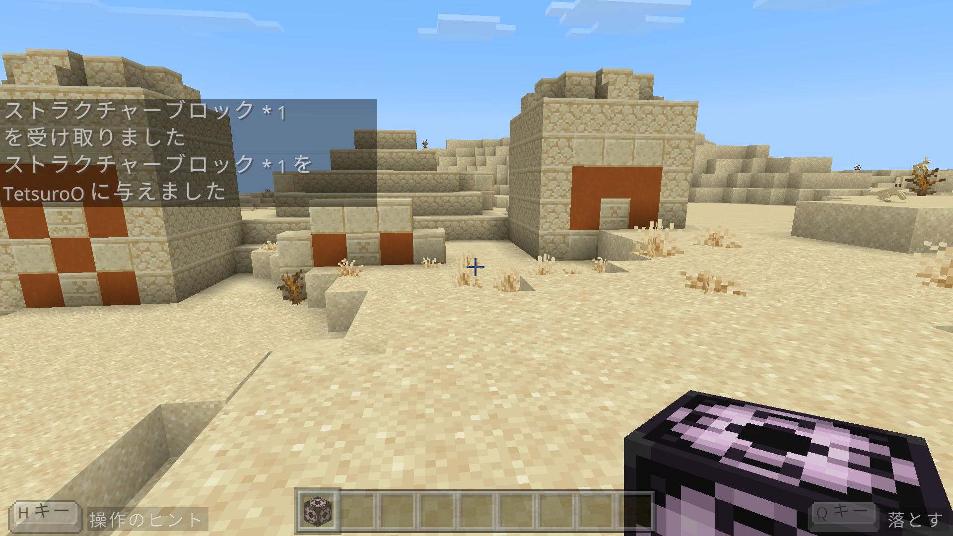 ※Tキーを押してチャットウィンドウを開き、「/give @s structure_block」というコマンドを入力して、ストラクチャーブロックを入手して下さい。