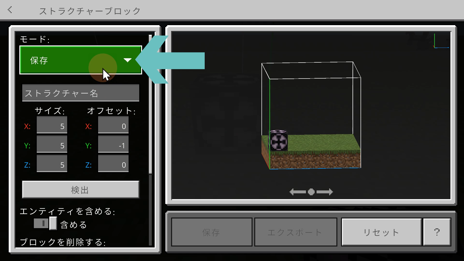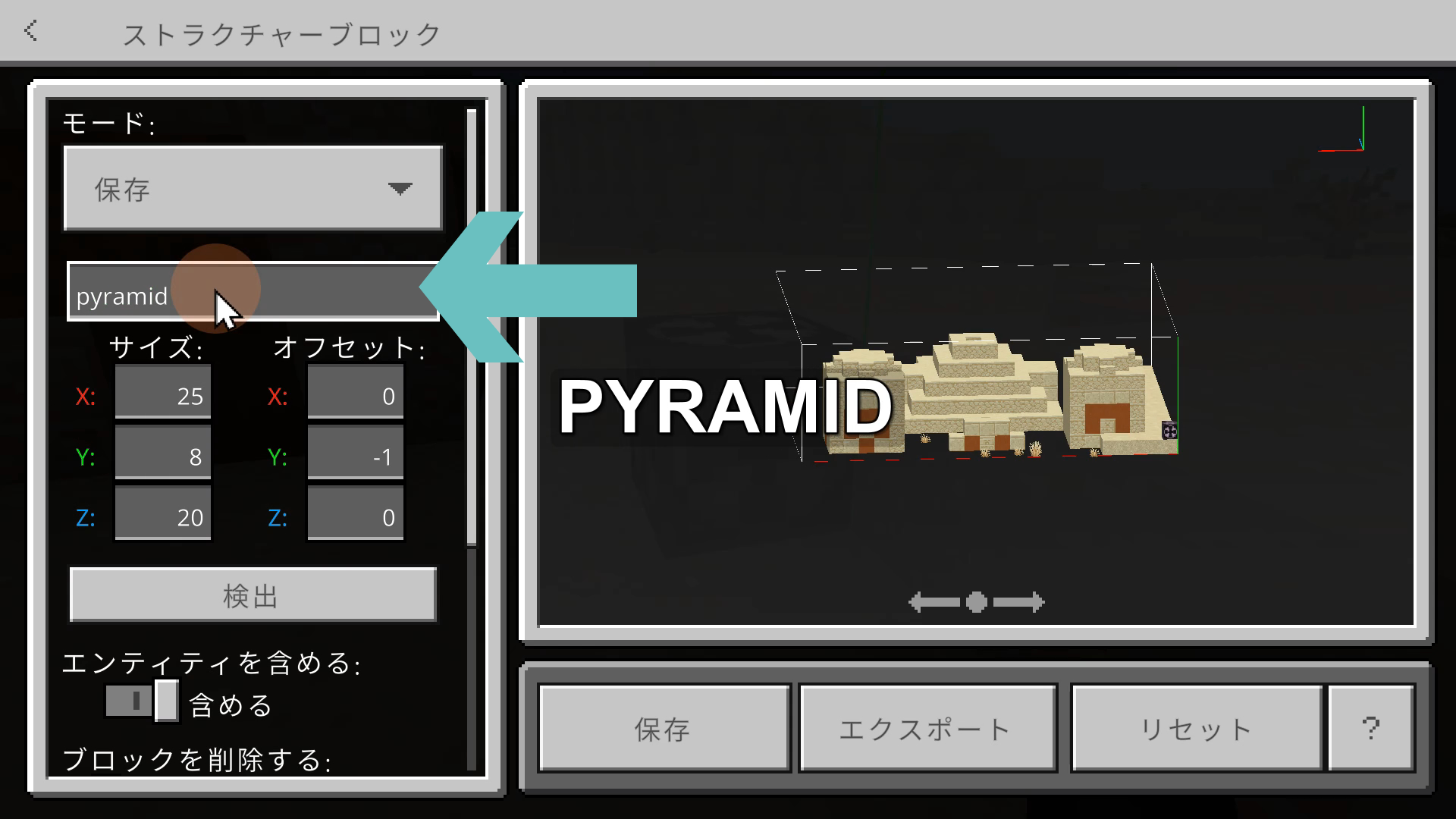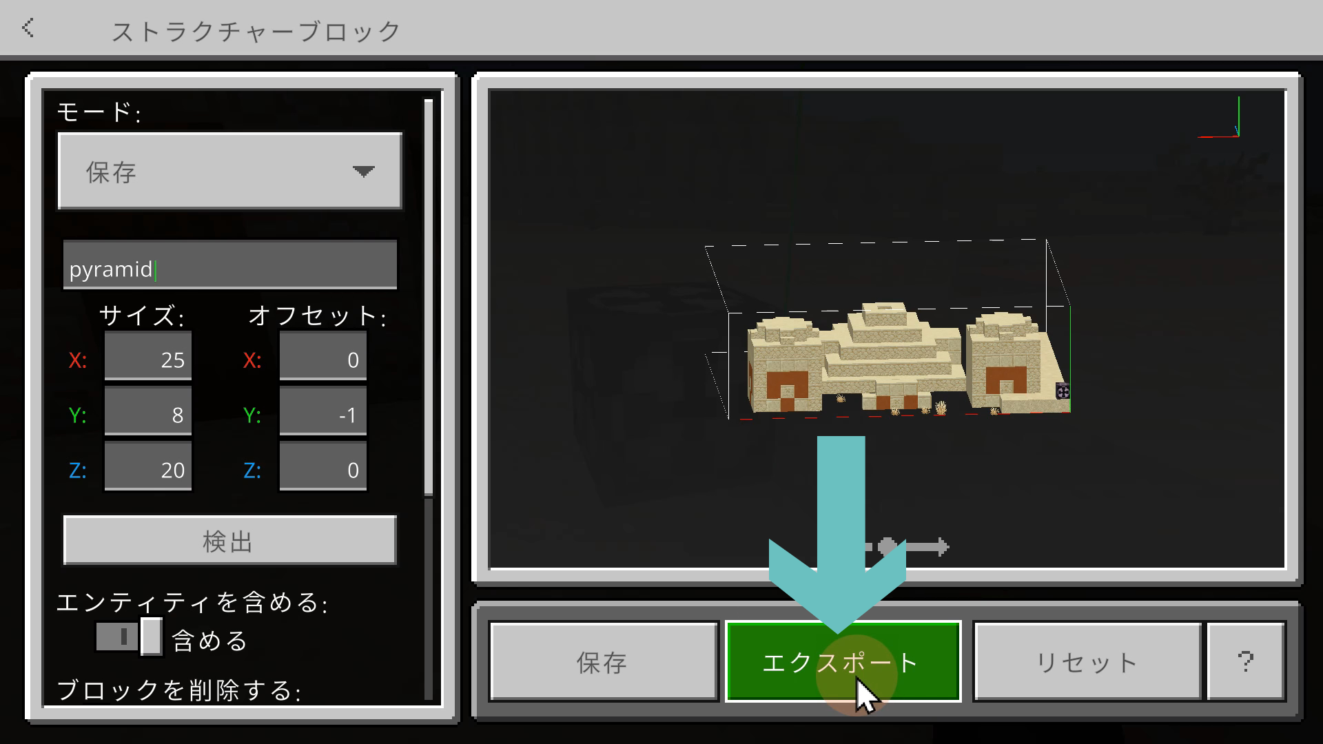 ストラクチャーブロックをエクスポートしたい建造物の近くに設置