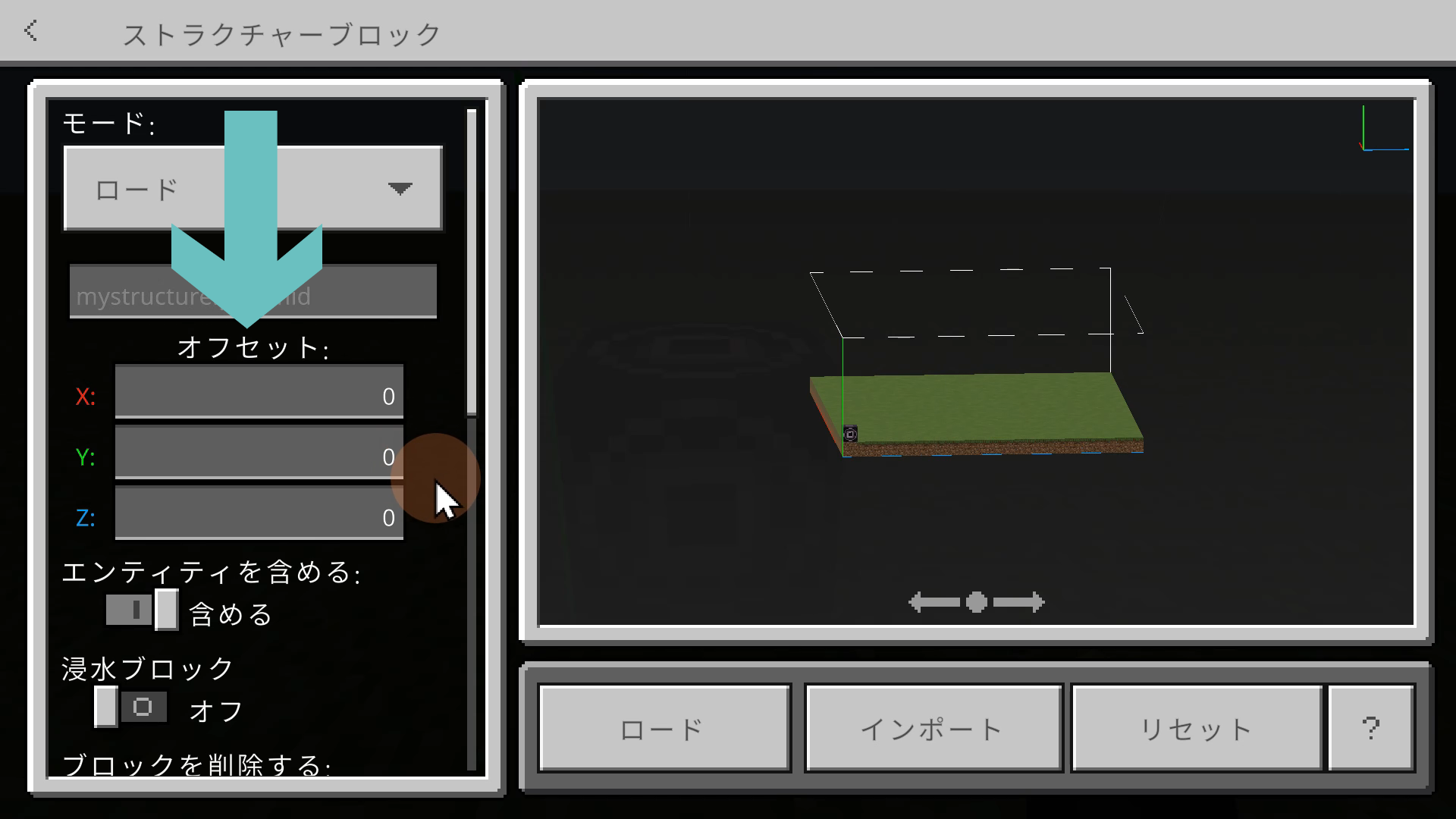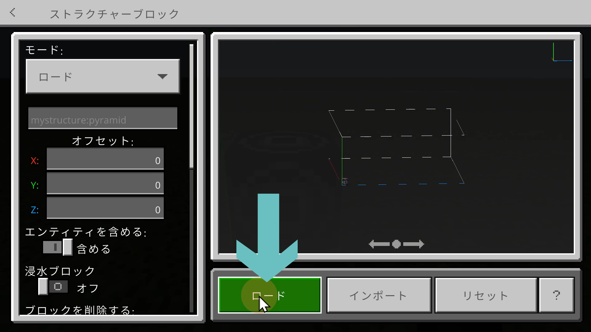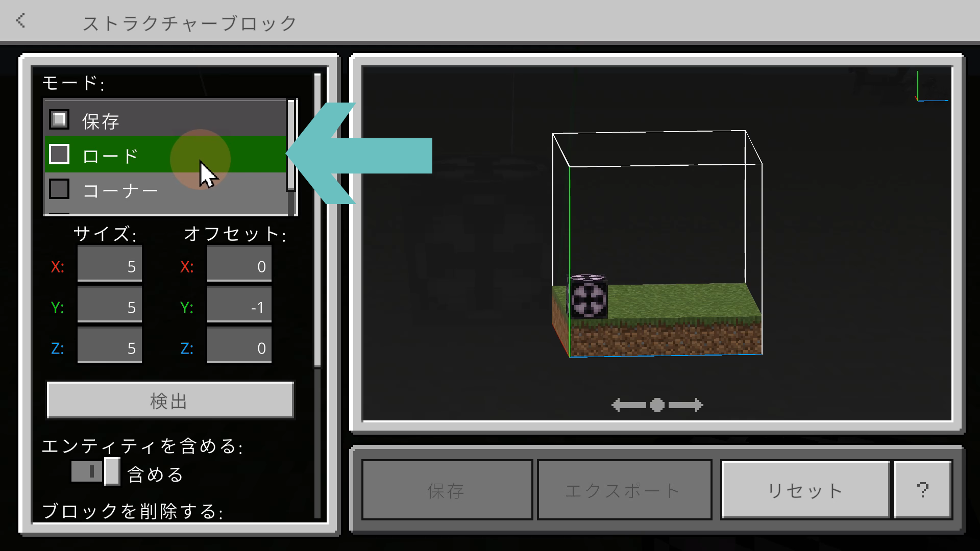 /give @s structure_block から「エクスポート」「インポート」「ロード」について詳しく解説しております。