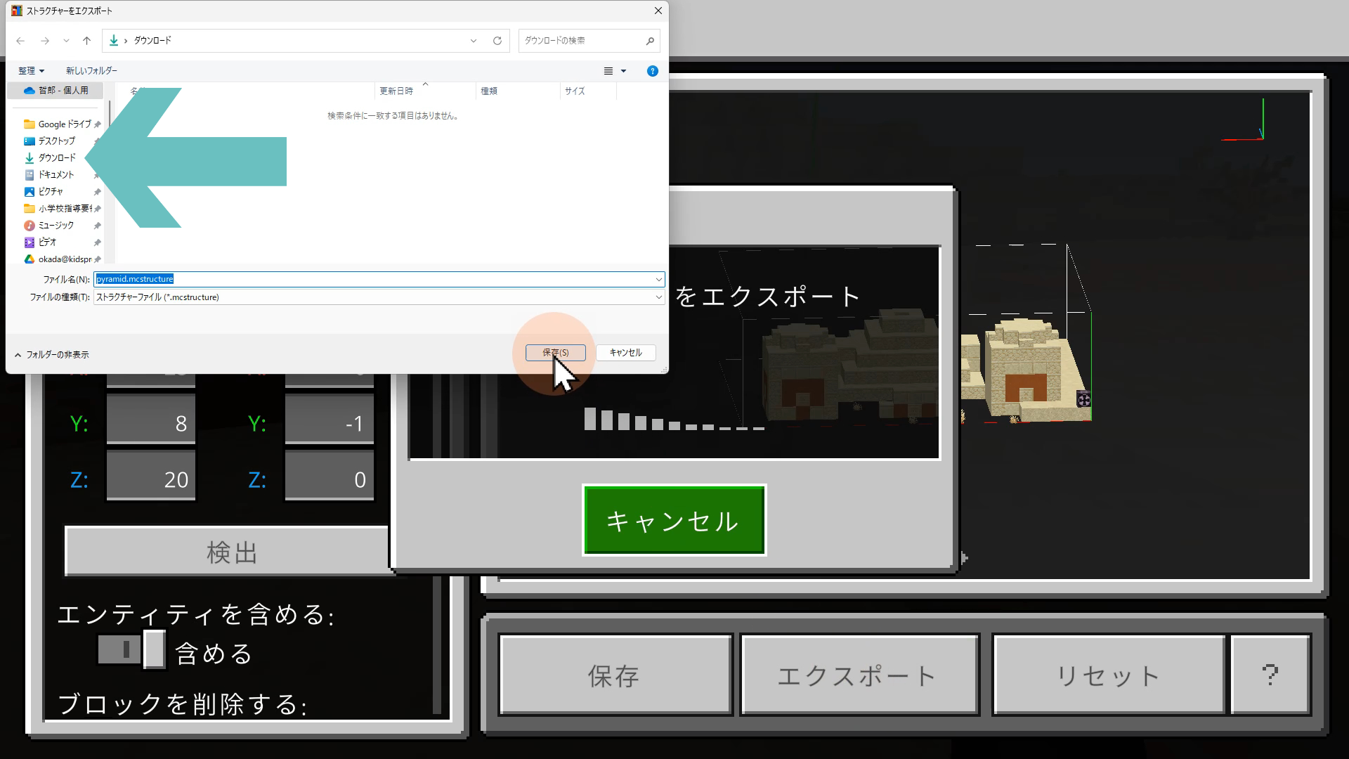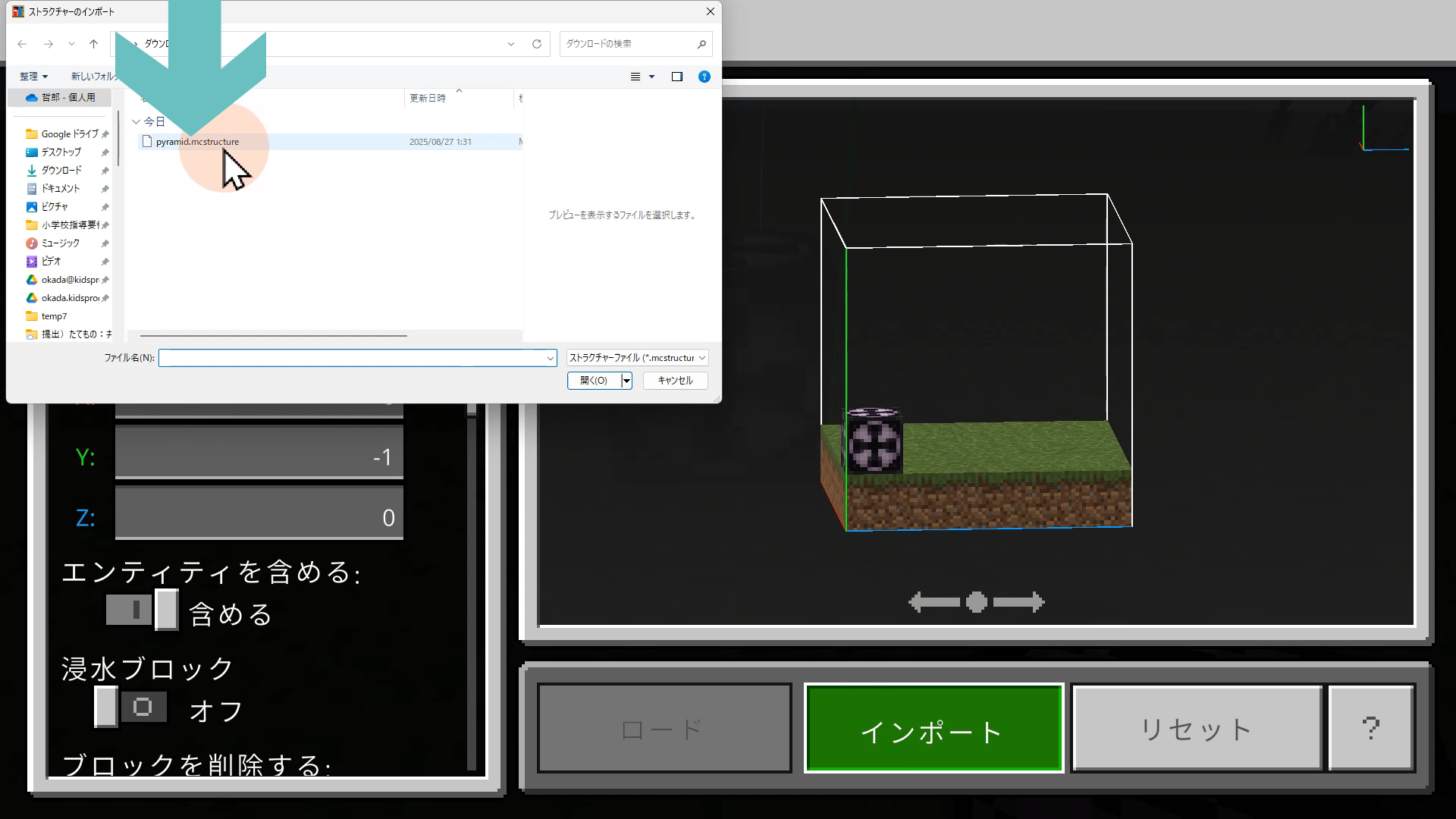 ※ここでは、「ダウンロード」フォルダに保存されていた「pyramid..mcstructure」を選択し、「開く」ボタンをクリックしています。