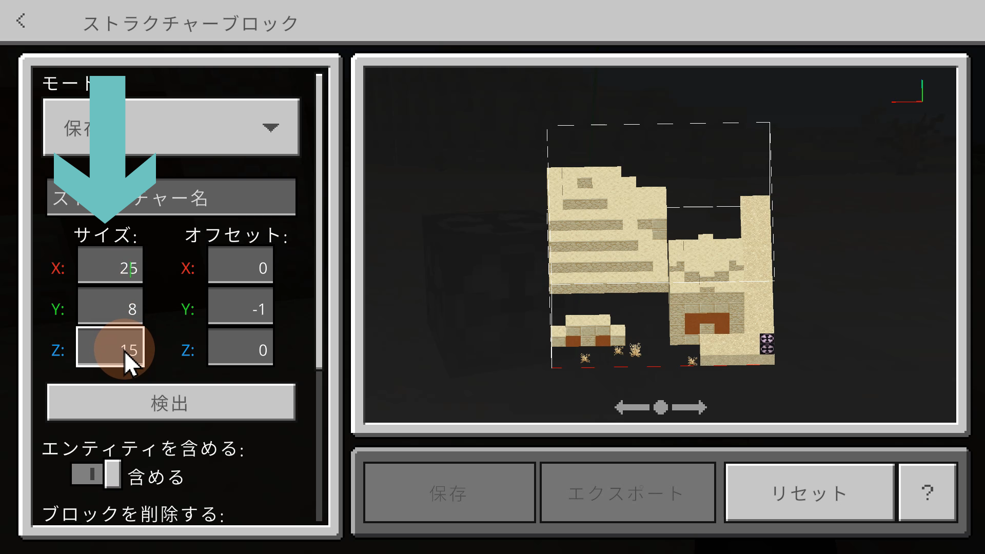 ※エクポートしたい建造物が対象範囲内になるよう、X: Y: Z:の値を変更してください。右側のディスプレイ画面を見ながら調整できます。