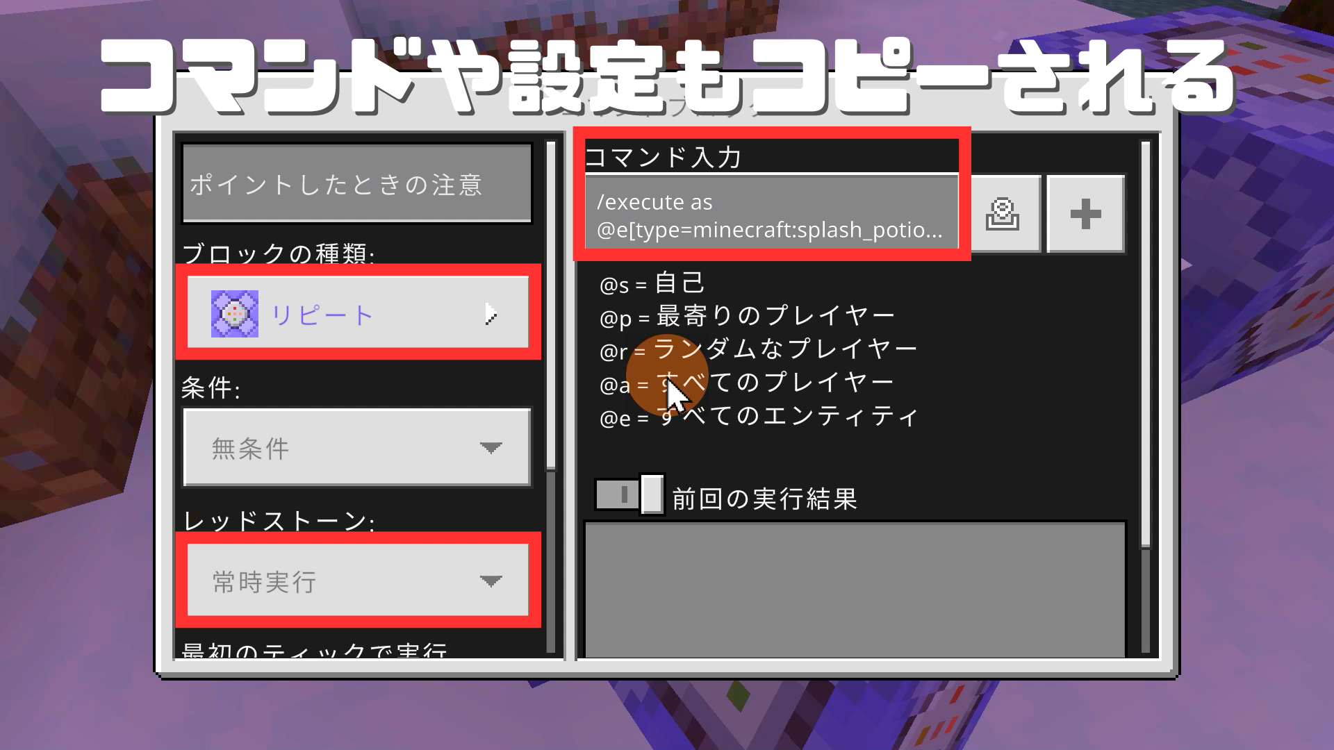 ④入力済みのコマンドやブロックの種類(しゅるい)などの設定(せってい)もコピーされる