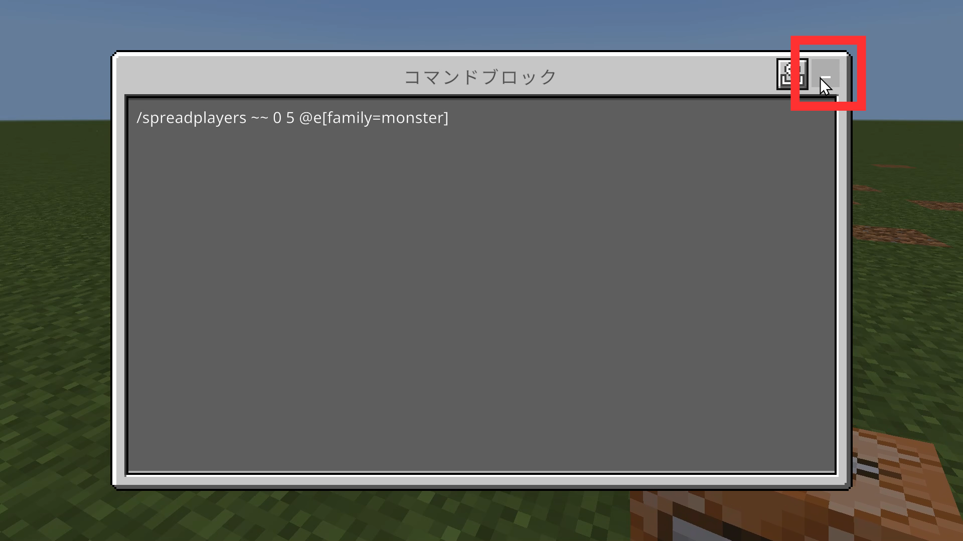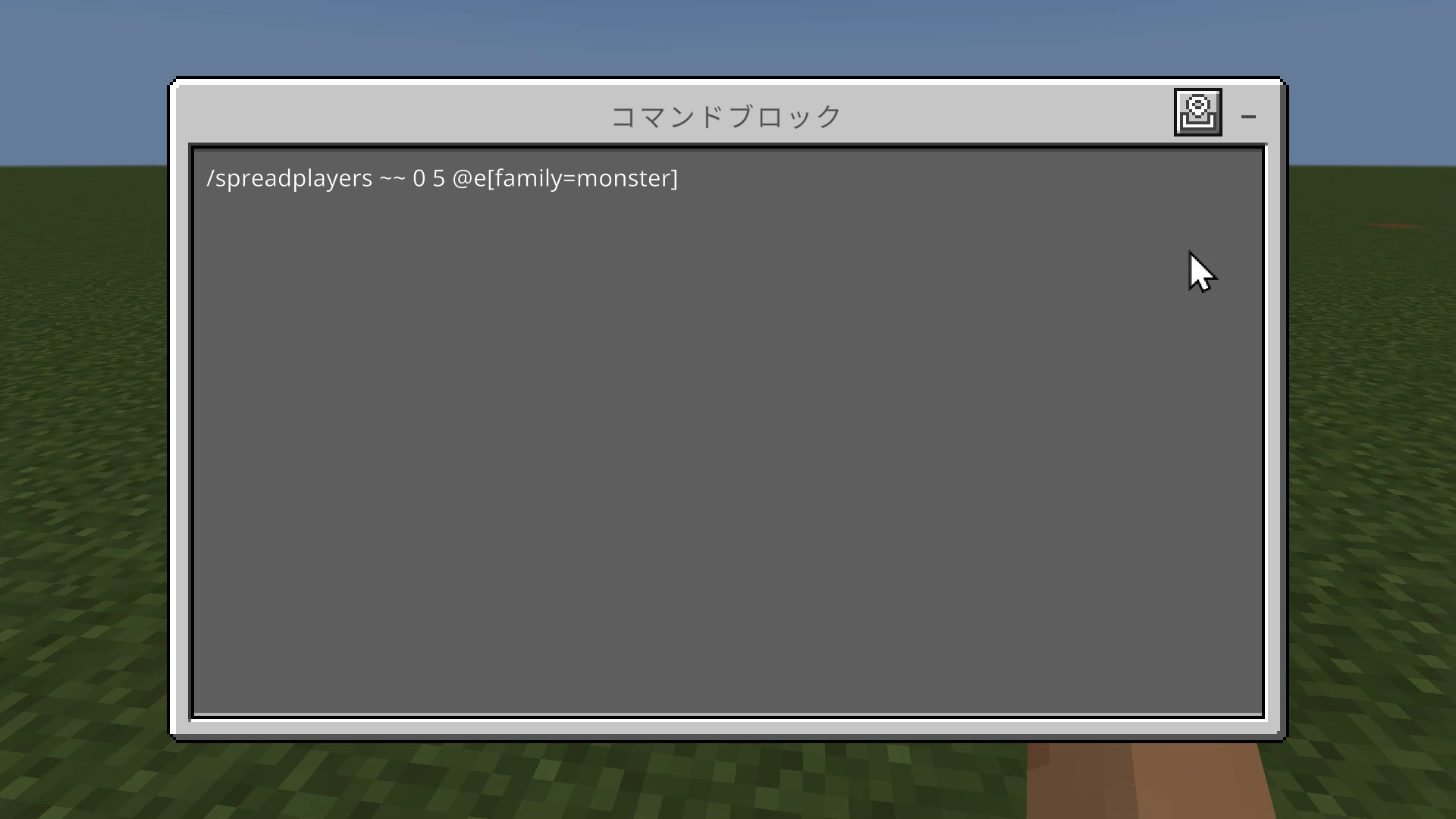 (コマンドブロックの位置(いち)を中心にして、周りにいるモンスターを最大5ブロックの範囲(はんい)にランダムにテレポートさせるコマンド)