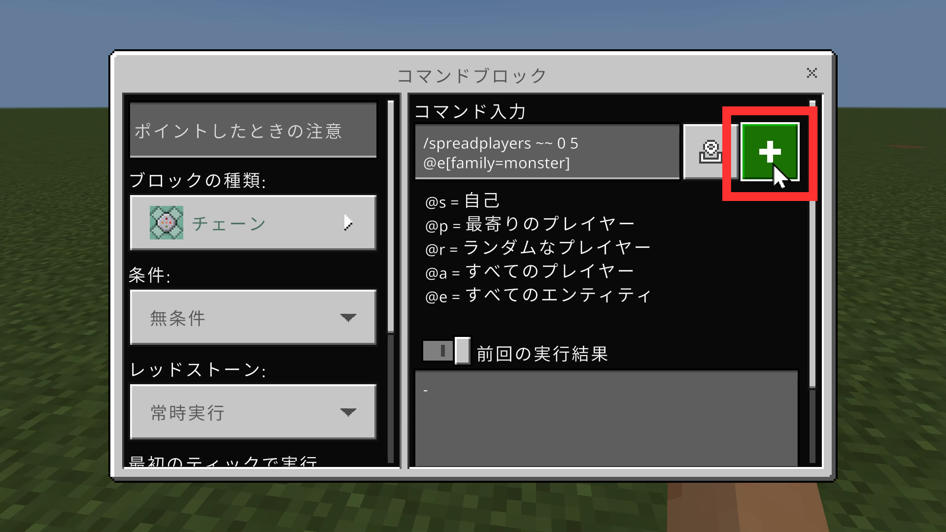 チェーン:連鎖(れんさ)のコマンドブロックは、「常時(じょうじ)実行(じっこう)」に設定(せってい)して、常にアクティブにしておくのが基本(きほん)です。「動力(どうりょく)が必要(ひつよう)」に設定(せってい)してしまうと、正しく(ただしく)動かないことがあるので注意(ちゅうい)してください。