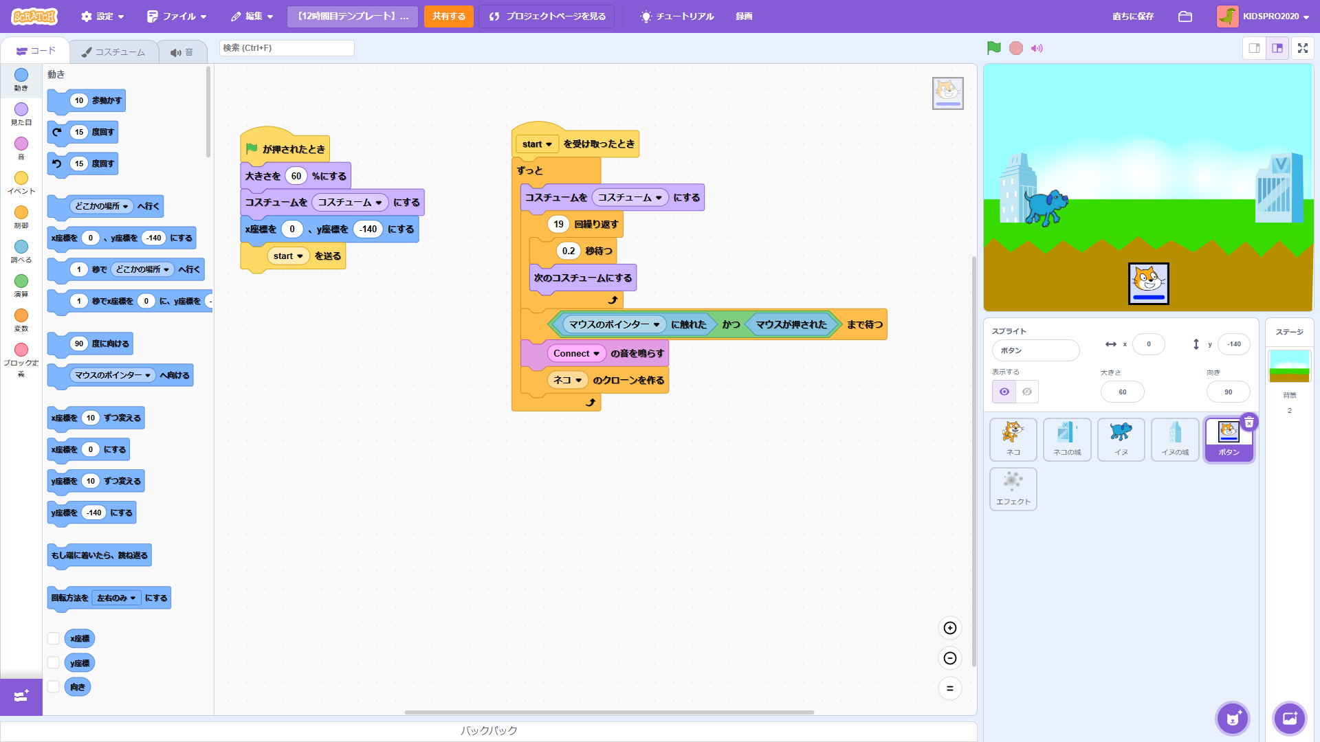 ※学習用のScratchテンプレート(スクリプトが未完成)は、https://scratch.mit.edu/projects/1120853697/を利用してください。