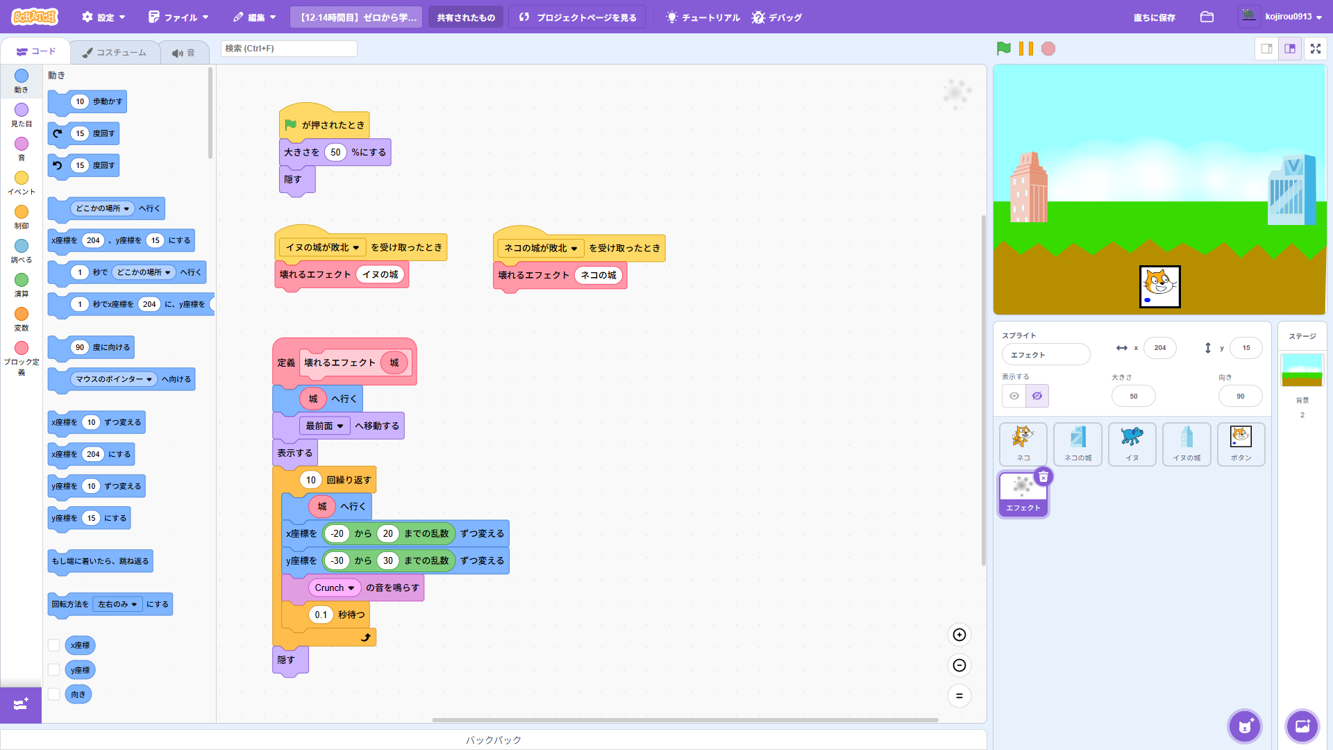 ゼロから学ぼうScratch(スクラッチ)プログラミング14時間目をアップ!今回は「メッセージ機能」をフル活用して、城への攻撃や感動のフィナーレを演出するプログラムを学びます。