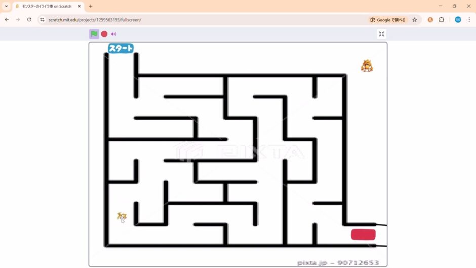 スタートボタンを押して、スペースキーを押すと始まります。矢印の方向に進むので、迷路のさくに当たらないように、気を付けてゴールまでたどり着いてください。