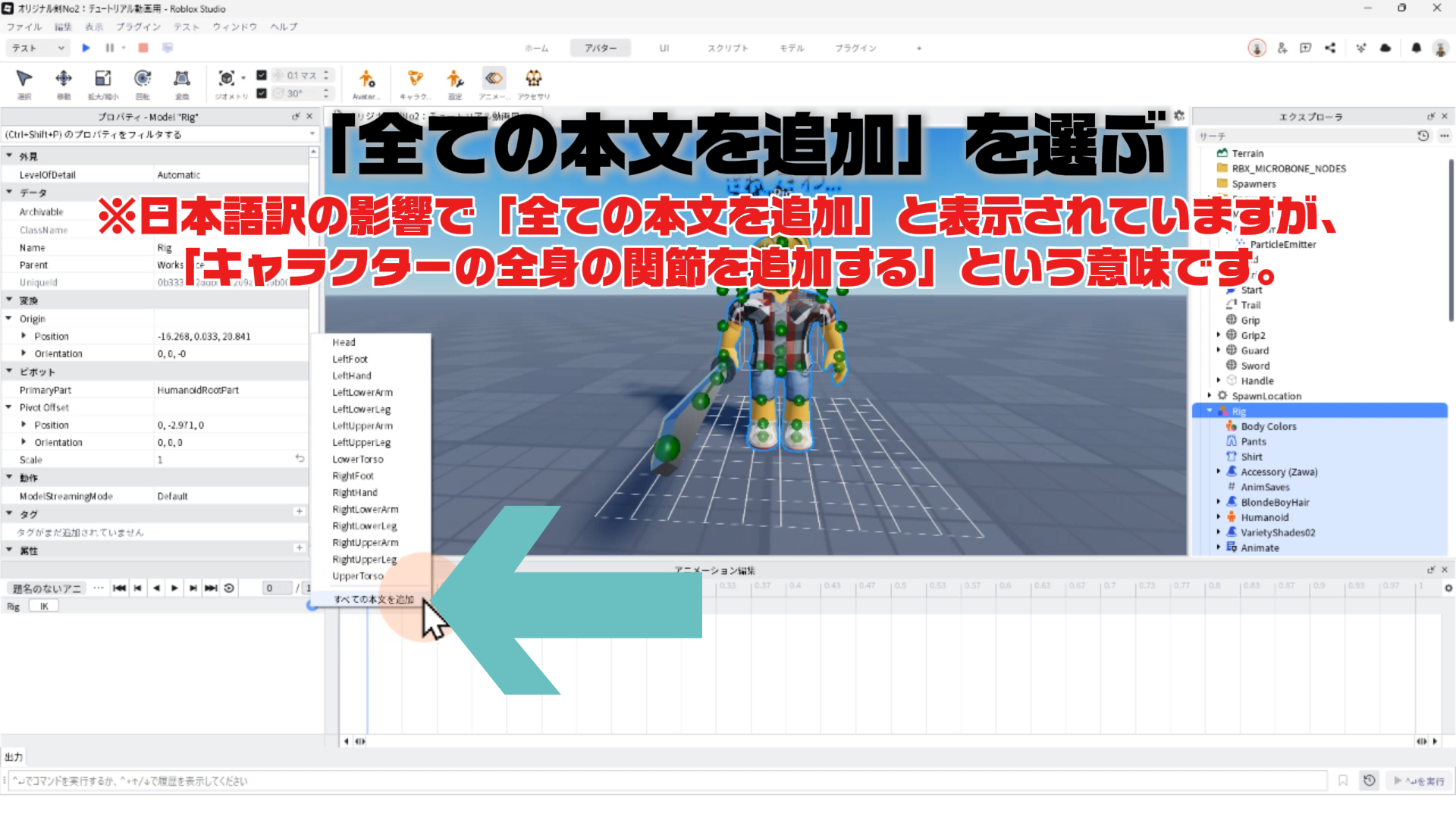 ※日本語訳の影響で「全ての本文を追加(Add All Body)」と表示されていますが、これは「キャラクターの全身の関節を追加する」という意味です。