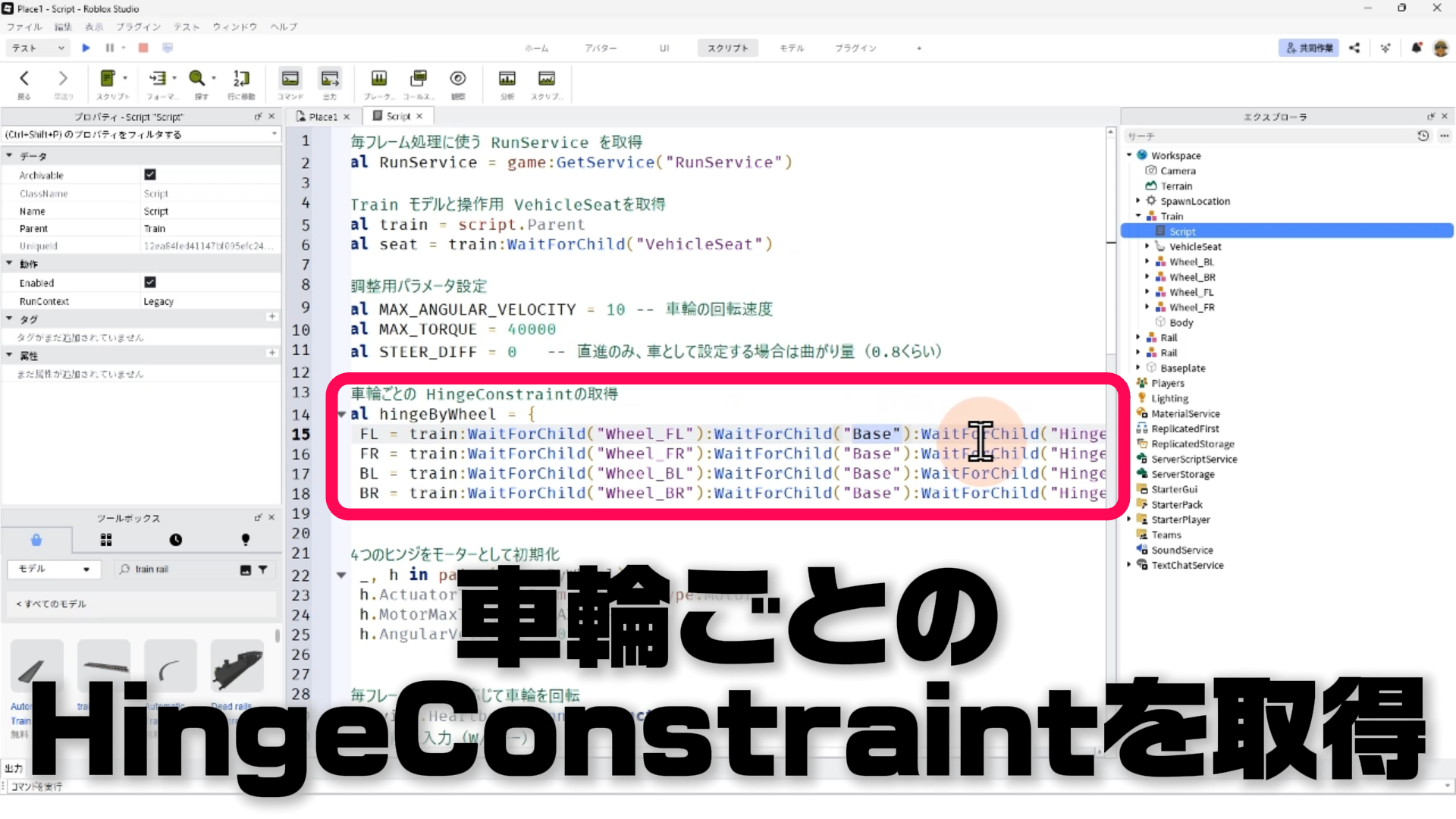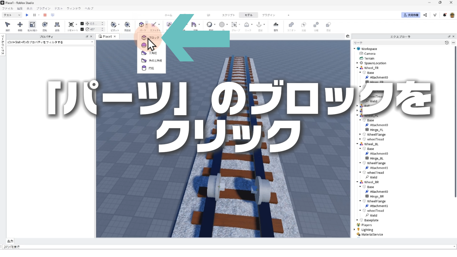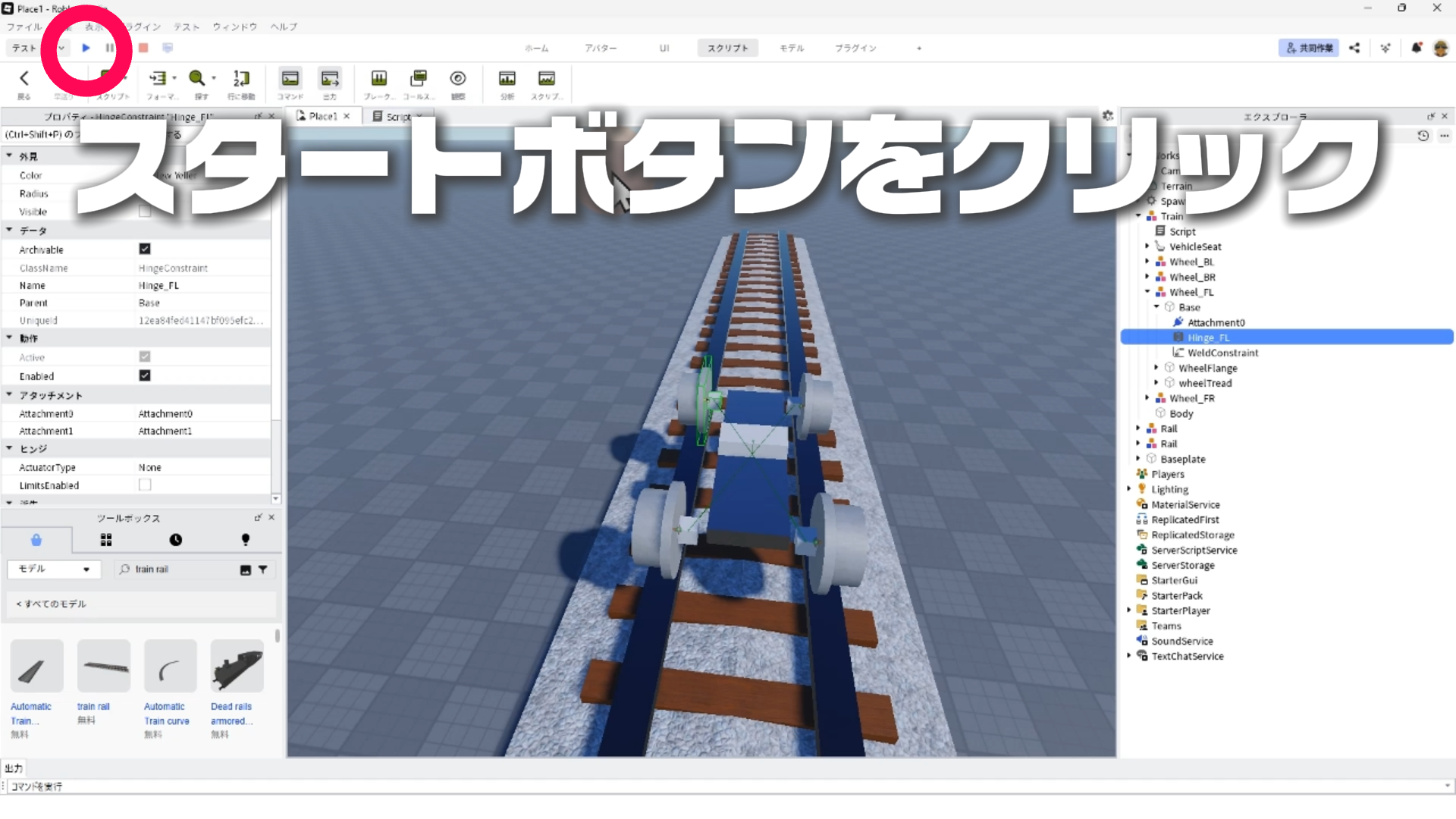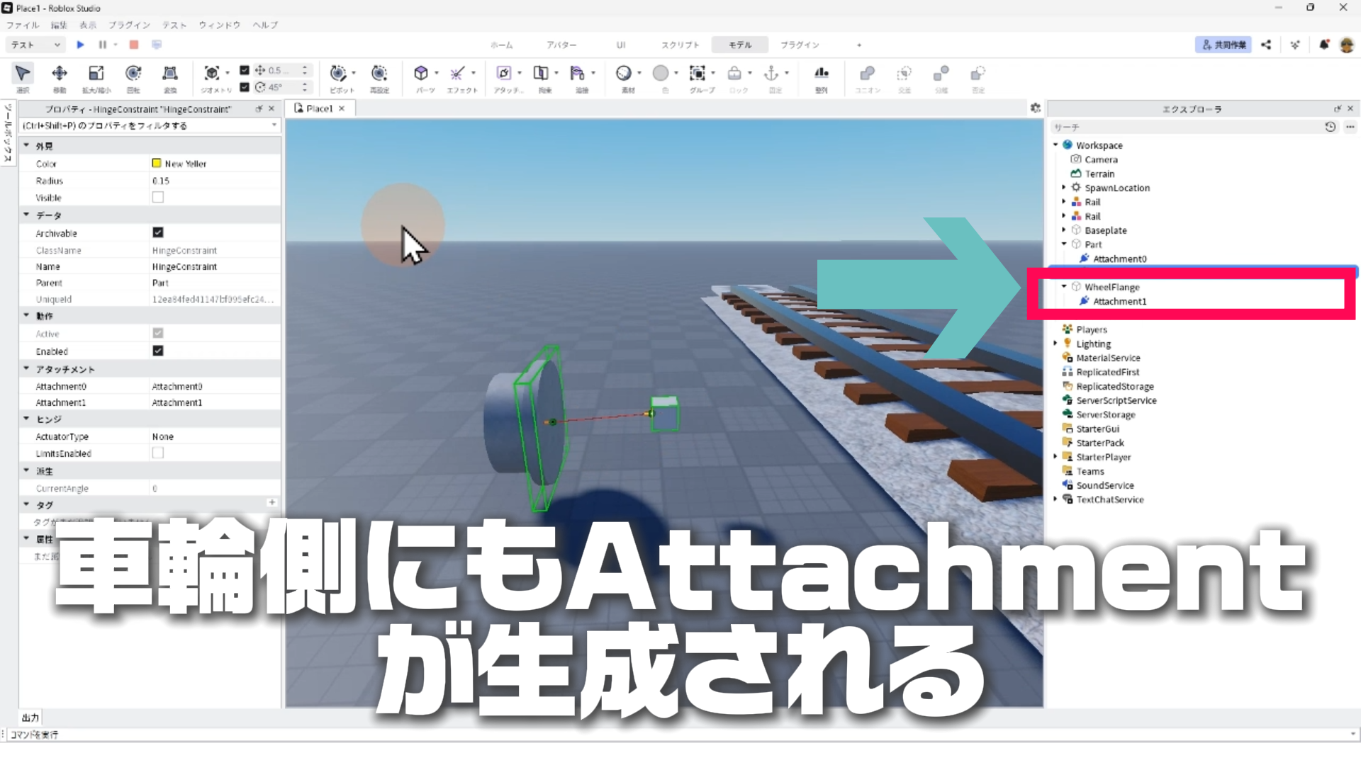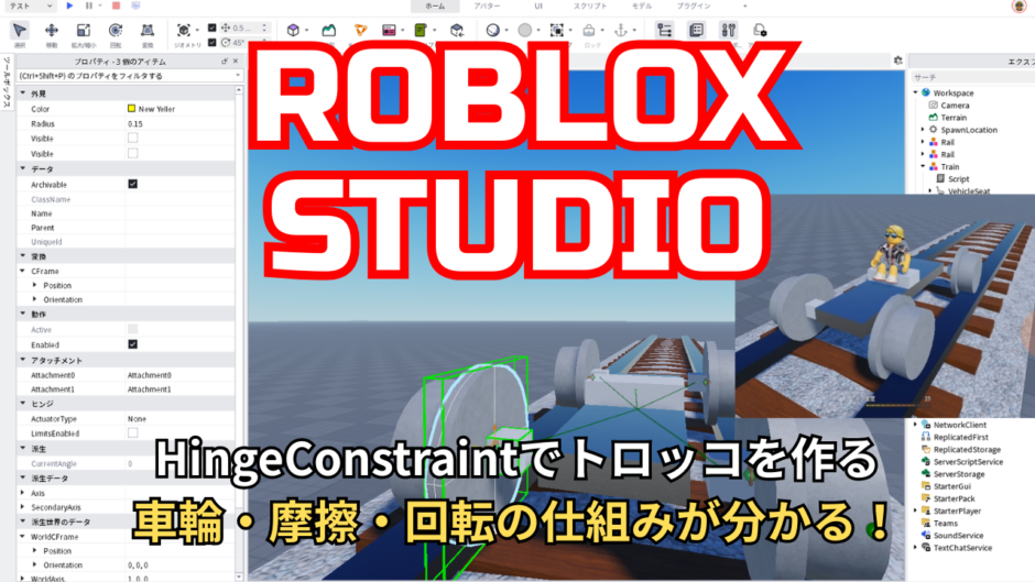 Roblox Studioでヒンジコンストレイント(HingeConstraint)を使い、車輪が回転してレールの上を前後に走るトロッコを制作します。