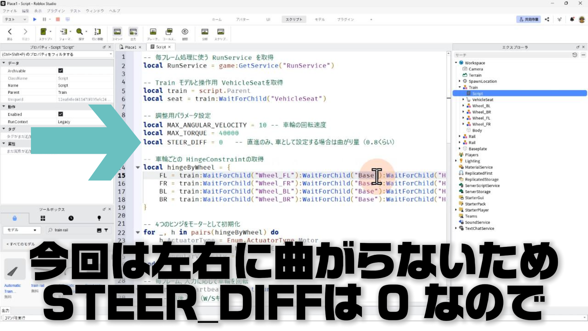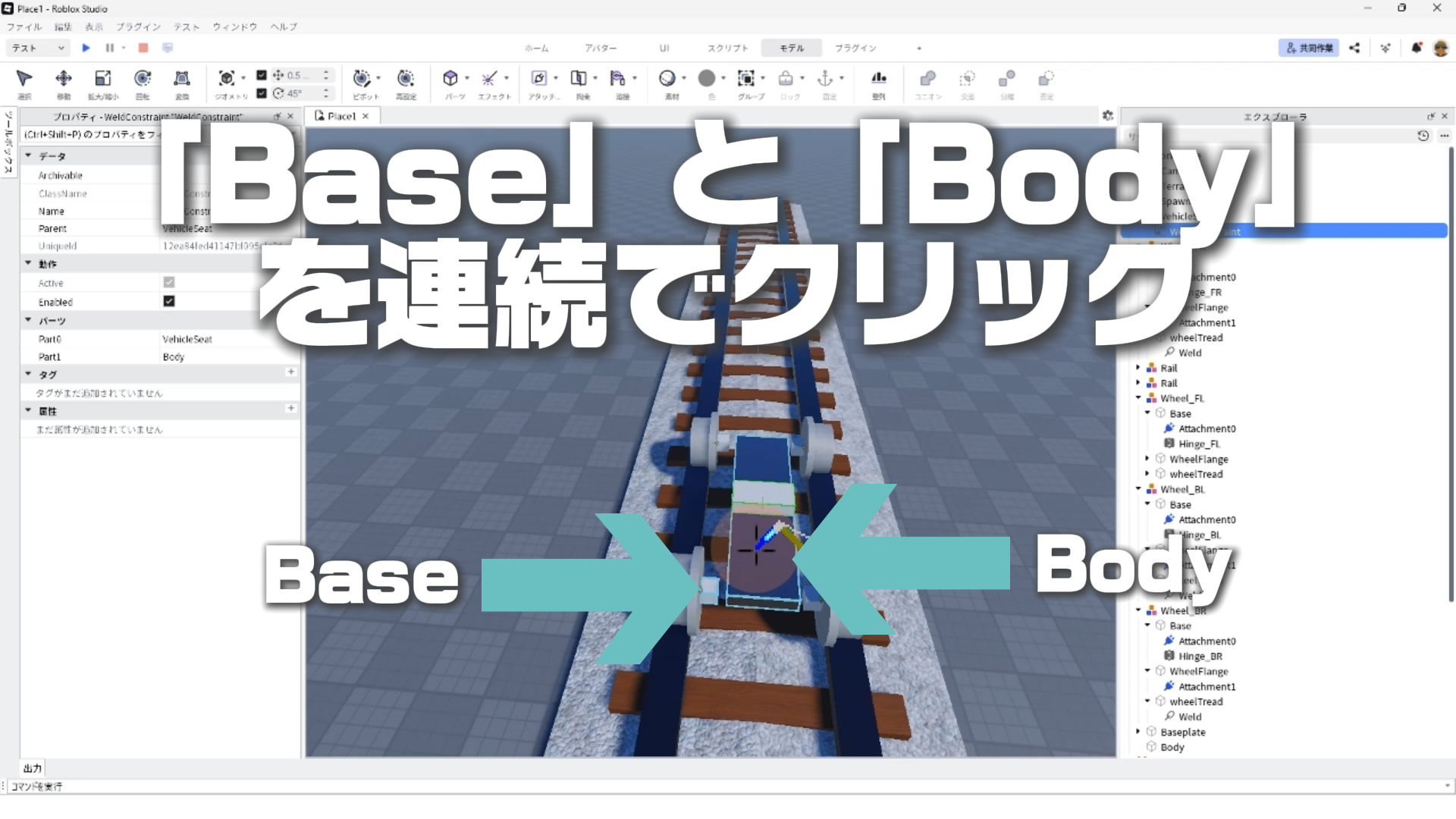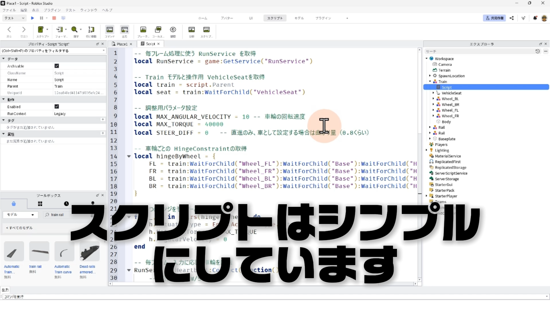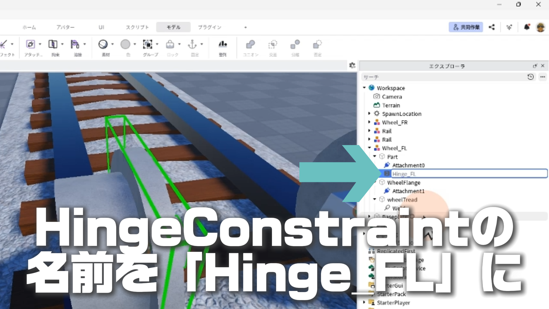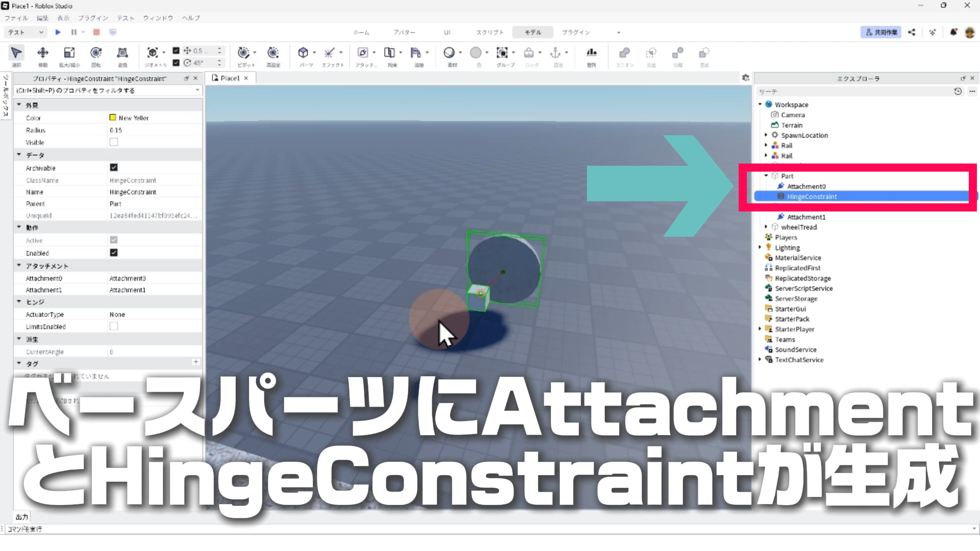 Roblox Studioでヒンジコンストレイント(HingeConstraint)を使い、車輪が回転してレールの上を前後に走るトロッコを制作します。