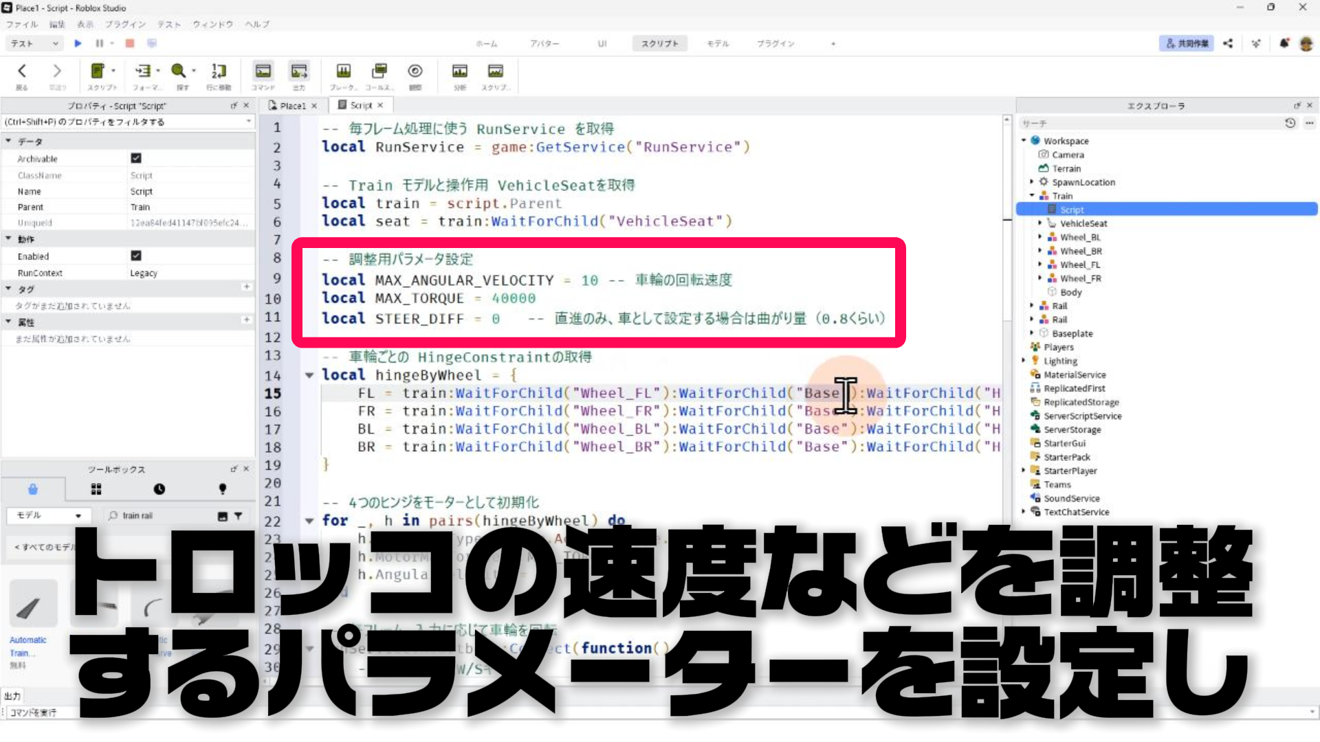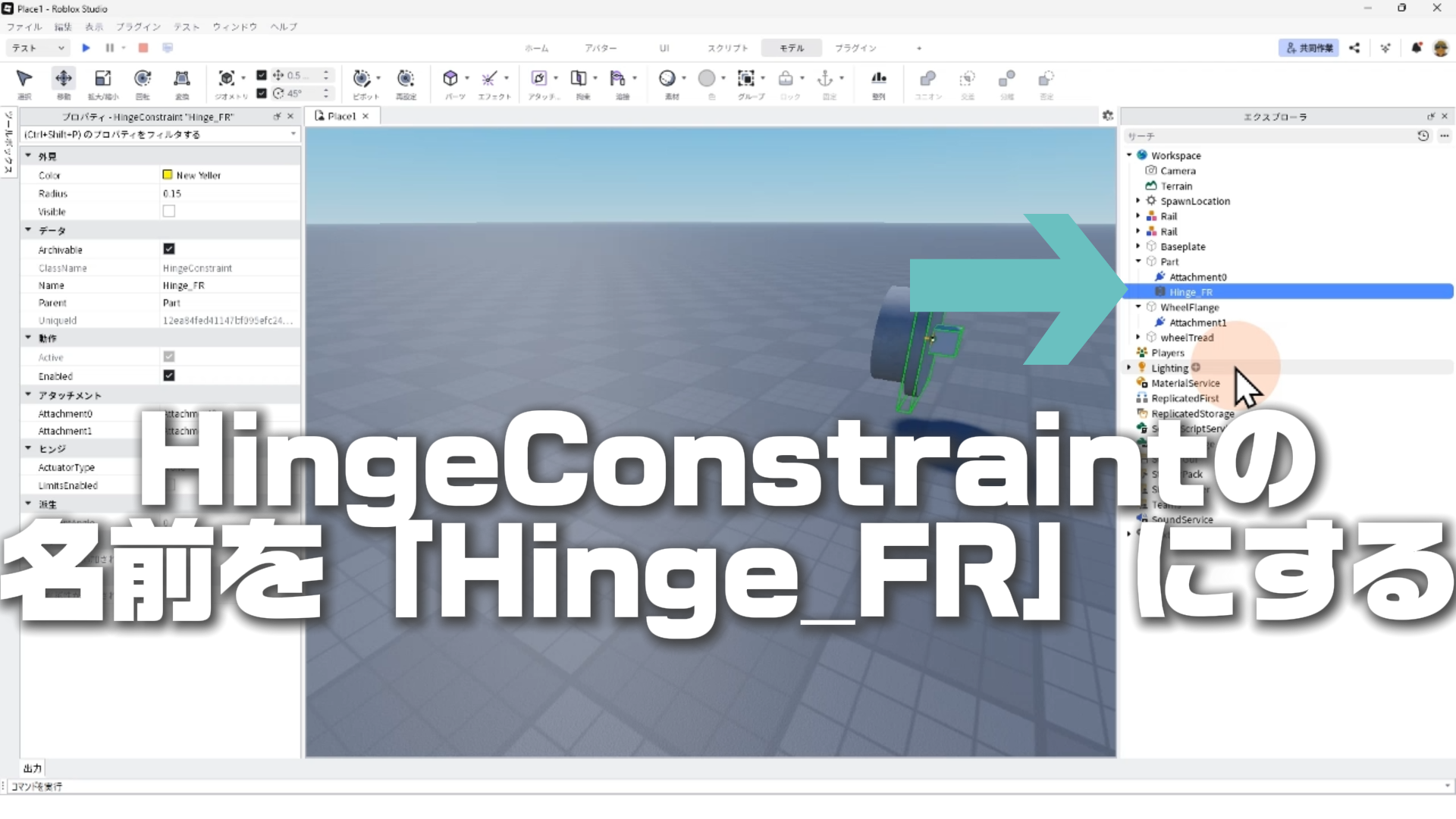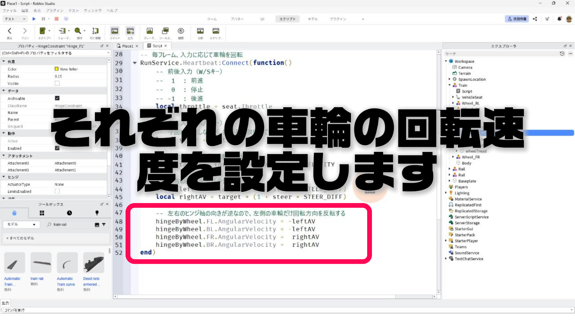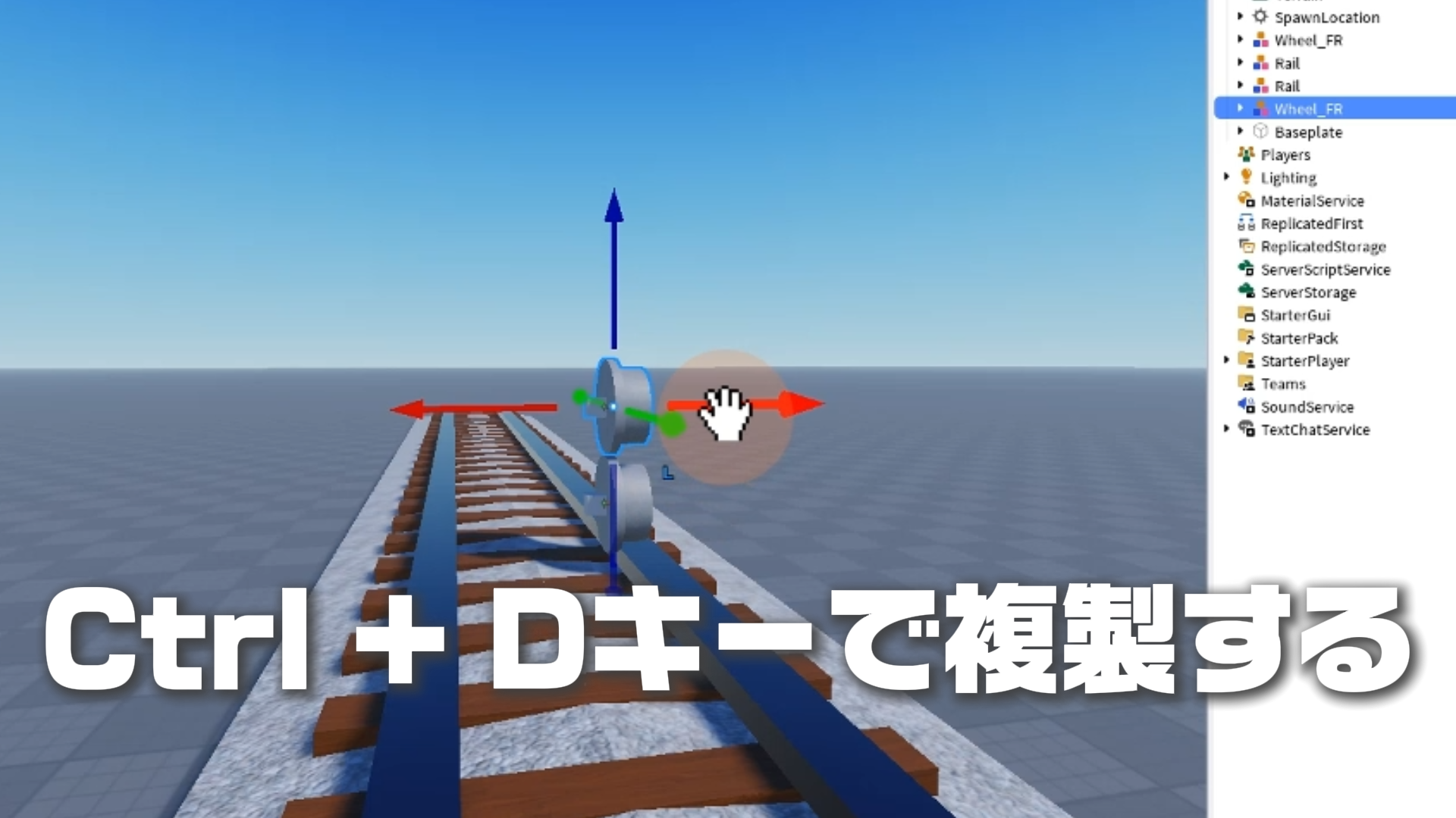 Roblox Studioでヒンジコンストレイント(HingeConstraint)を使い、車輪が回転してレールの上を前後に走るトロッコを制作します。