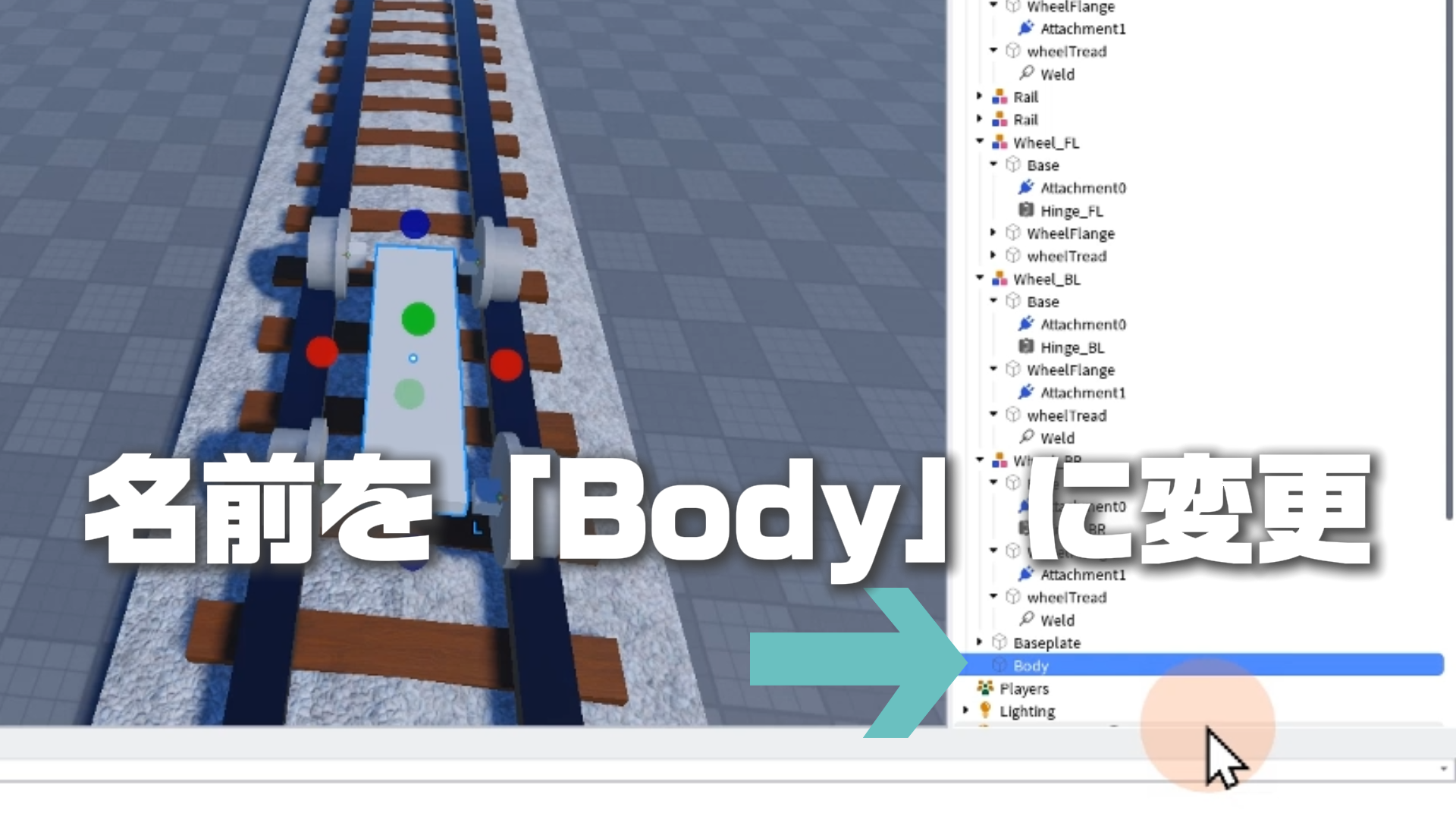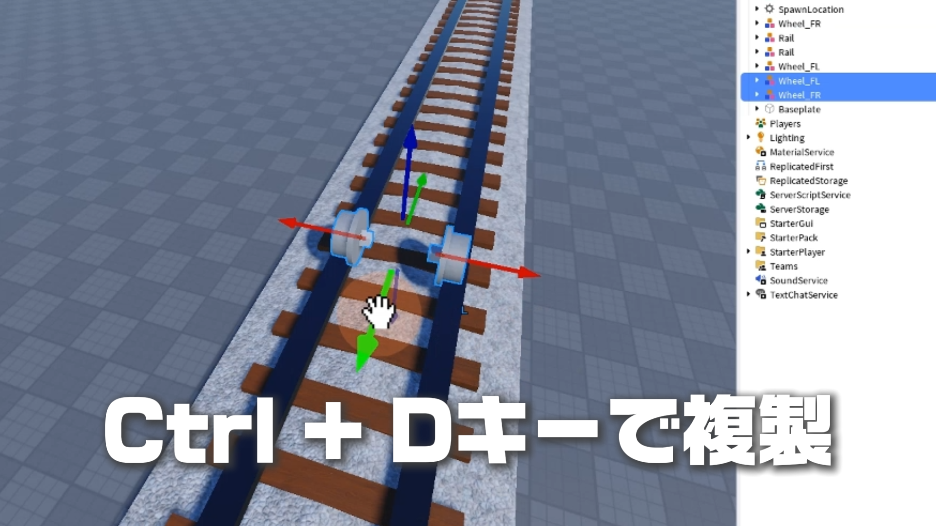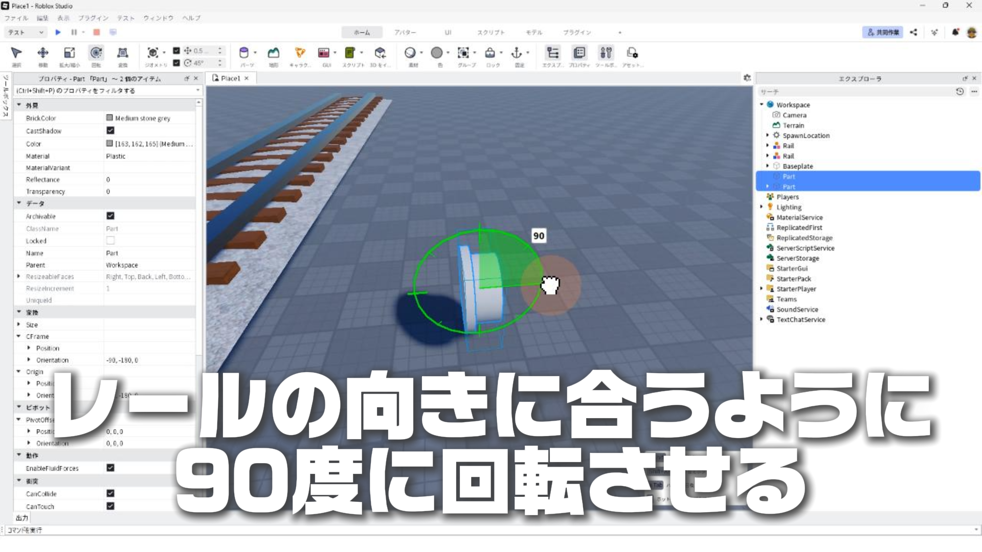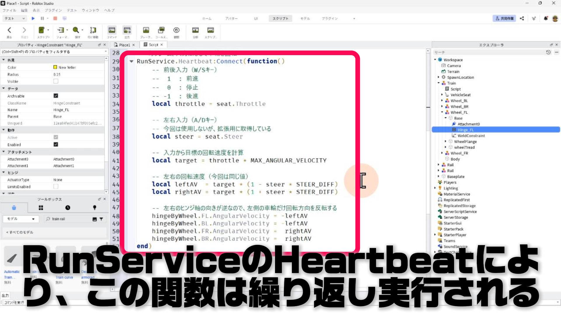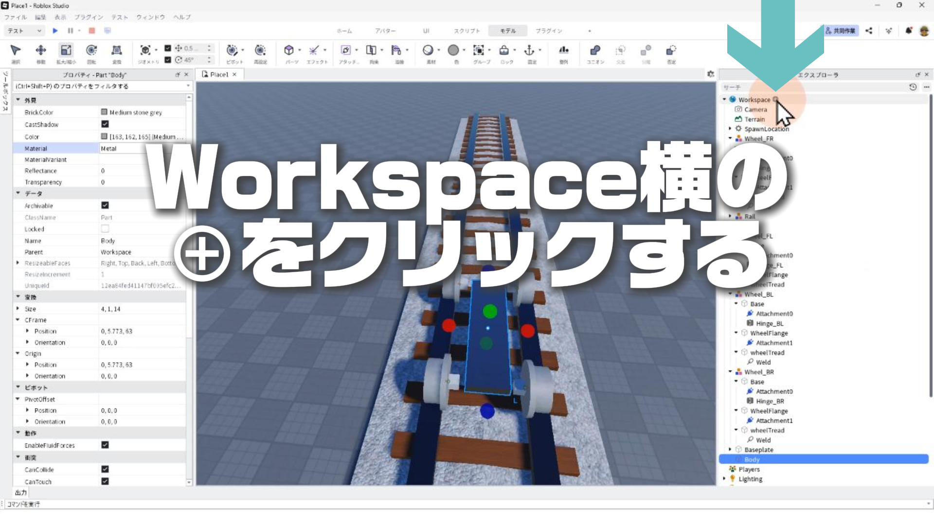 Roblox Studioでヒンジコンストレイント(HingeConstraint)を使い、車輪が回転してレールの上を前後に走るトロッコを制作します。