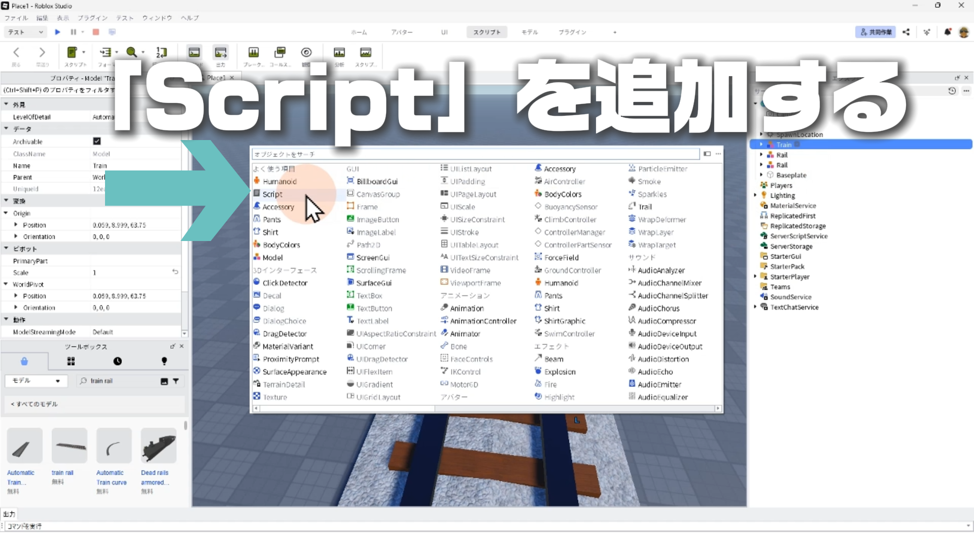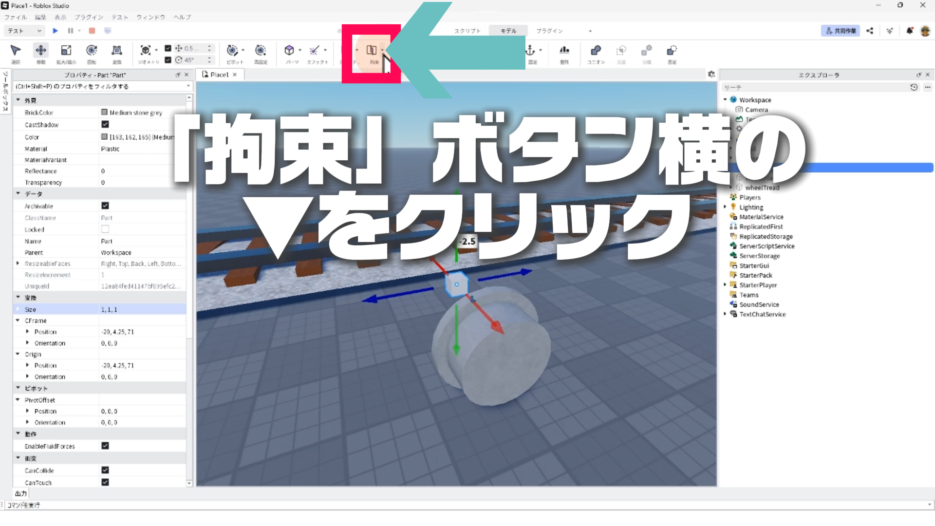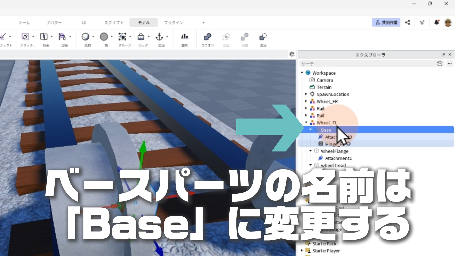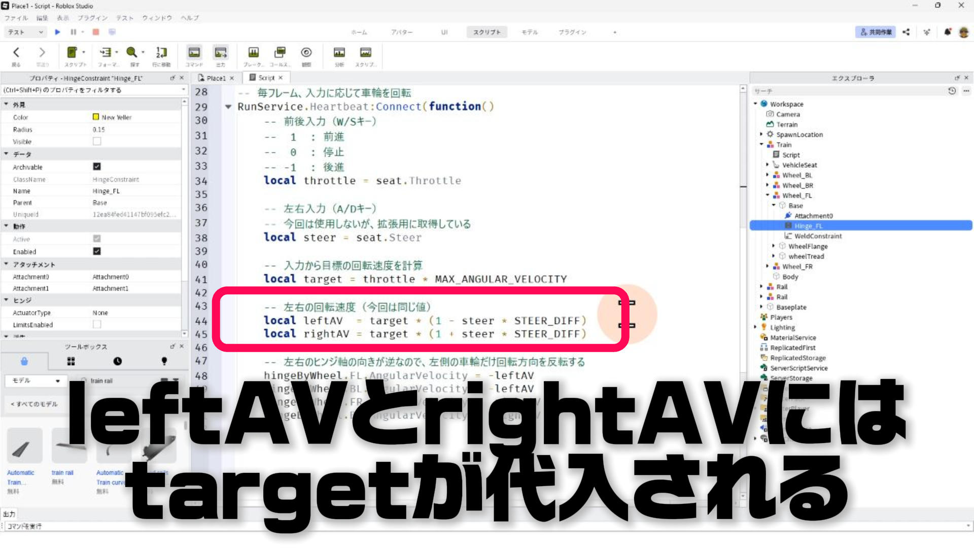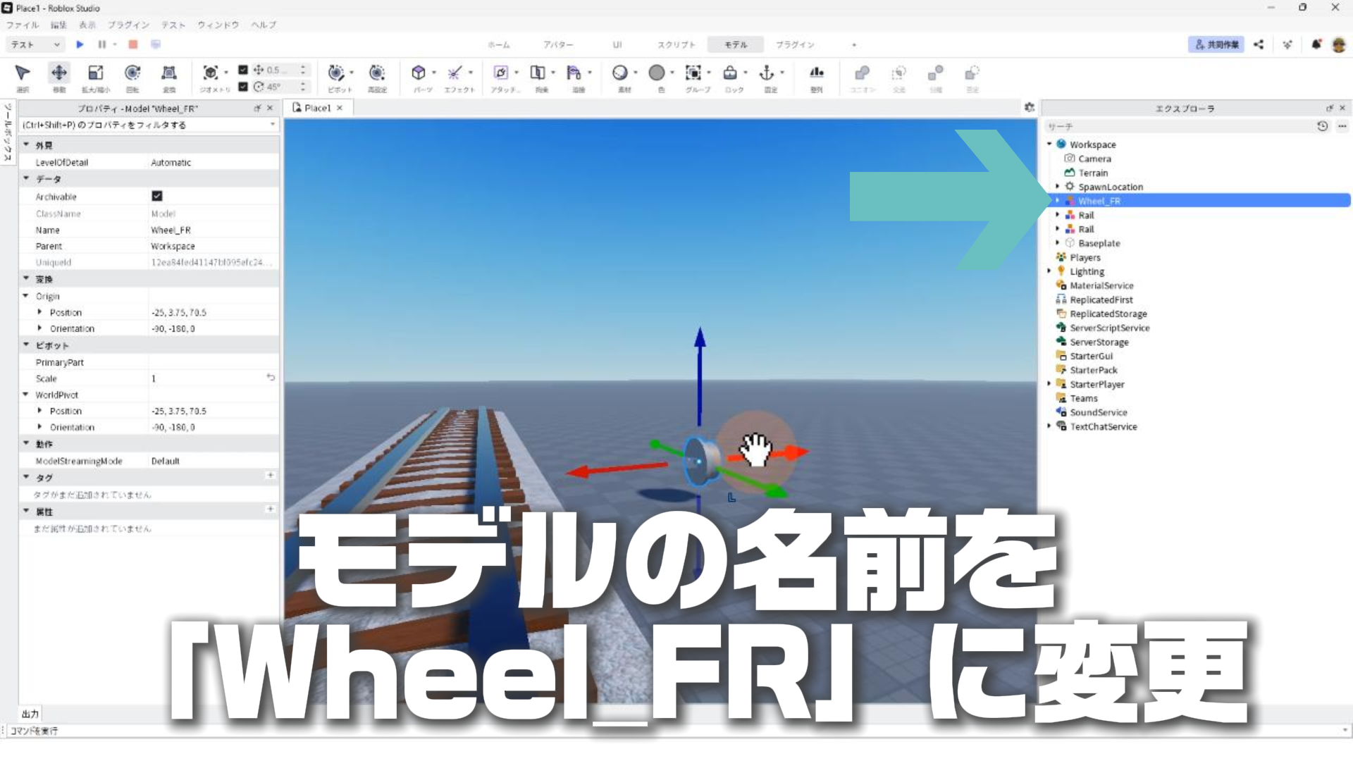 Roblox Studioでヒンジコンストレイント(HingeConstraint)を使い、車輪が回転してレールの上を前後に走るトロッコを制作します。