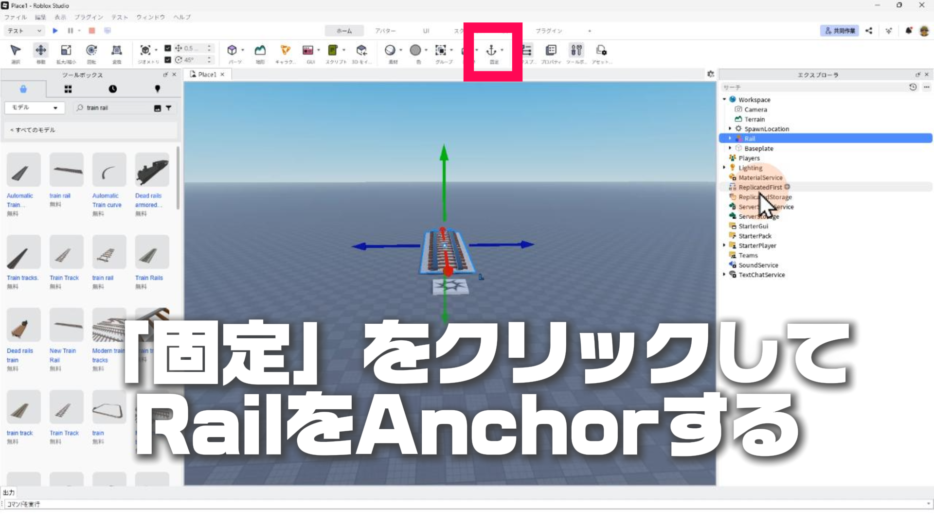 ※レールのようなパーツを選んで「固定(Anchor)」すると、テストプレイしたときに重力で落ちたり、他のパーツにぶつかって動いたりしなくなります。