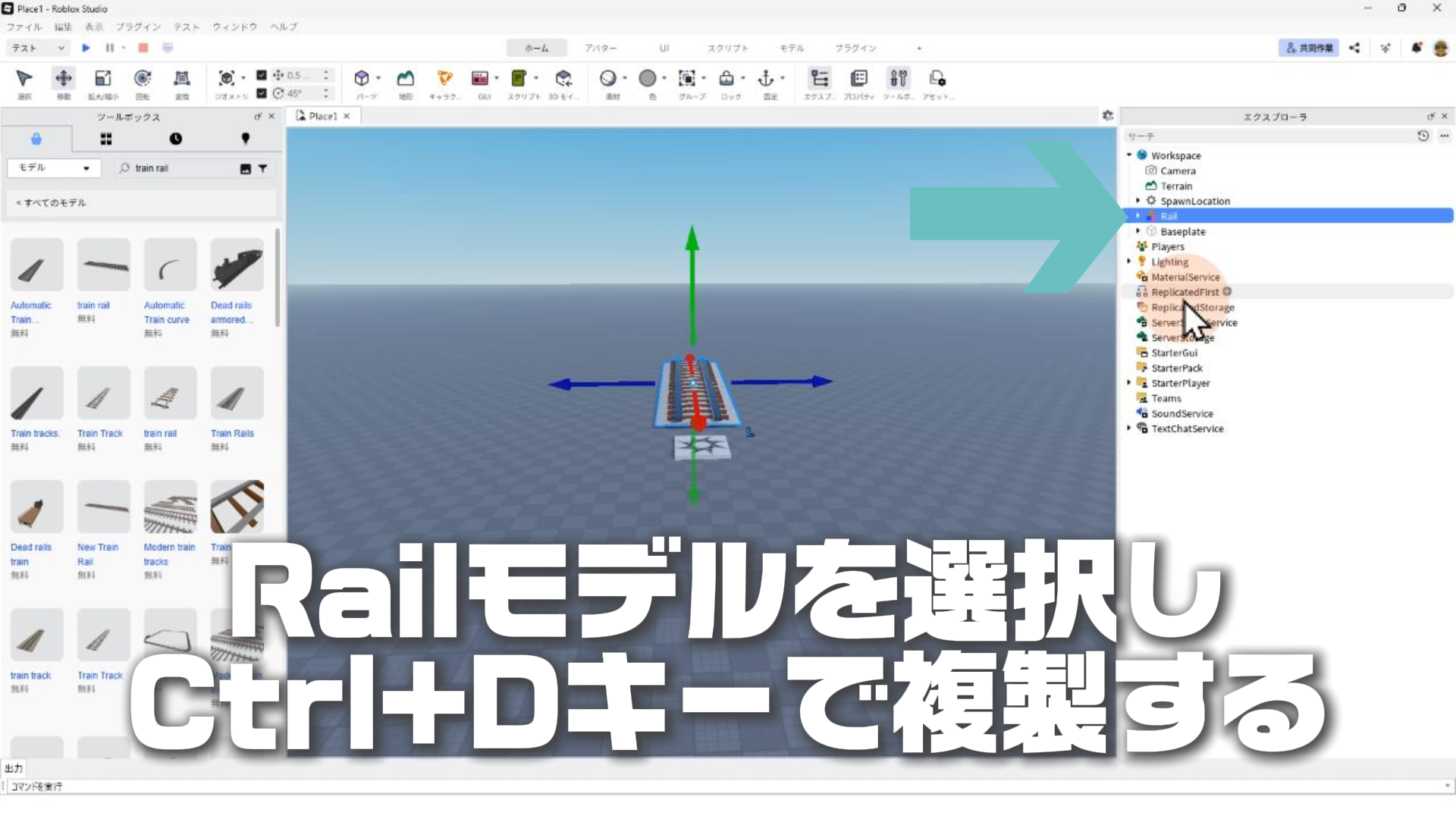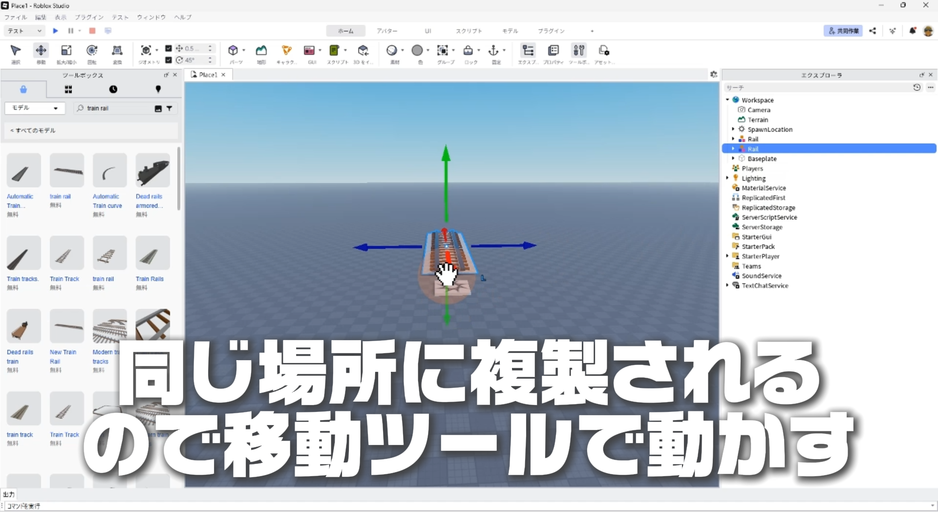 同じ場所かレールの真上に「Rail」が複製されるので、「ホーム」タブの「移動」ツールで動かす