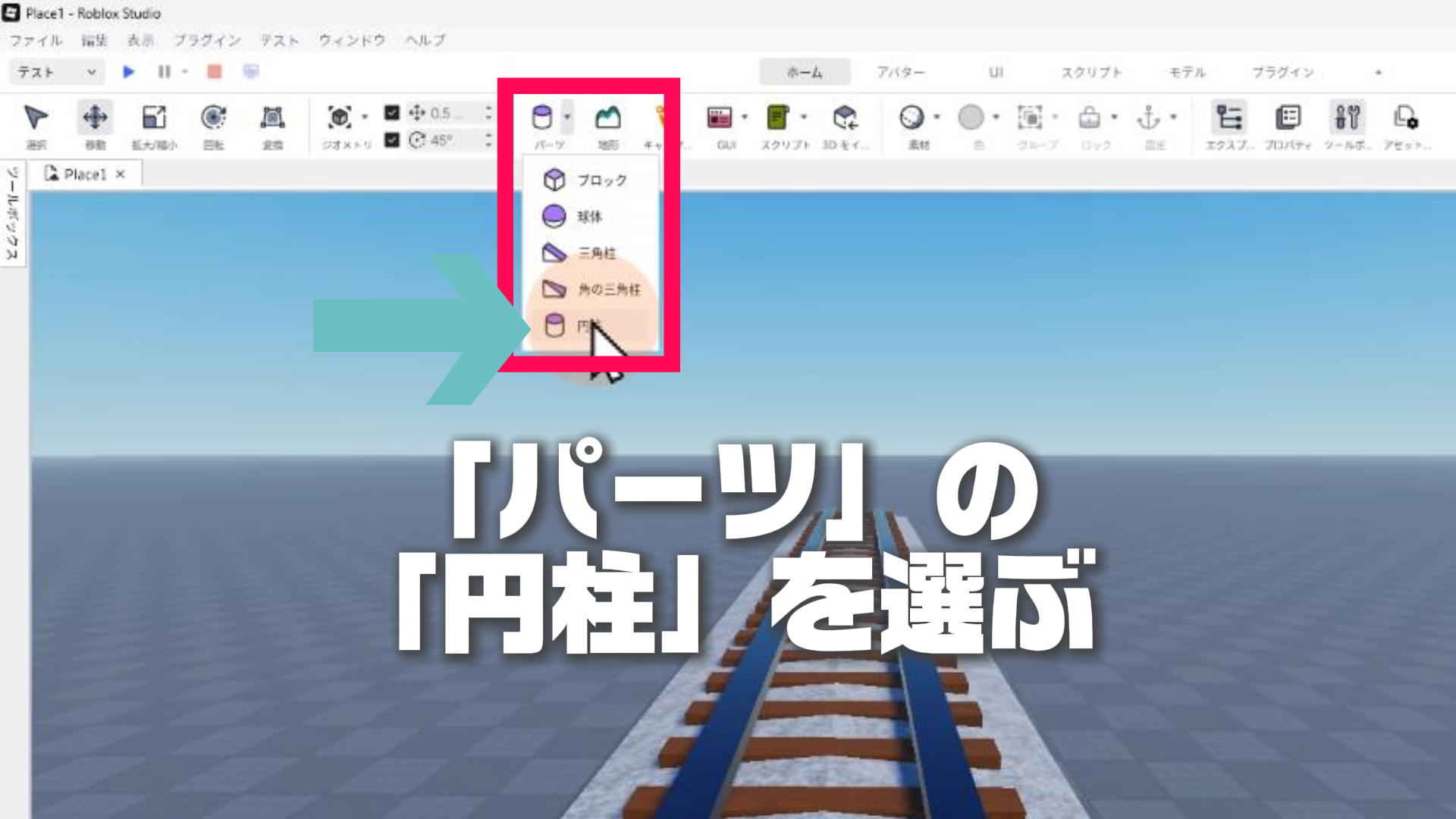※「パーツ」横の▼をクリックすると、ドロップダウンメニューが表示されるので、メニューから「円柱」のパーツを選んで下さい。