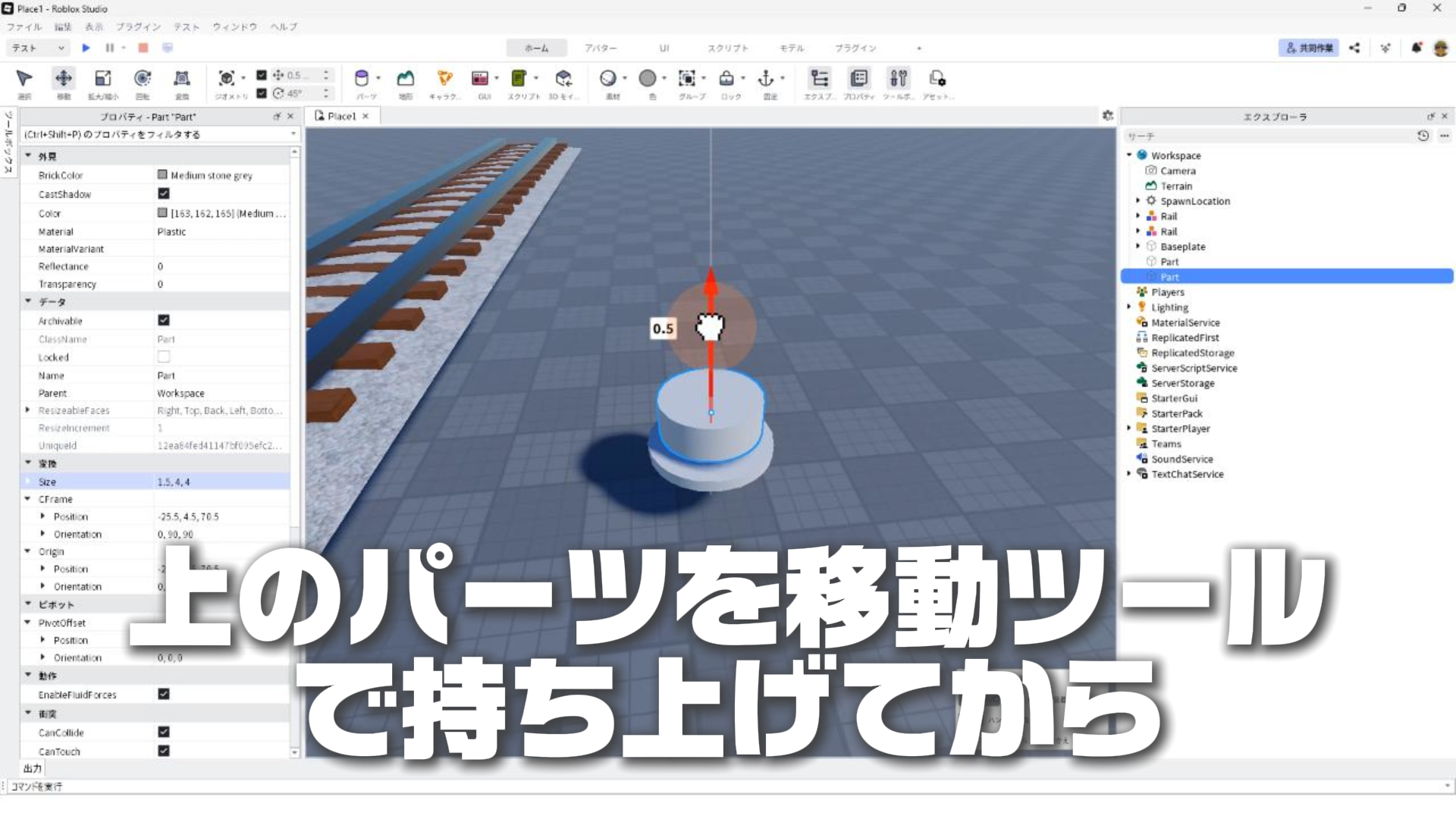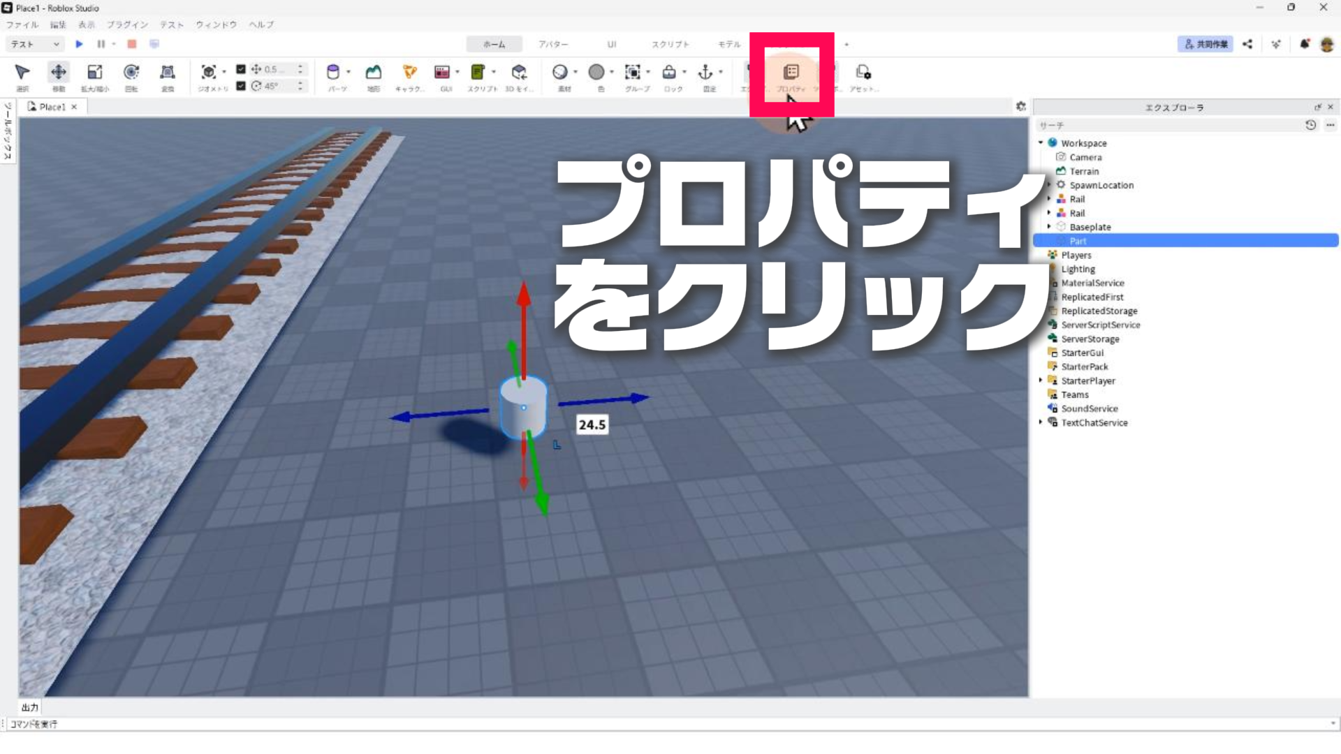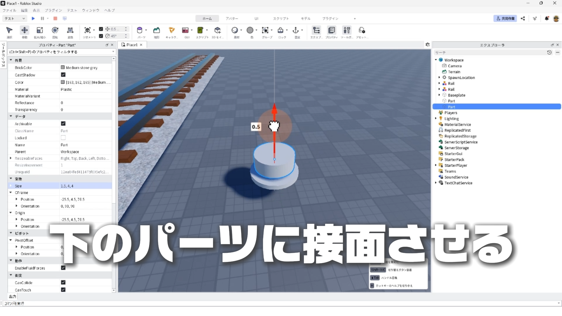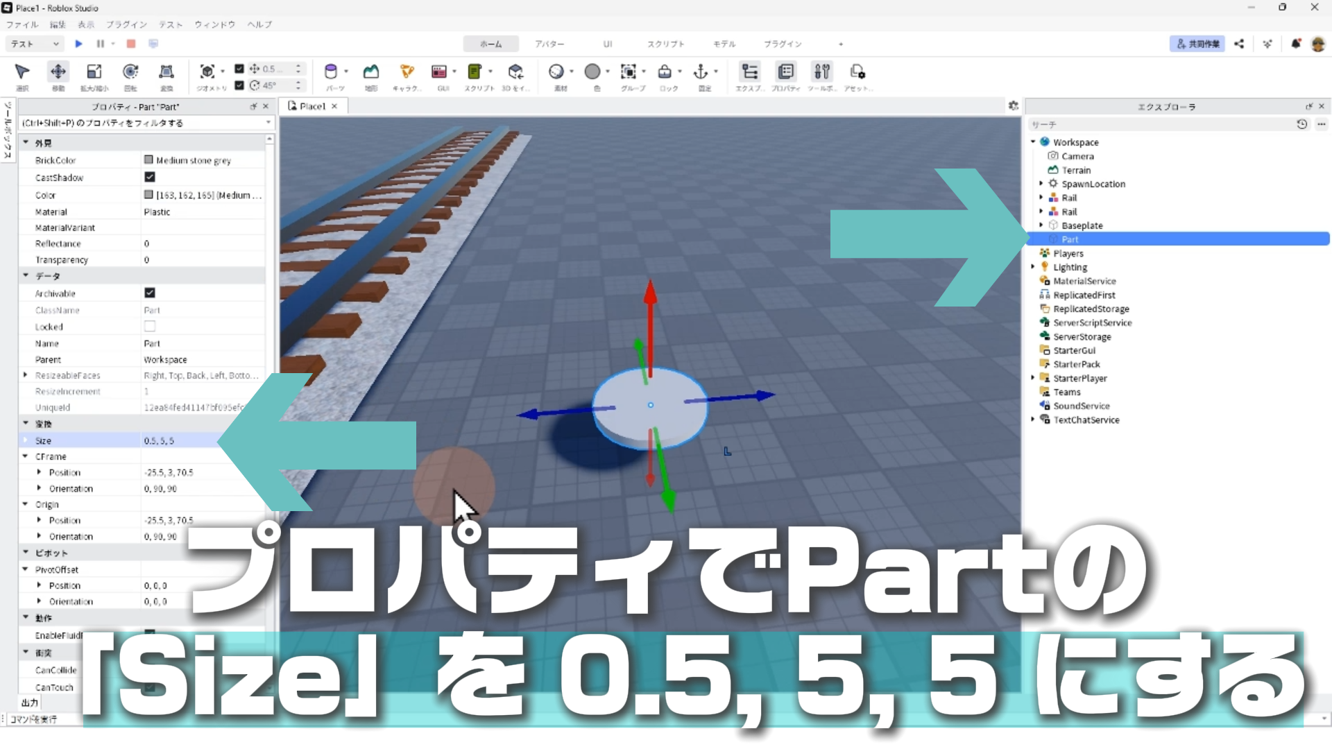 ※「Part(円柱)」を選んだ状態で、「プロパティ」ウィンドウの「Size」の横にある数値をクリックし、「0.5, 5, 5」と入力してEnterキーを押してください。直径5スタッド、厚さ0.5スタッドの円柱に形が変わります。