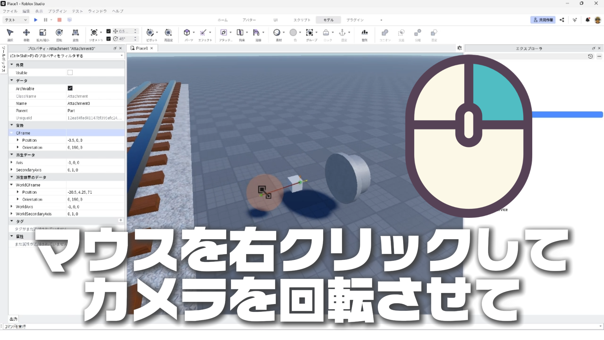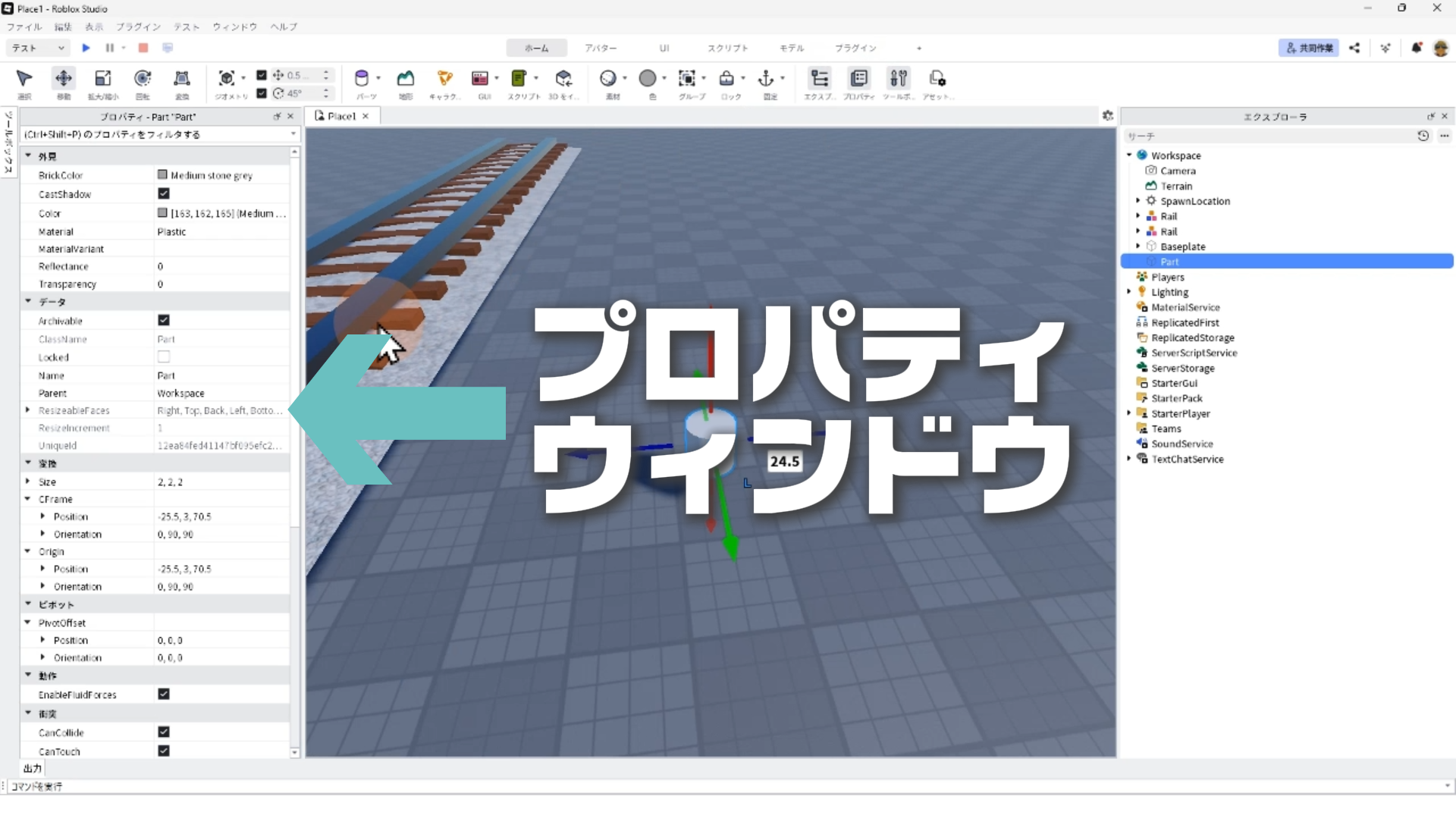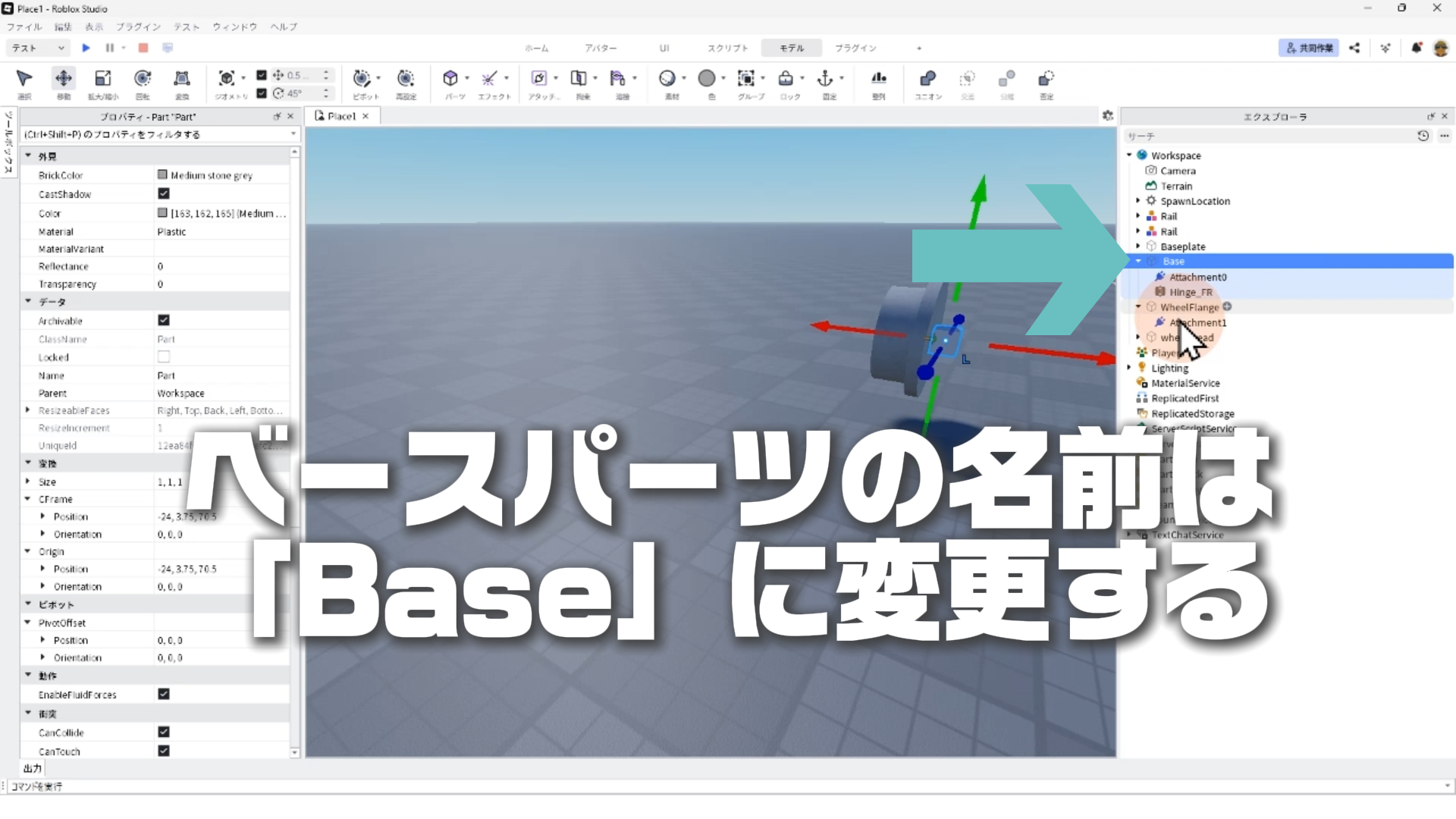 ※Partの名前は、エクスプローラの対象Partを右クリックして表示されるメニューから「名前を変更」を選んで変更して下さい。「プロパティ」ウィンドウの「データ」ー「Name」の横の欄をクリックして変更することも可能です。