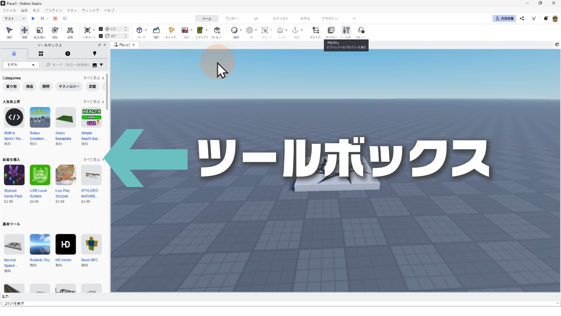 パーツがワークスペースに追加されたら、「ホーム」タブの「プロパティ」ボタンをクリック