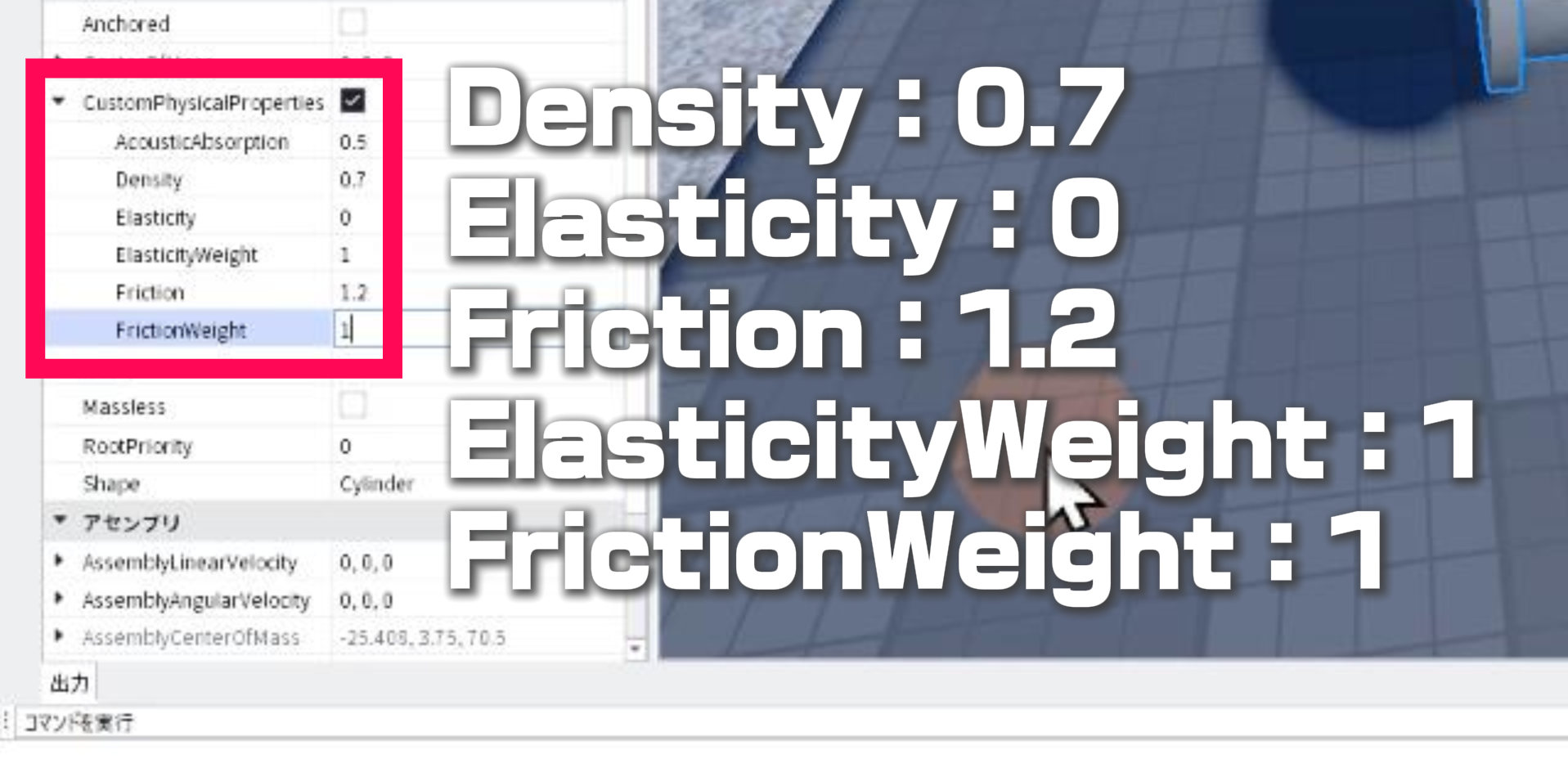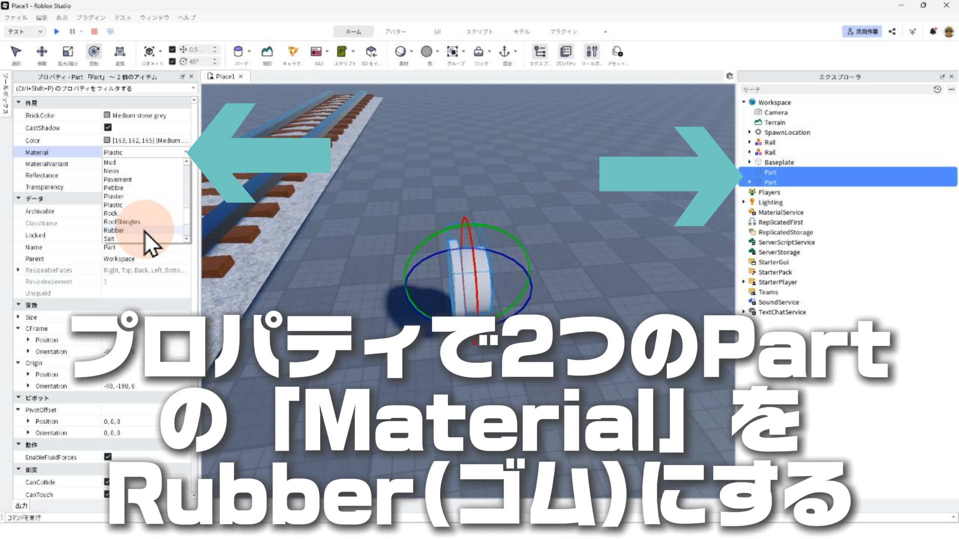 「プロパティ」で2つのPartの「Material(素材)」を「Rubber(ゴム)」に設定する