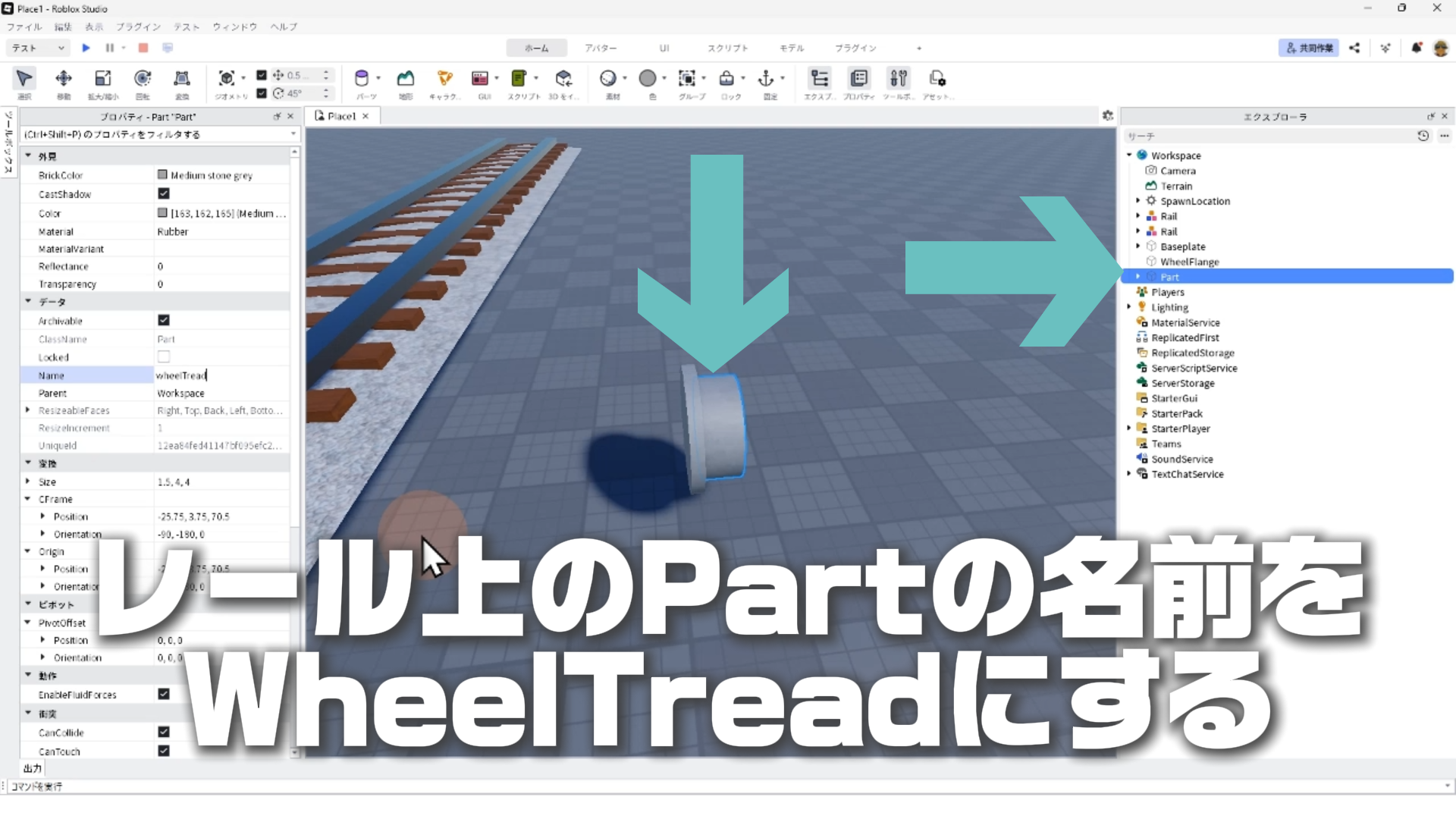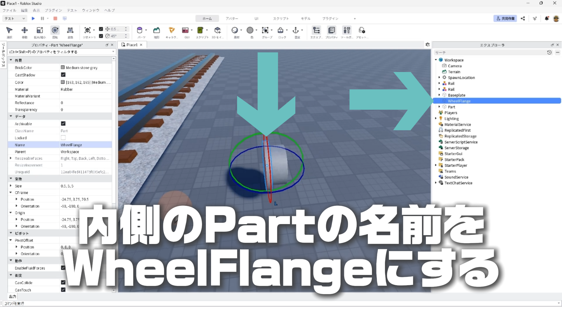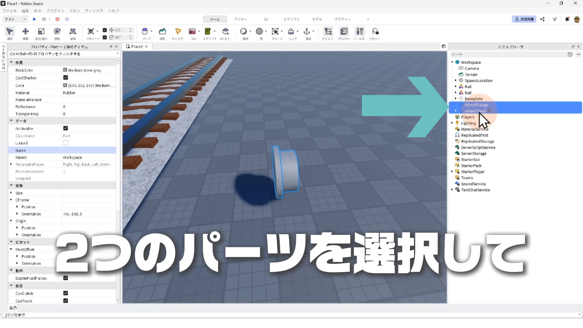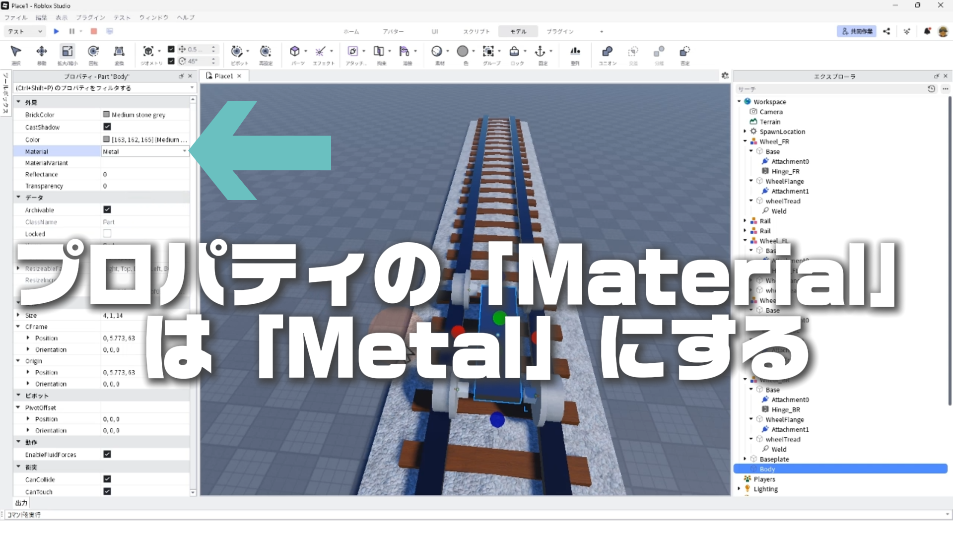 ※現実の世界では車輪は「金属」ですが、Robloxの標準設定の「Metal(金属)」は摩擦が少なく、とても滑りやすい性質があります。そのままだと車輪がレールの上で空回りして進まなくなってしまうため、ここではしっかりとレールをつかむことができる「Rubber(ゴム)」に設定します。