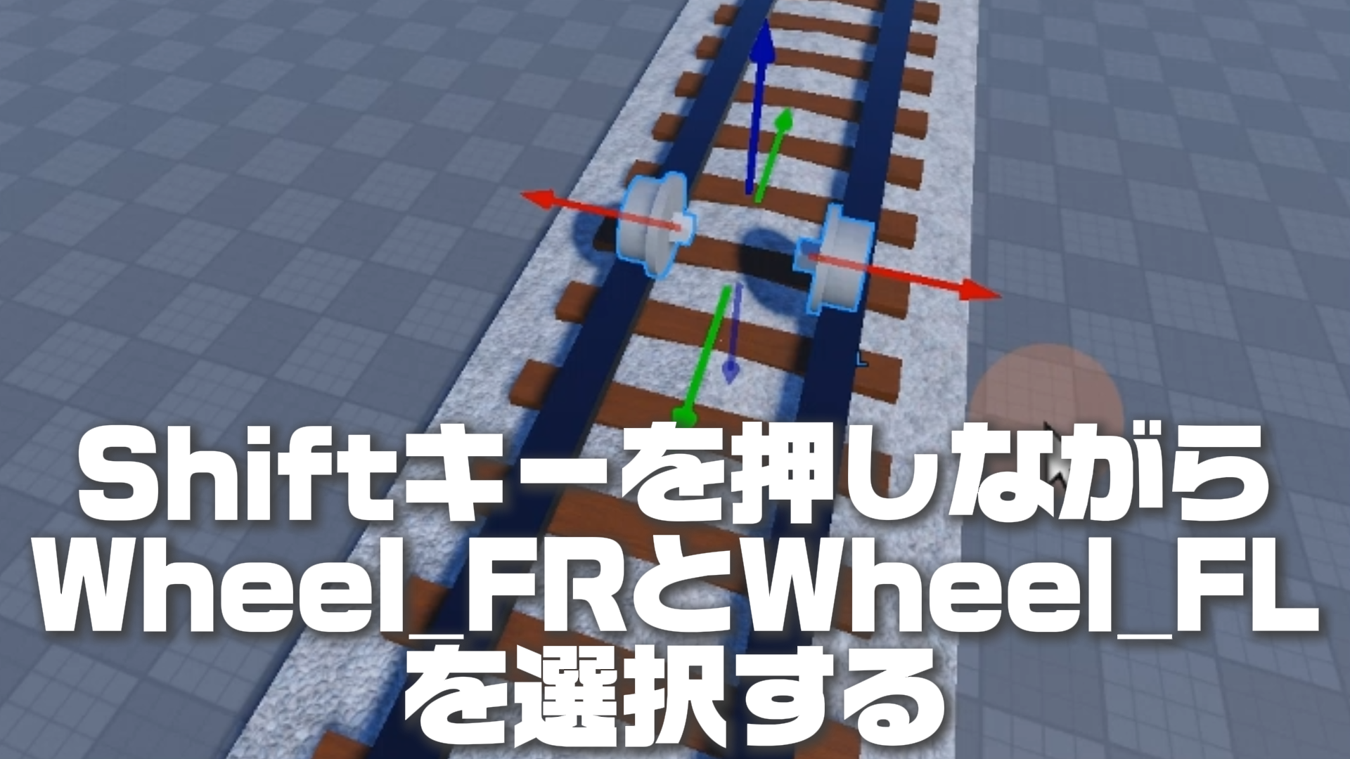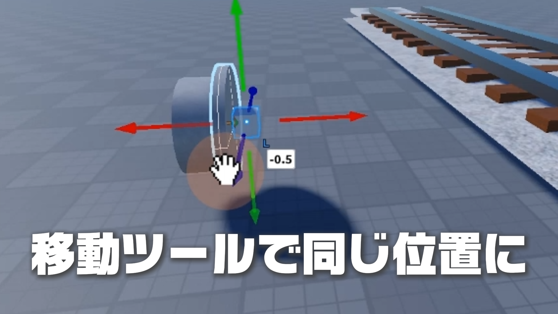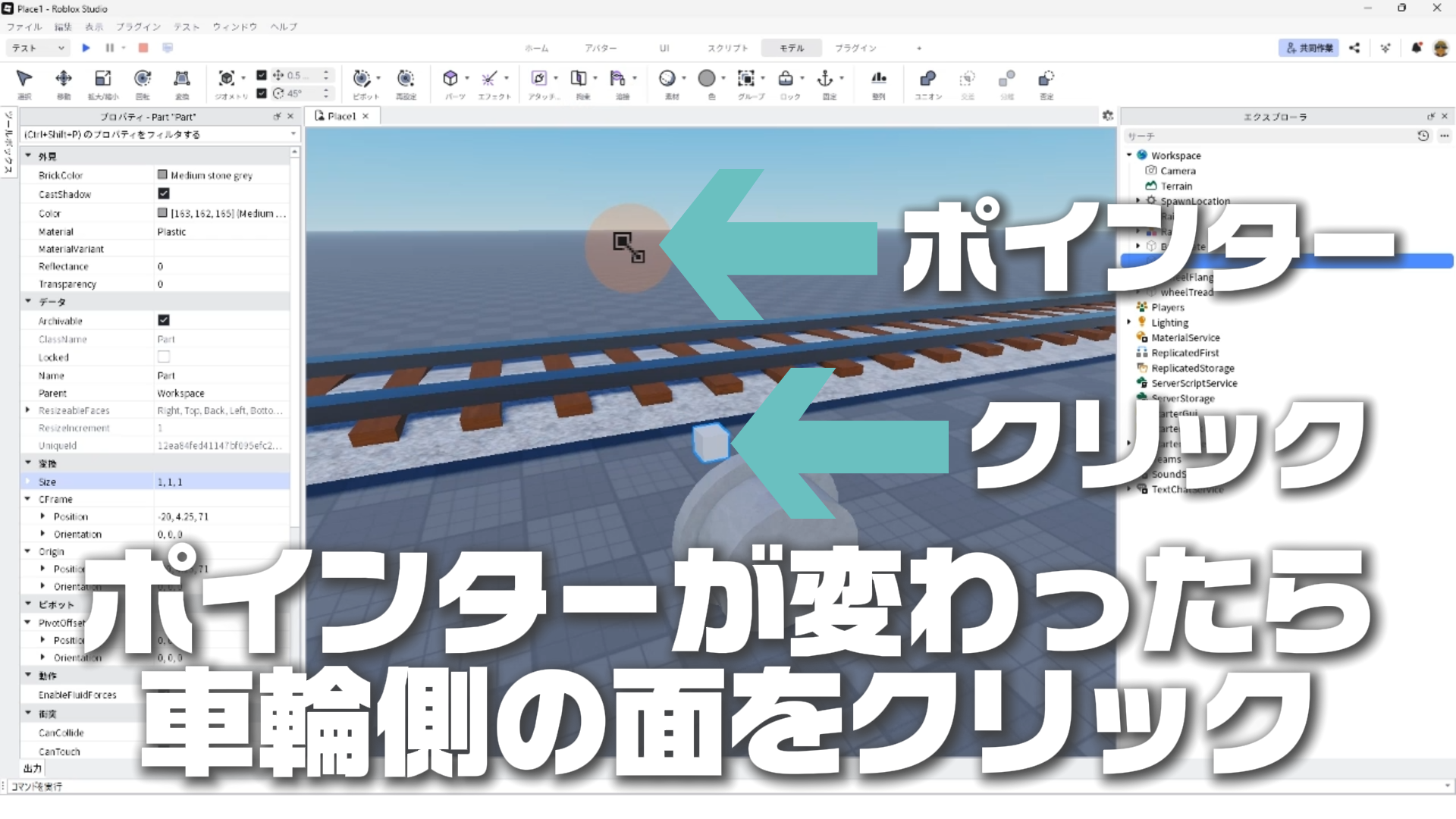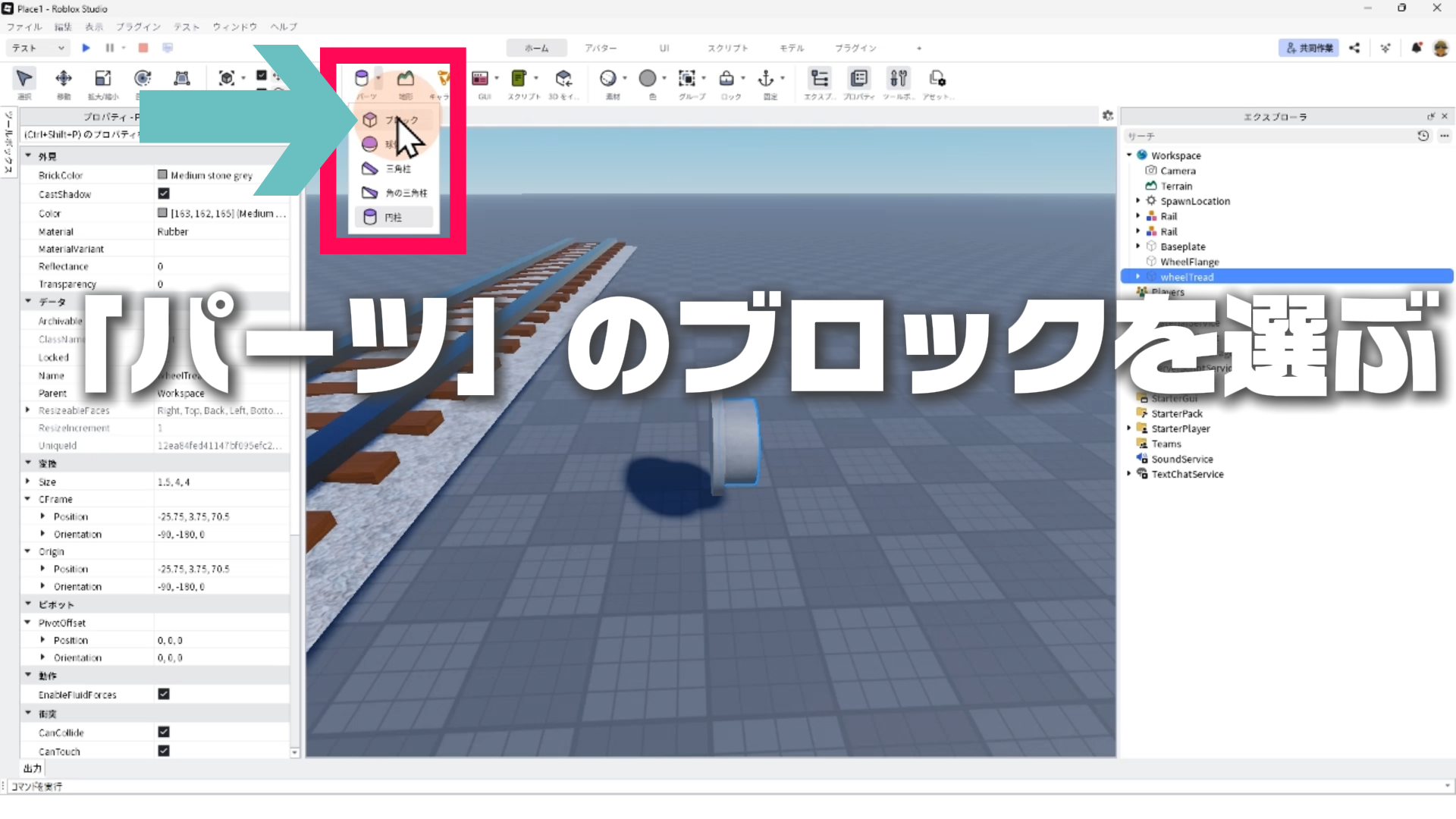 ※現実の世界では車輪は「金属」ですが、Robloxの標準設定の「Metal(金属)」は摩擦が少なく、とても滑りやすい性質があります。そのままだと車輪がレールの上で空回りして進まなくなってしまうため、ここではしっかりとレールをつかむことができる「Rubber(ゴム)」に設定します。