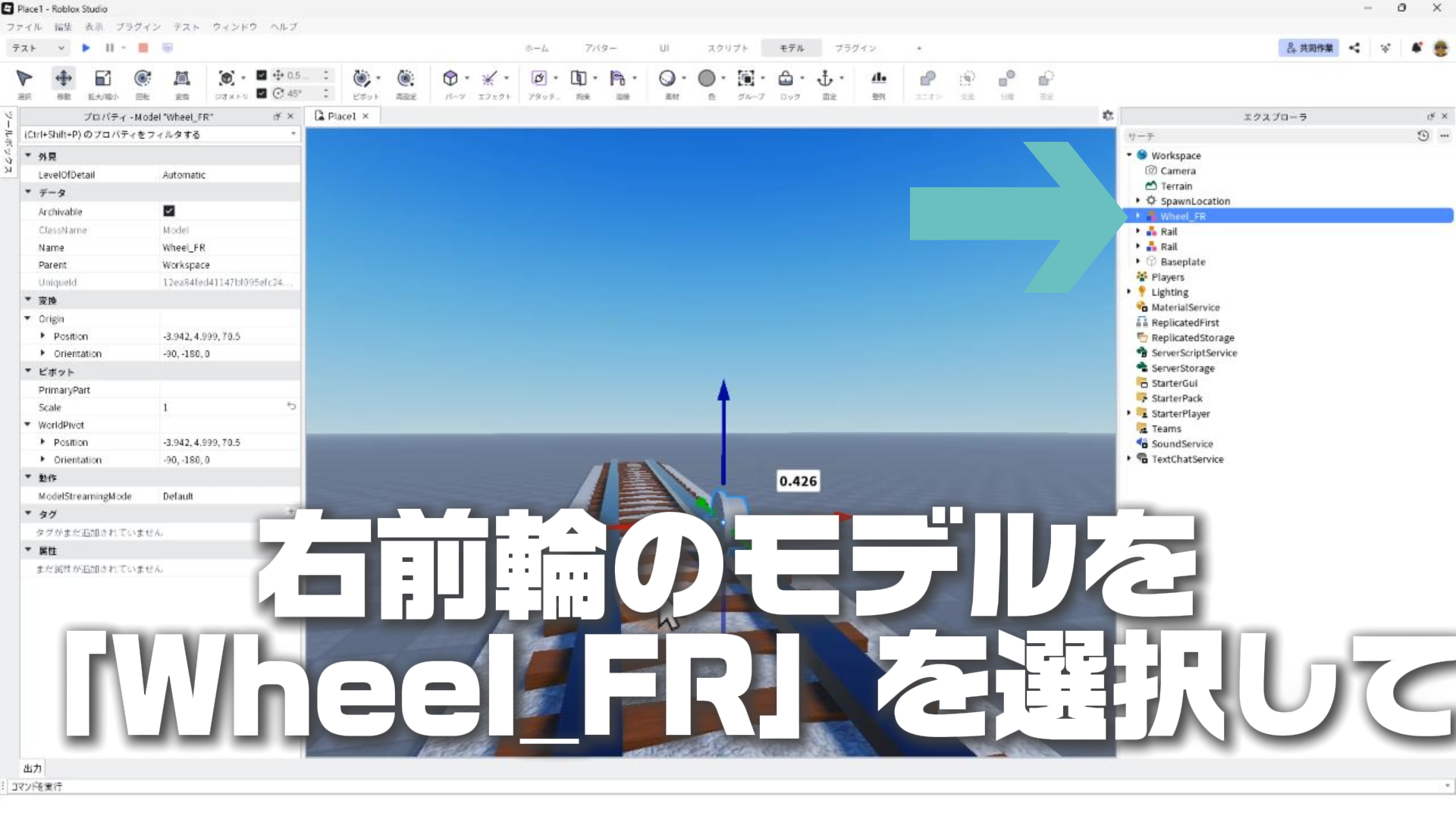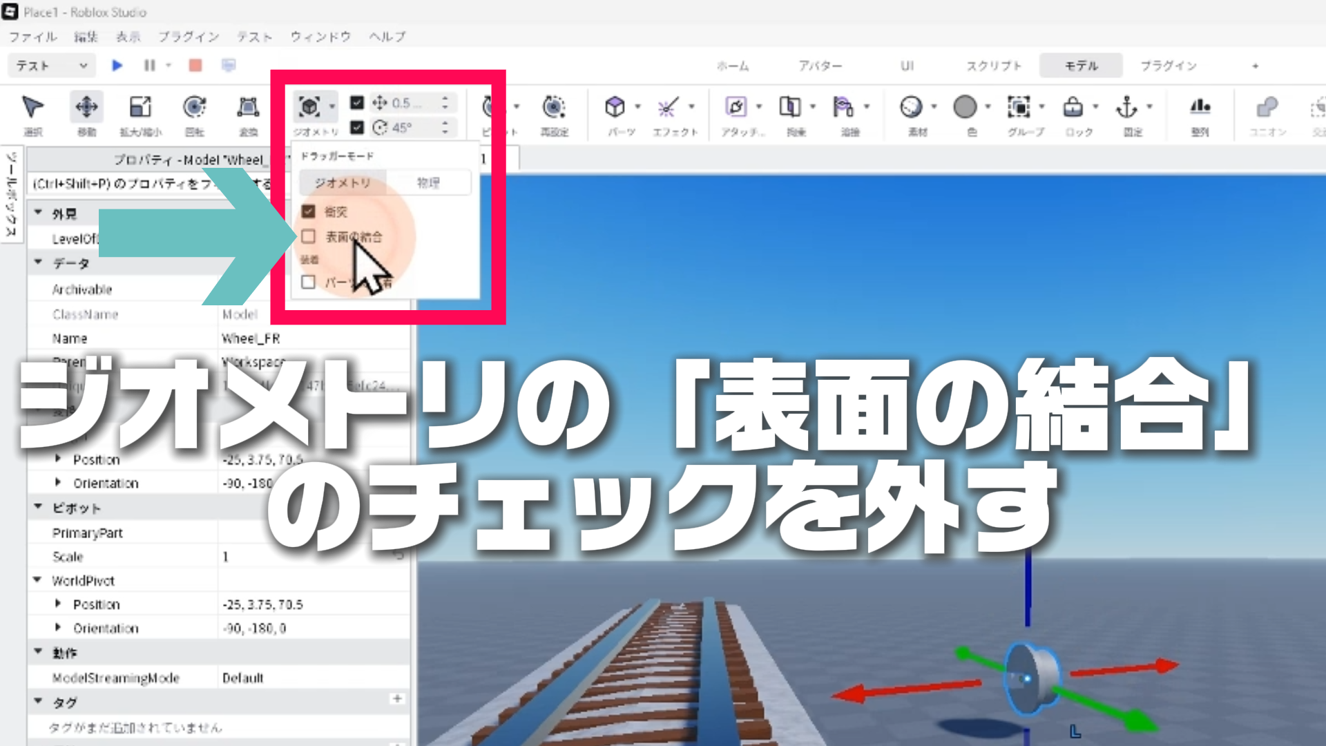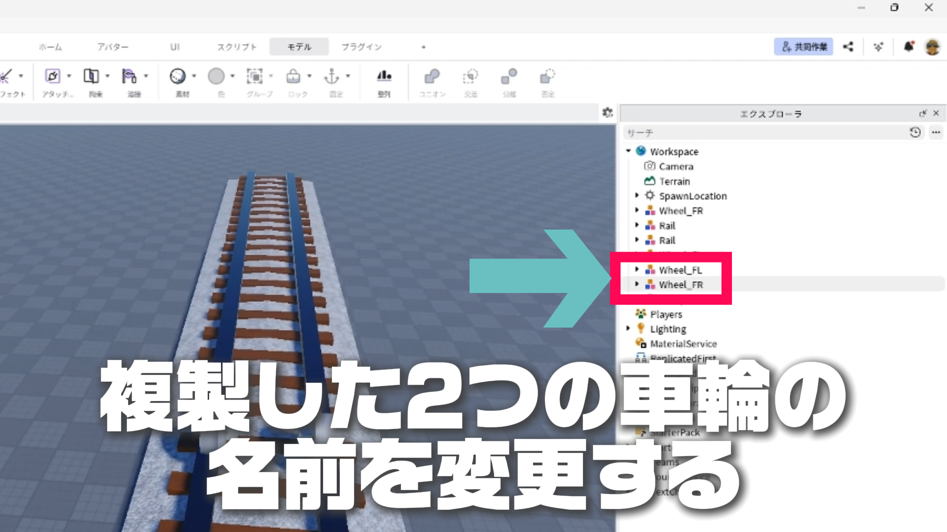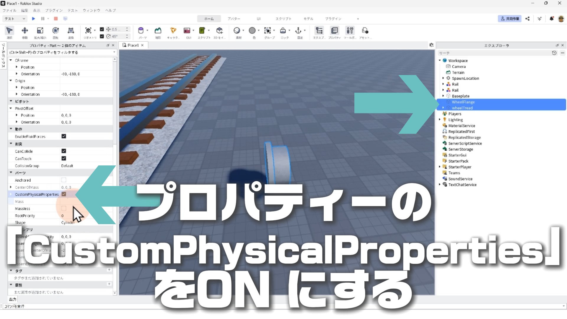 ※現実の世界では車輪は「金属」ですが、Robloxの標準設定の「Metal(金属)」は摩擦が少なく、とても滑りやすい性質があります。そのままだと車輪がレールの上で空回りして進まなくなってしまうため、ここではしっかりとレールをつかむことができる「Rubber(ゴム)」に設定します。