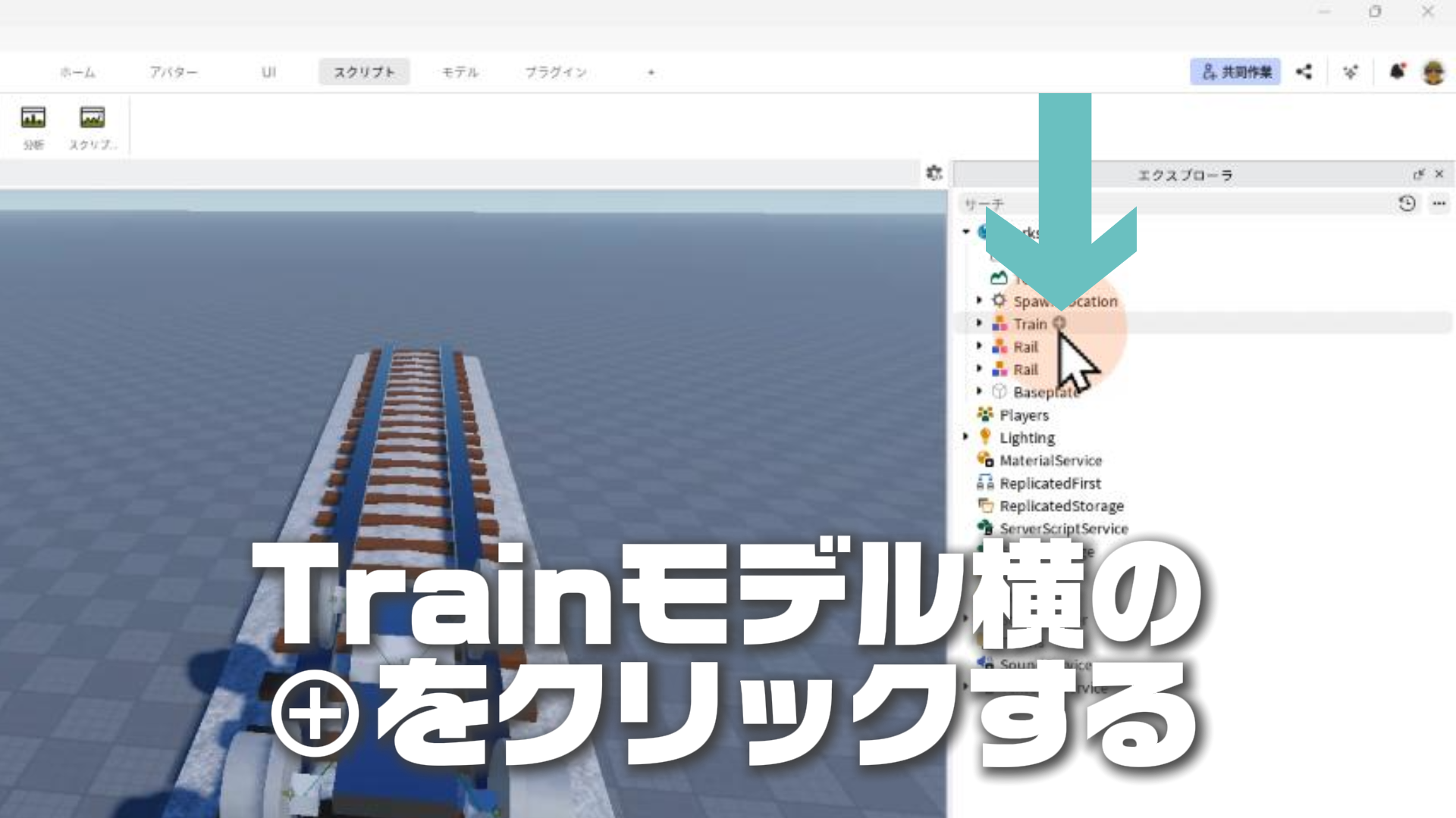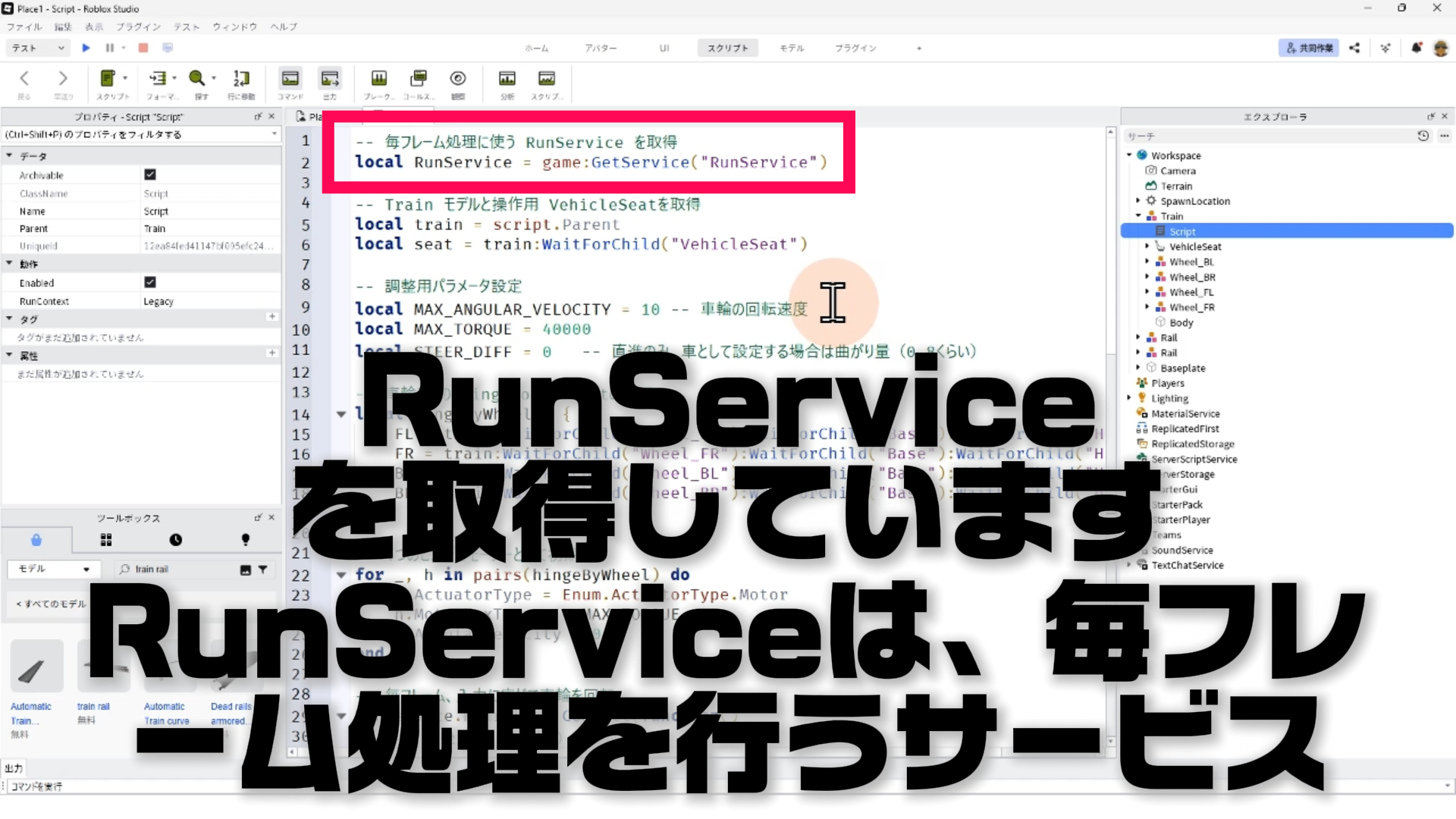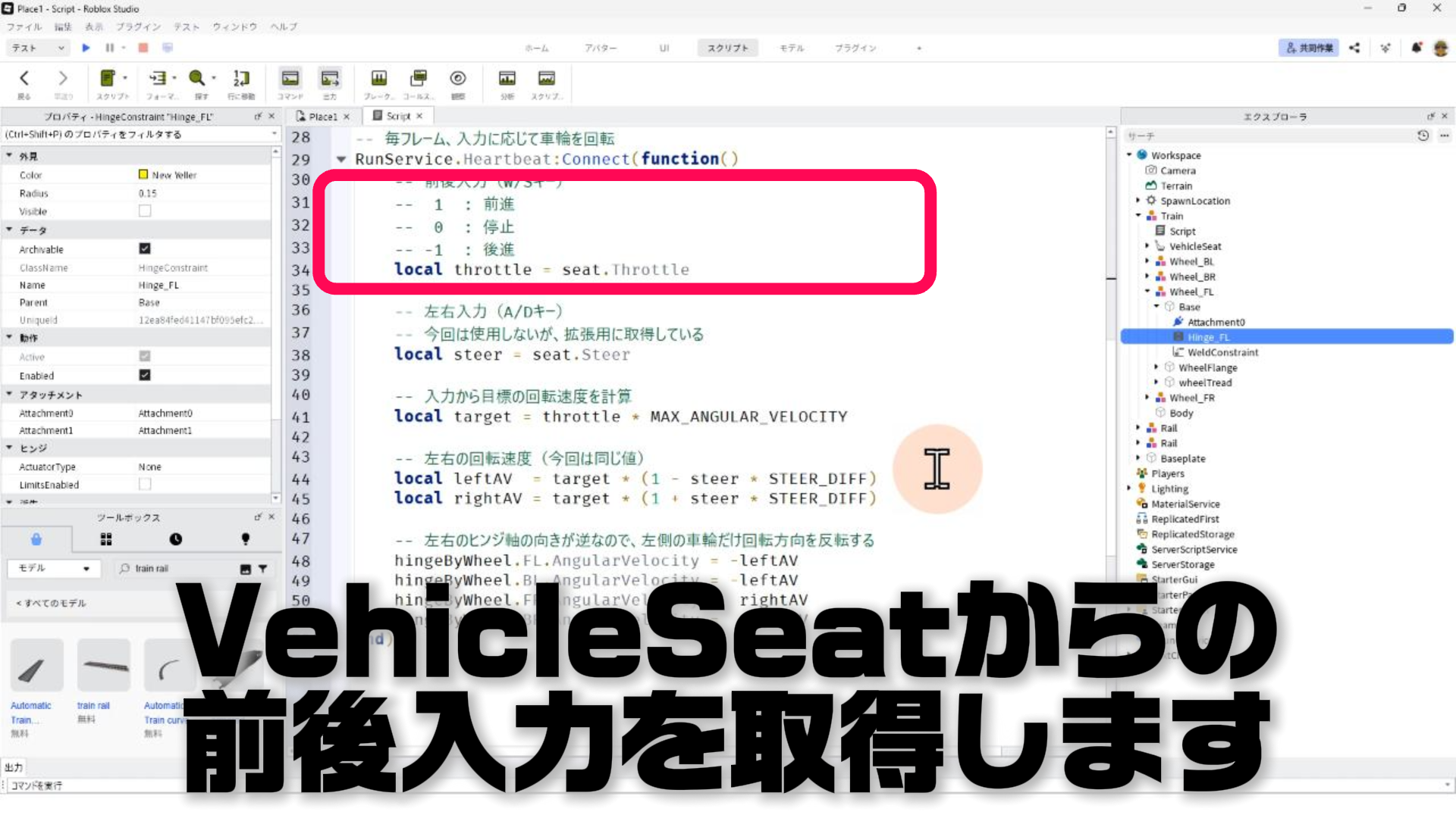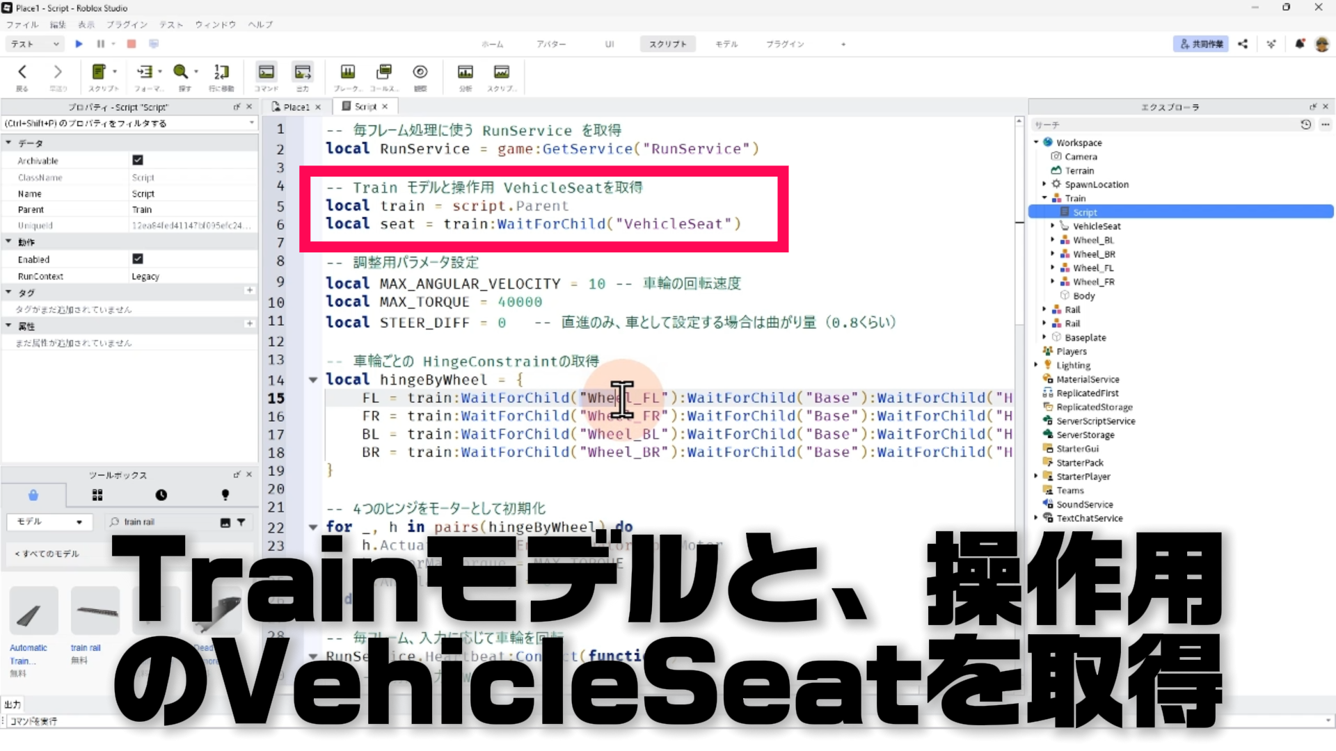 ※ここまで作ったTrainモデルと、Trainモデル内のVehicleSeatをスクリプト内で使えるようにしています。