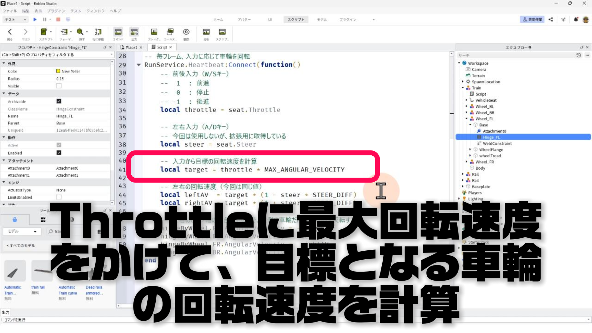 車輪の作り方から、ヒンジの設定、摩擦や密度の考え方、VehicleSeatを使った操作方法まで、実際に車輪が回って動く仕組みを作りながら解説しています。