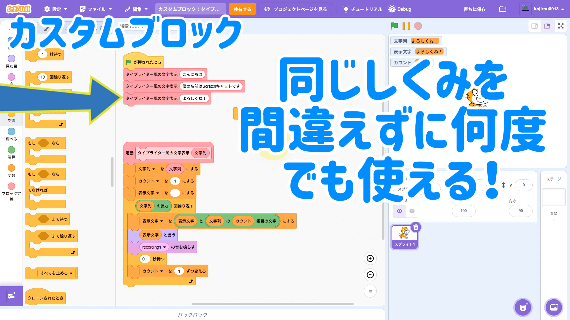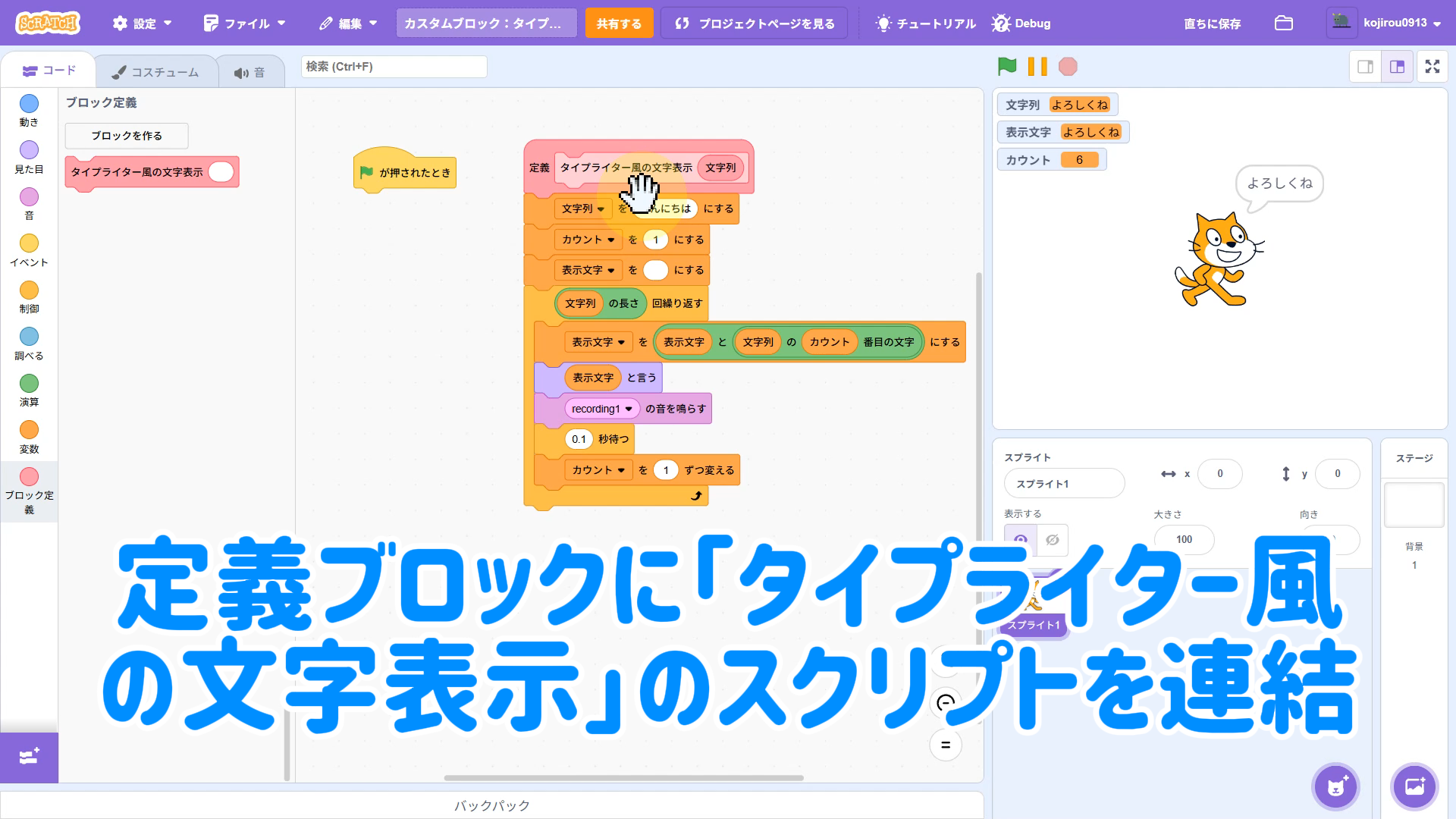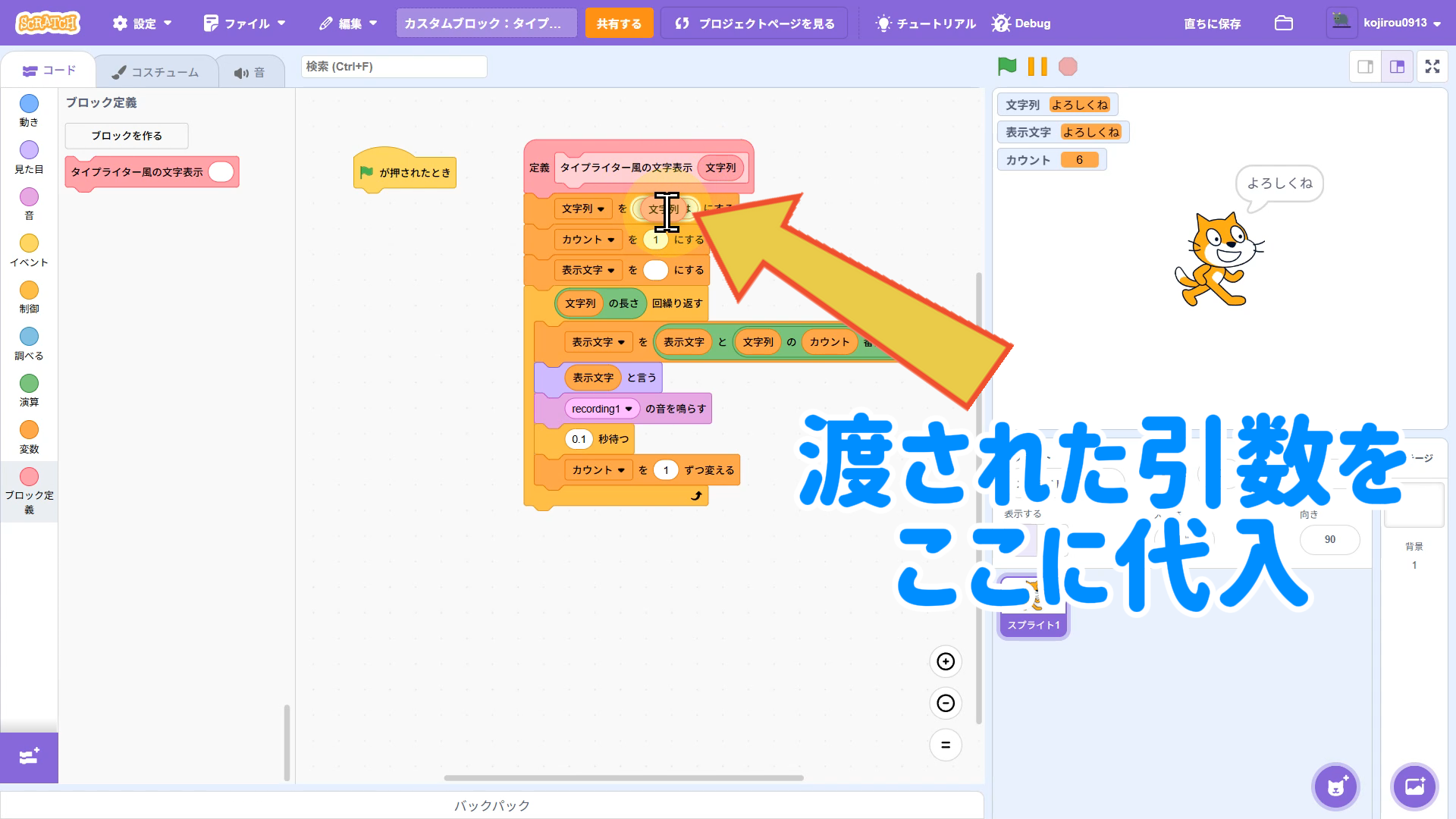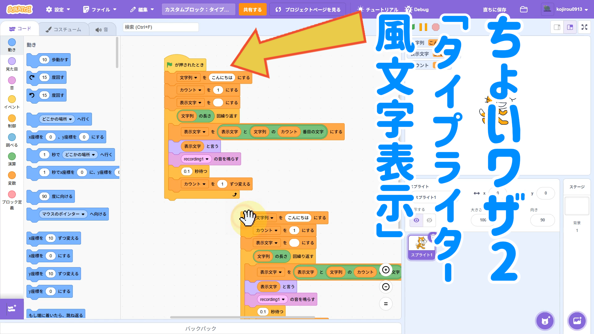 【Scratchちょいワザ集③】引数ありカスタムブロックでスッキリ!タイプライター風文字表示を関数化しよう!
