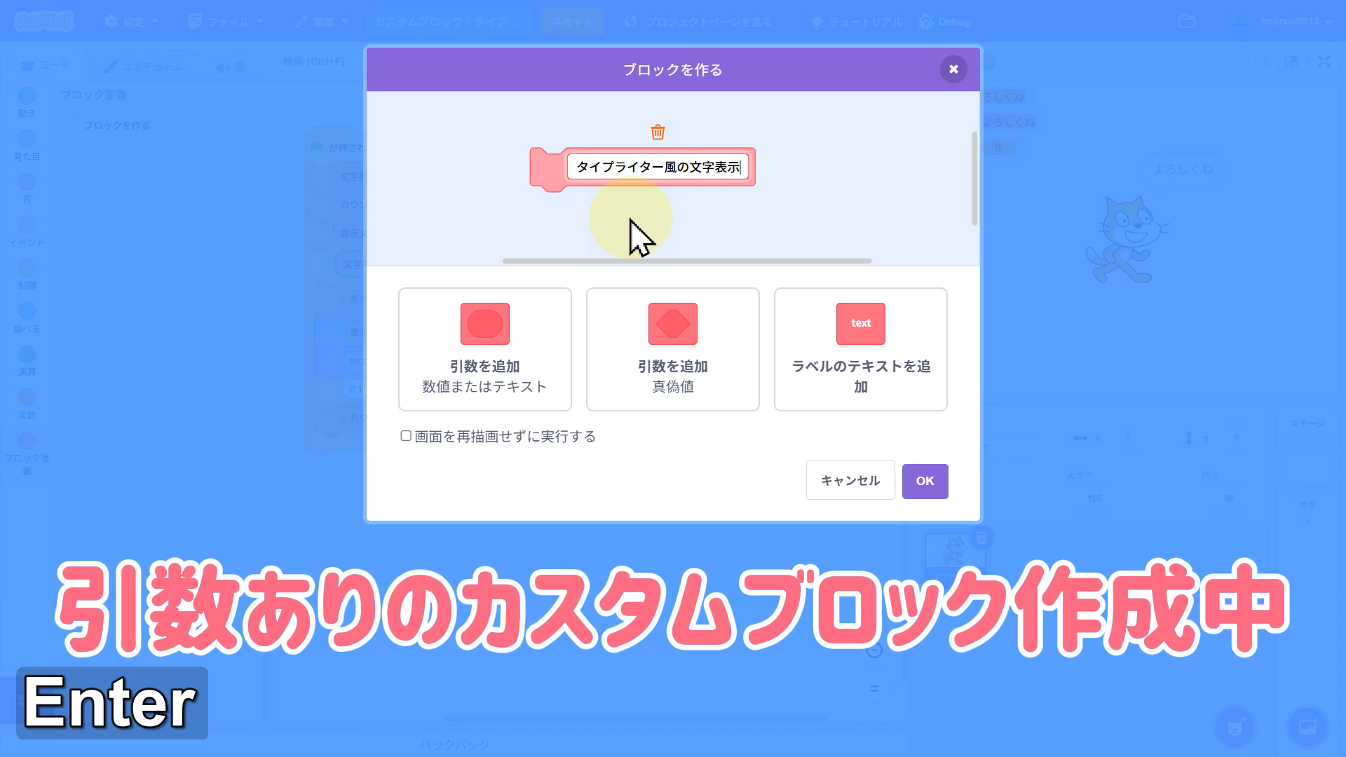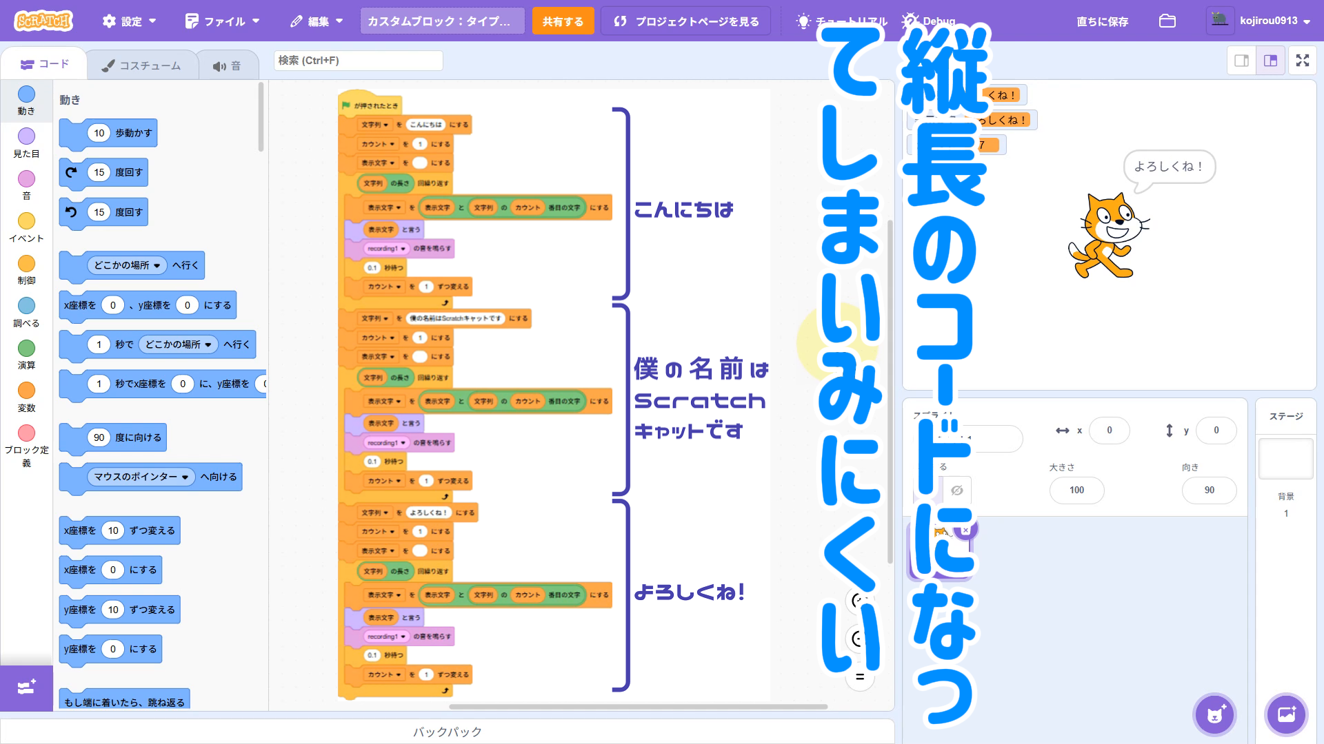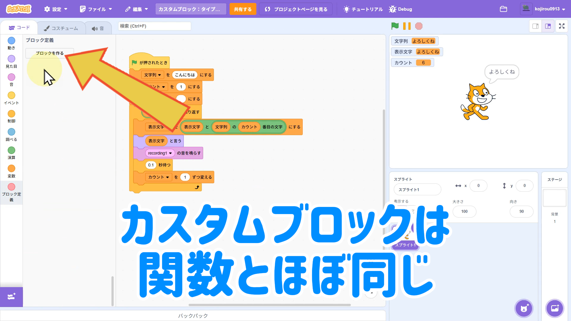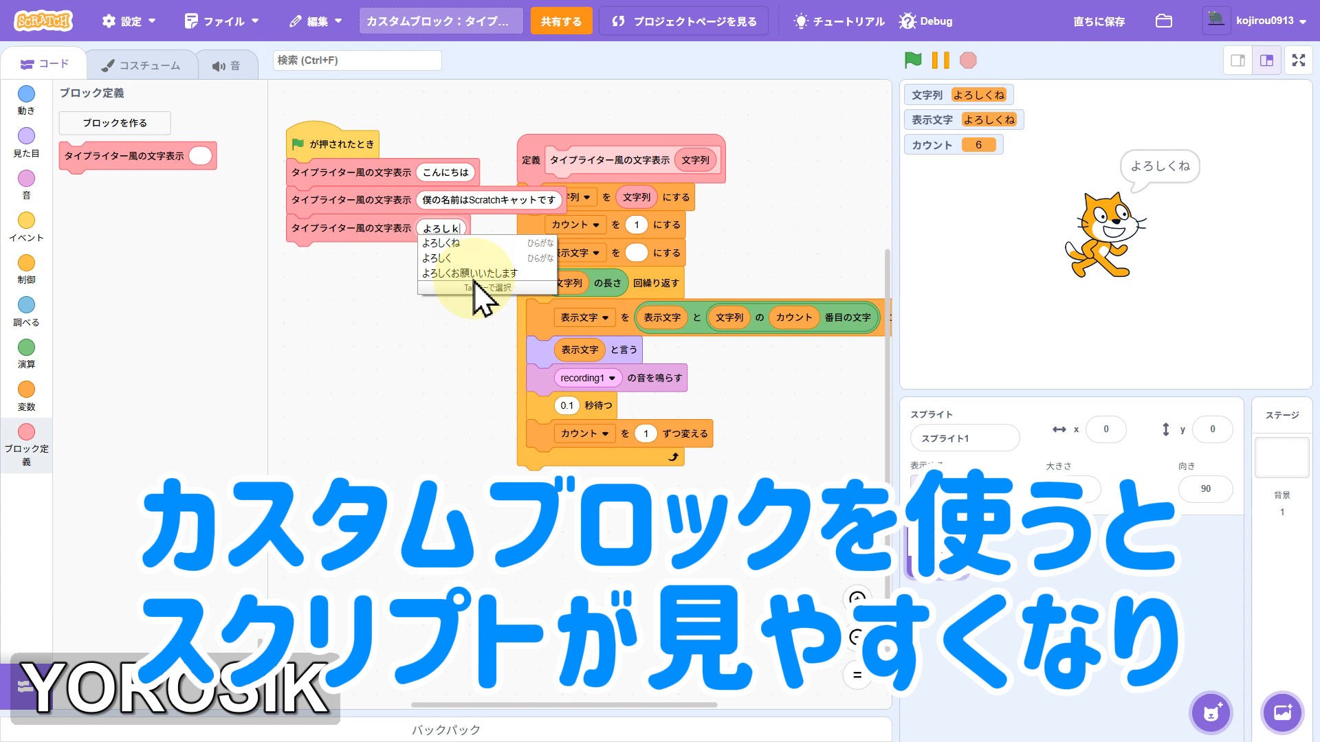 【Scratchちょいワザ集③】引数ありカスタムブロックでスッキリ!タイプライター風文字表示を関数化しよう!