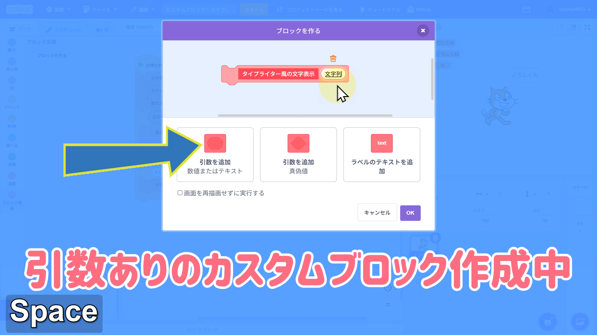 ※Scratchのカスタムブロックは、数値やテキストの受け渡しができる引数、真偽値の受け渡しができる引数、ラベルのテキストを追加設定できます。